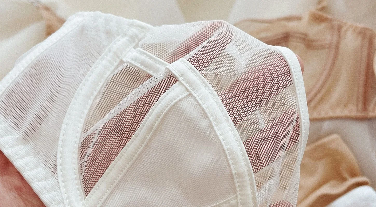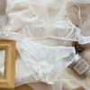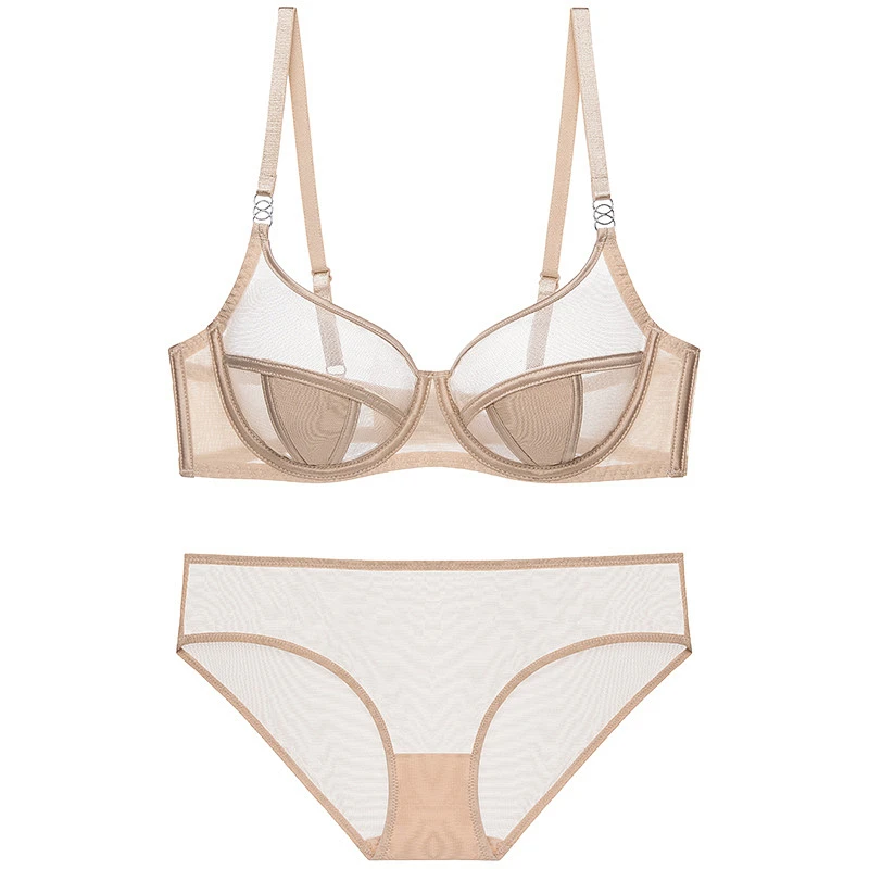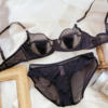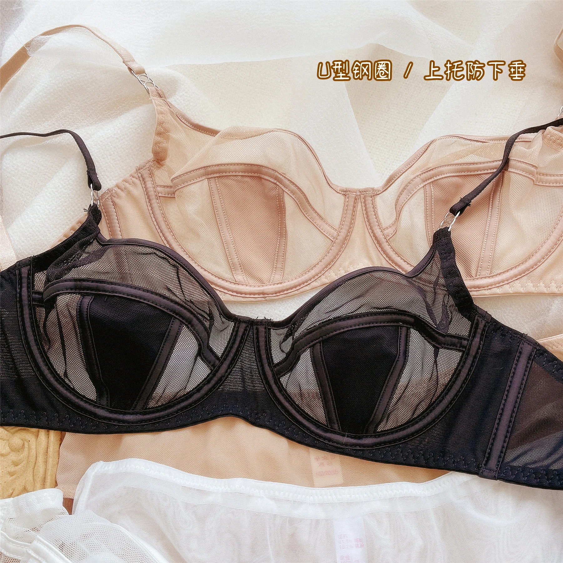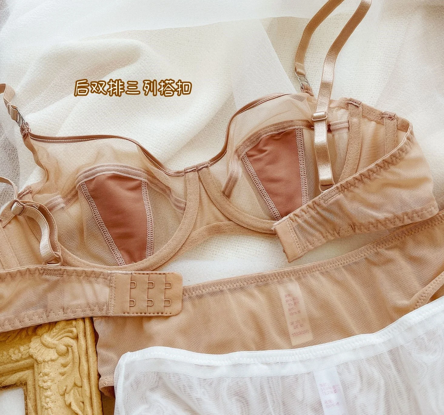Girl sexy ultra-thin lace mesh bra push up large size underwear set steel ring on top of solid color transparent lingerie panty
