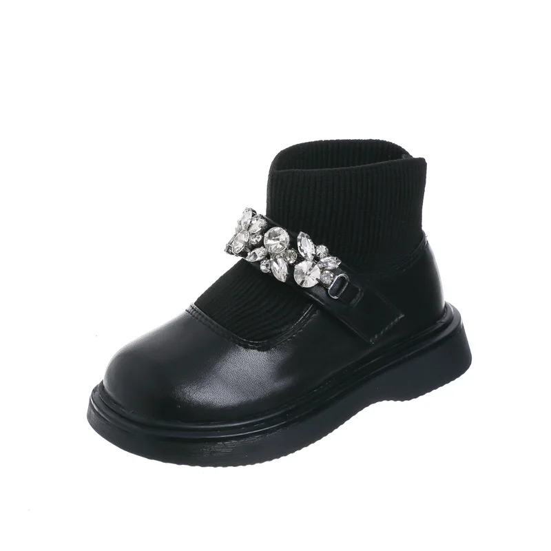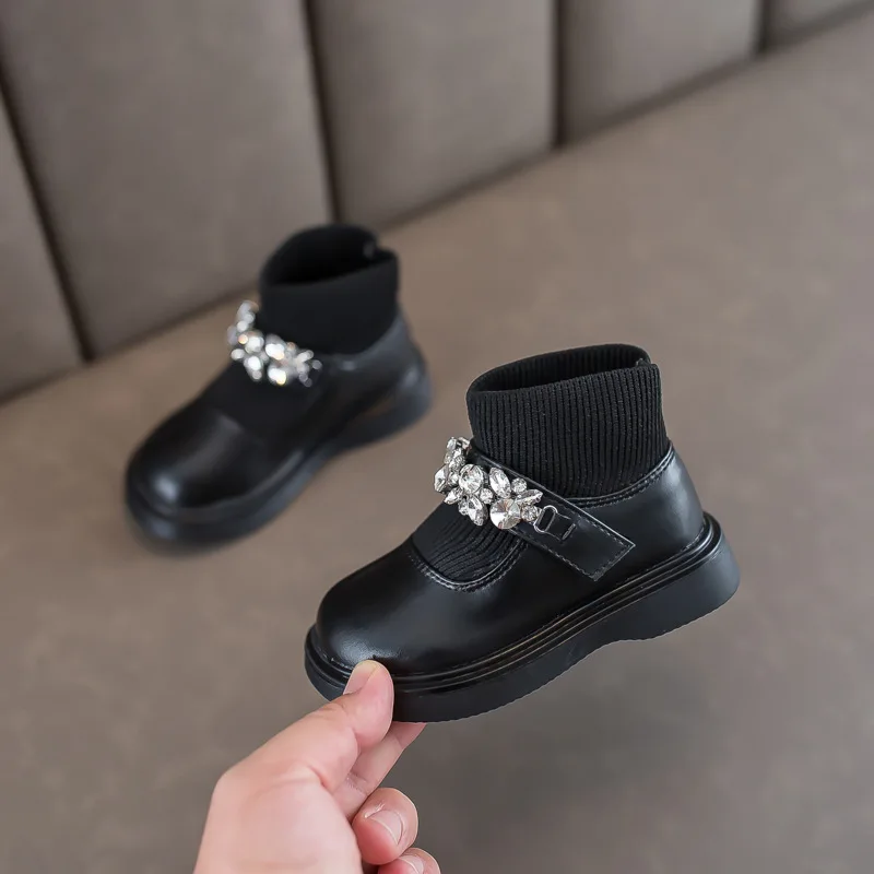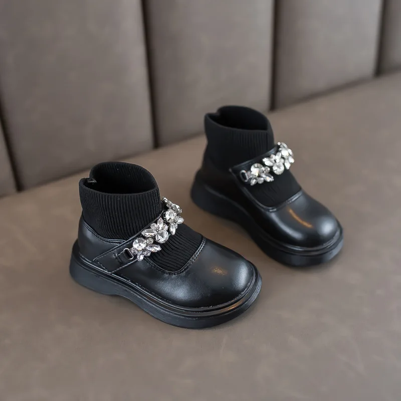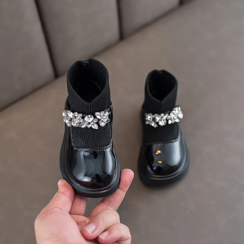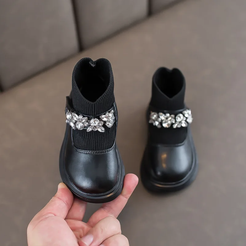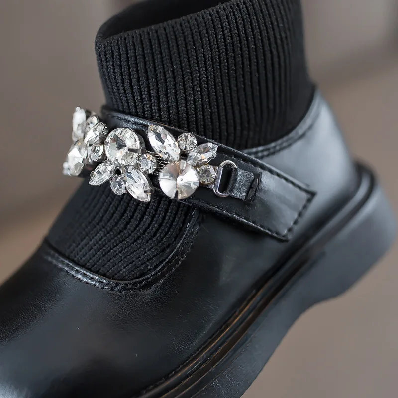 Girls Boots Low Top Ankle Boots Shinning Rhinestone Princess Shoes Socks Ankle Winter Botas Slip on Knitting Kids Shoes Black