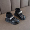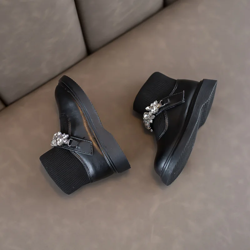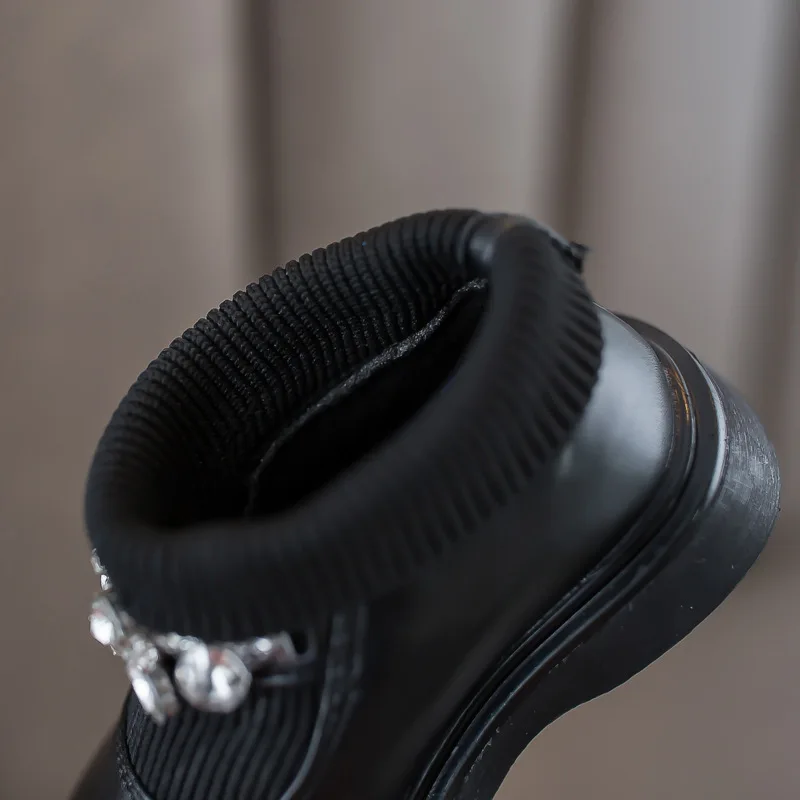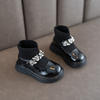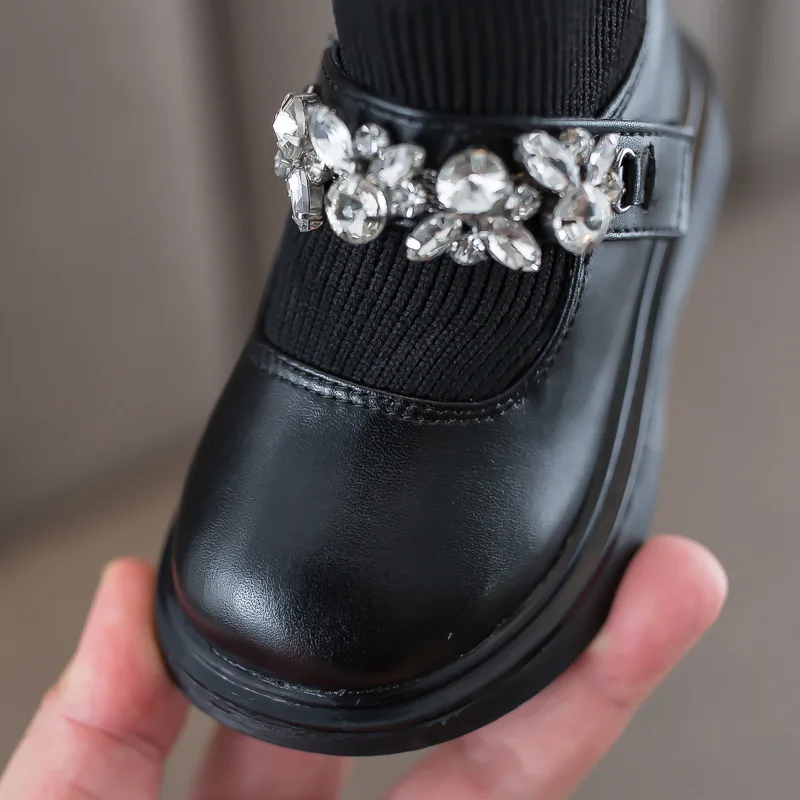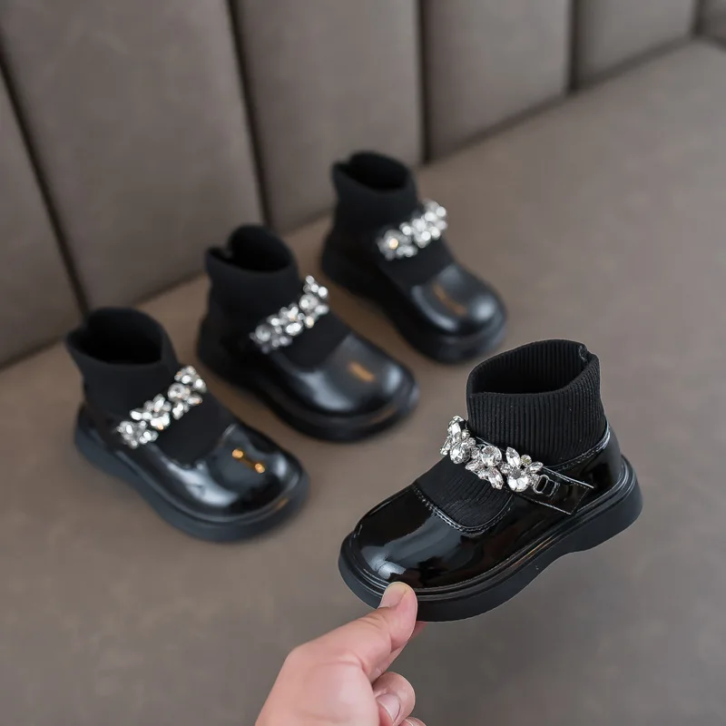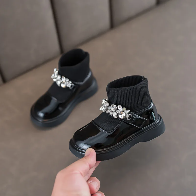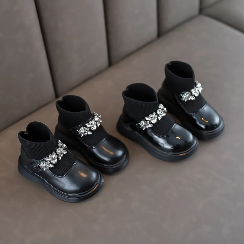 Girls Boots Low Top Ankle Boots Shinning Rhinestone Princess Shoes Socks Ankle Winter Botas Slip on Knitting Kids Shoes Black