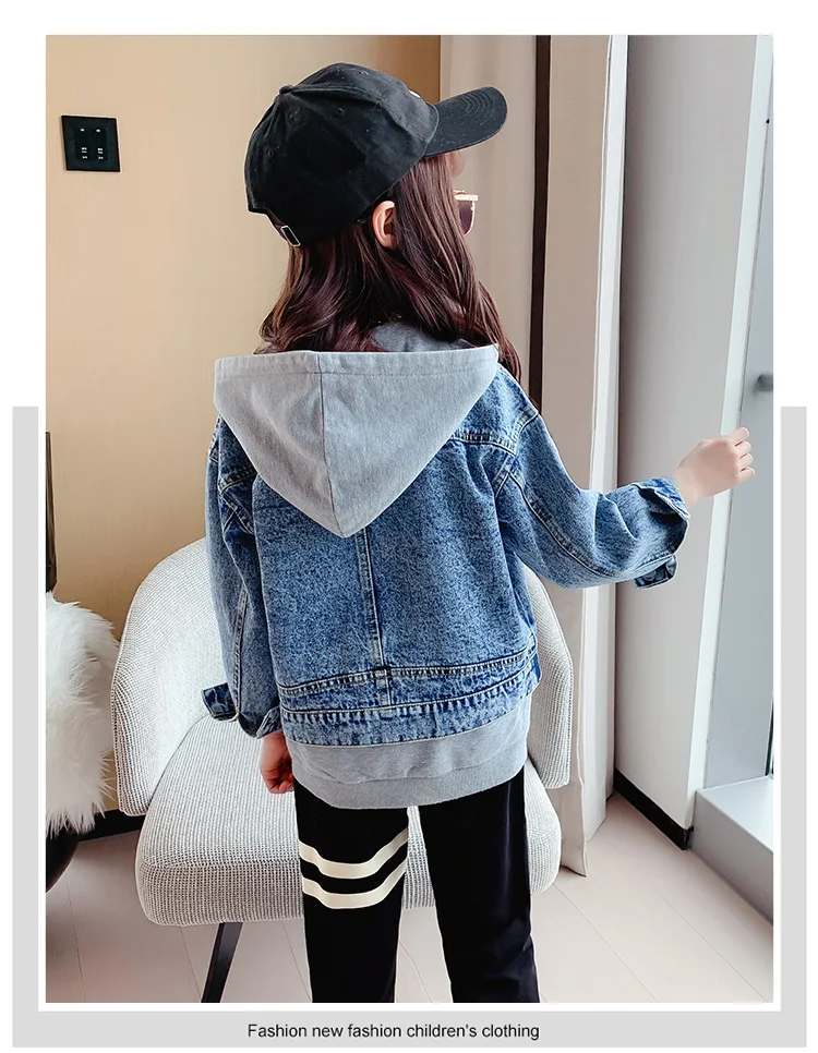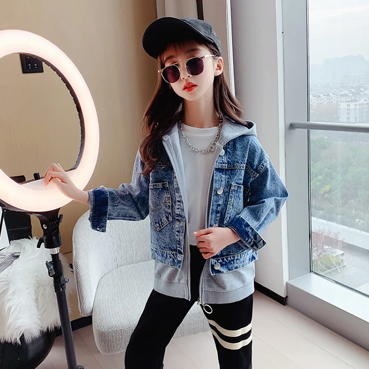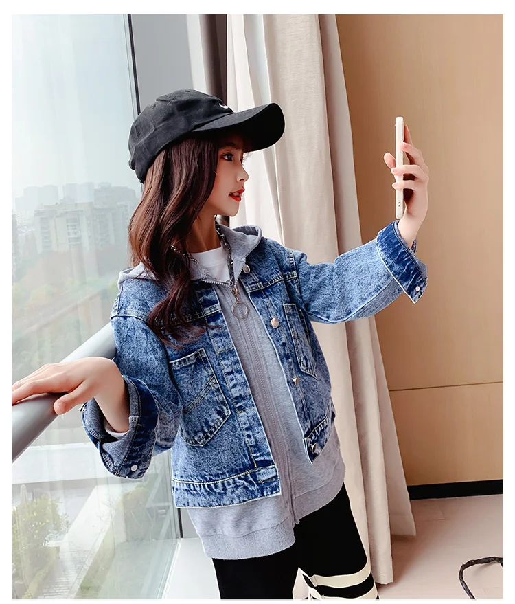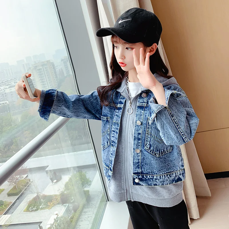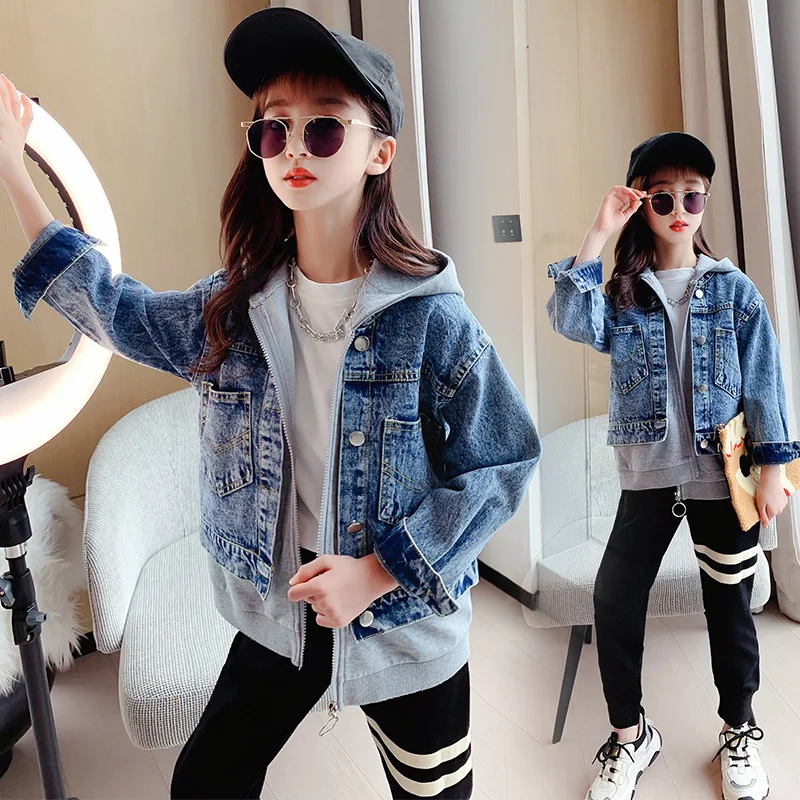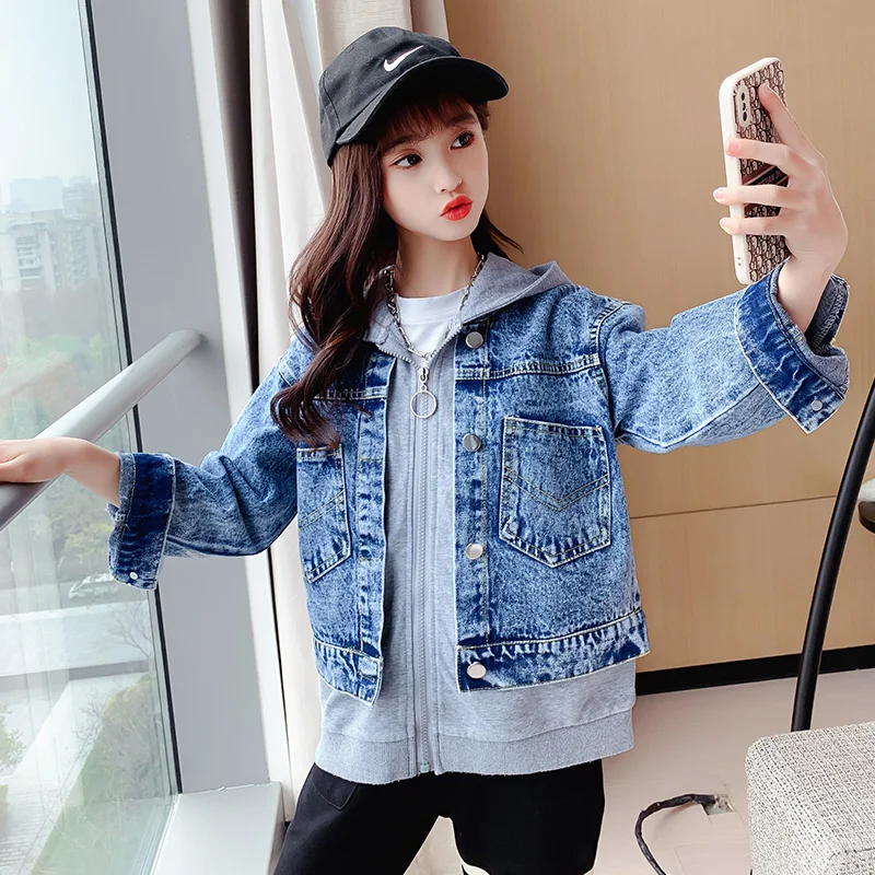 Girls Denim Jackets Hooded Coats Patchwork Spring Autumn Children Casual Outerwear Teenager Kids Jean Jacket 6 8 10 12 14 Years