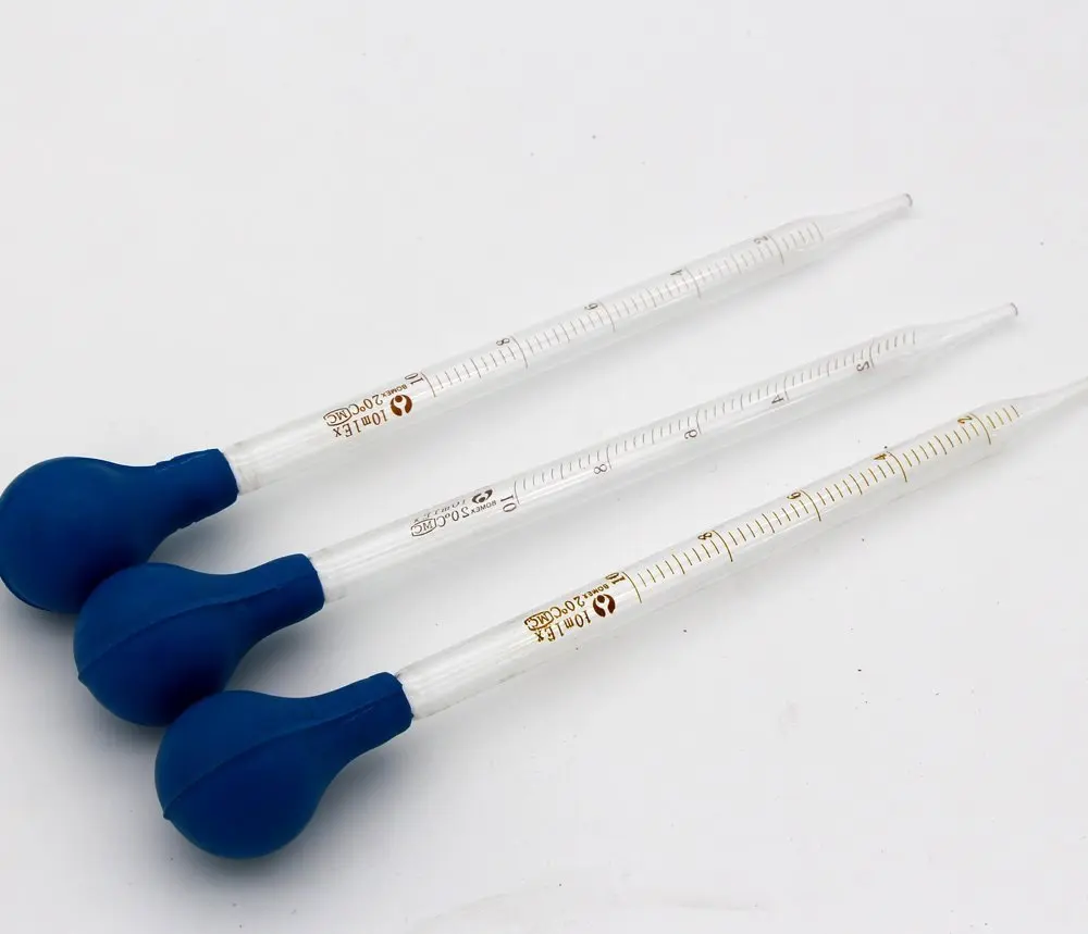 (1) 10 transfer pipettes (2) Volume: 10 ml. (3) Graduation: 0.2 ml (4) packaging, 3 per pack (5) glass made and rubber cup