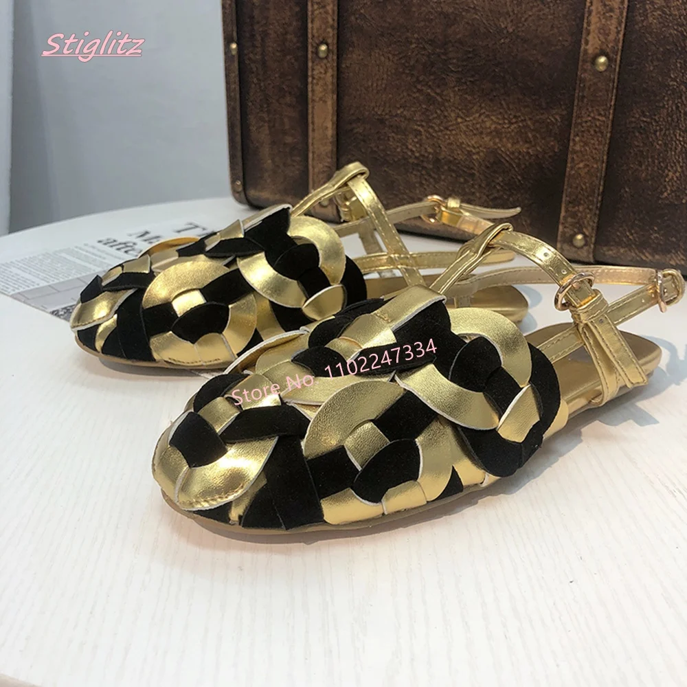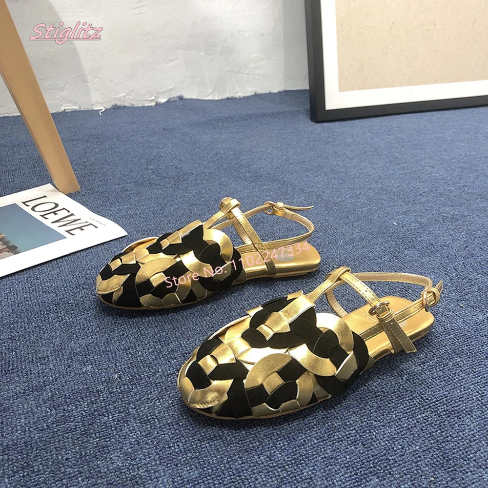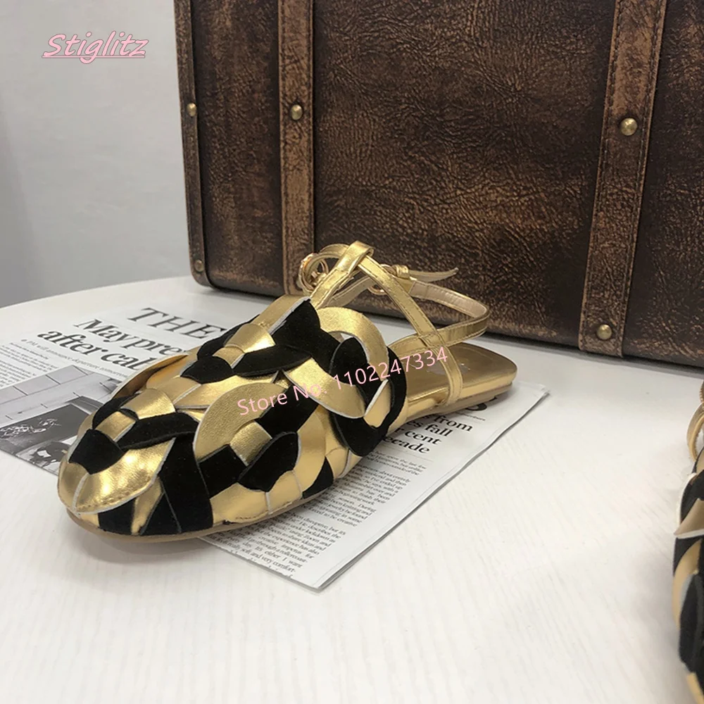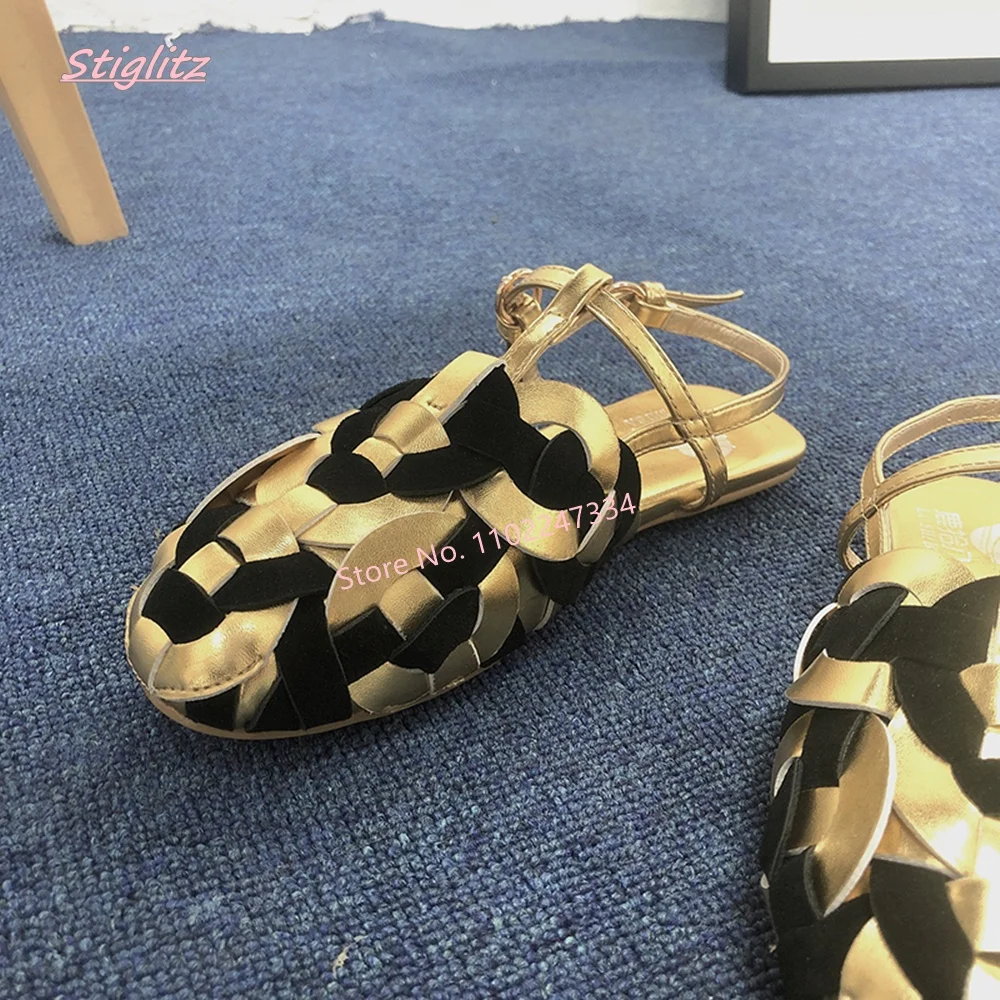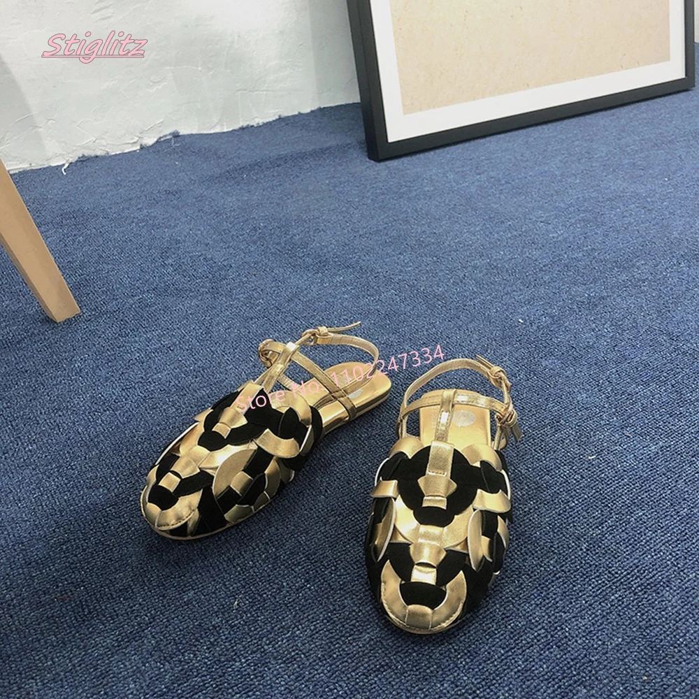 Gold Roman Sandals New Arrival Mixed Colors Flat Heel Ankle Buckle Strap footwear Leather Round Toe Sweet Girl Party Shoes