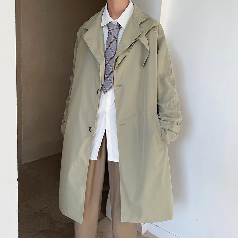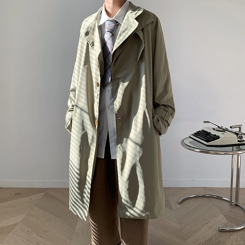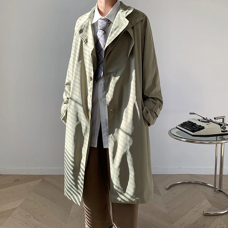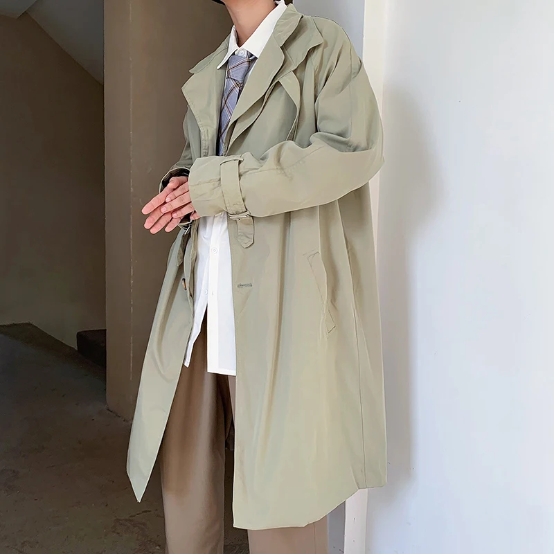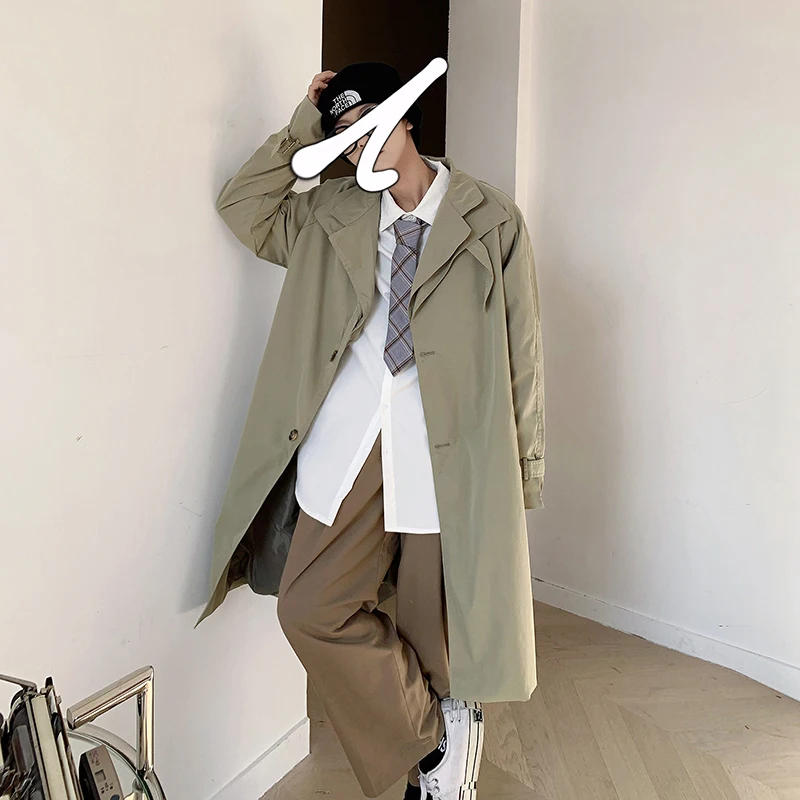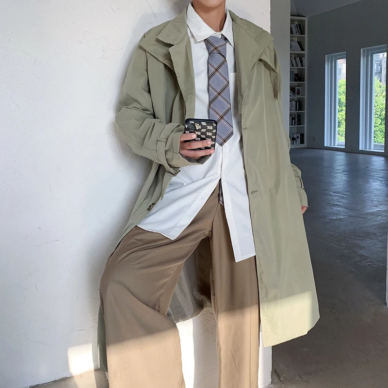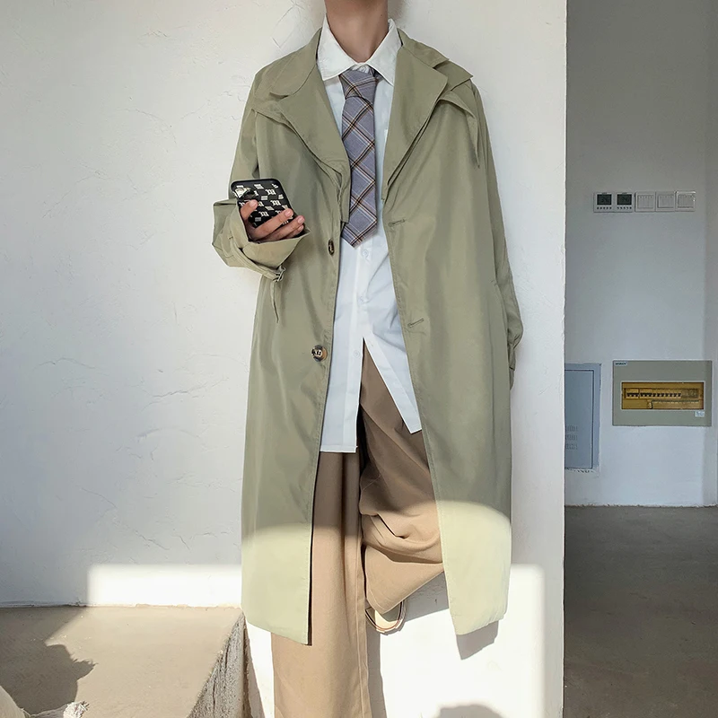 Green Black Trench Coat Men Fashion Casual Long Coat Men Streetwear Korean Loose Oversized Windbreaker Jacket Mens Overcoat