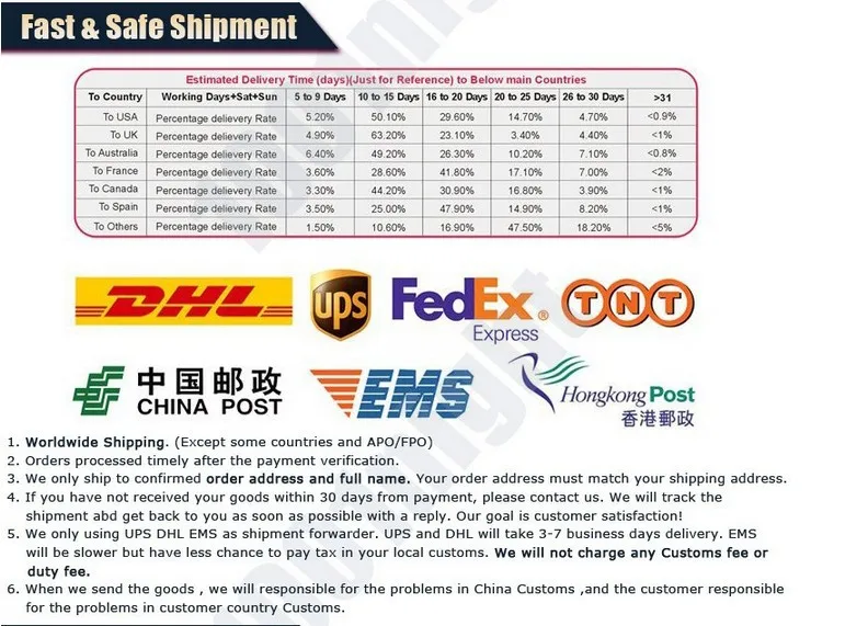 Packages from our warehouse in China will be shipped by ePacket or EMS depending on the weight and size of the product. Packages shipped from our US warehouse are shipped through USPS.