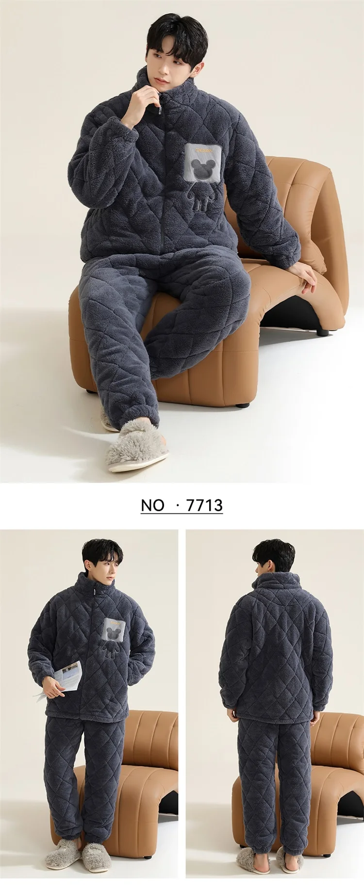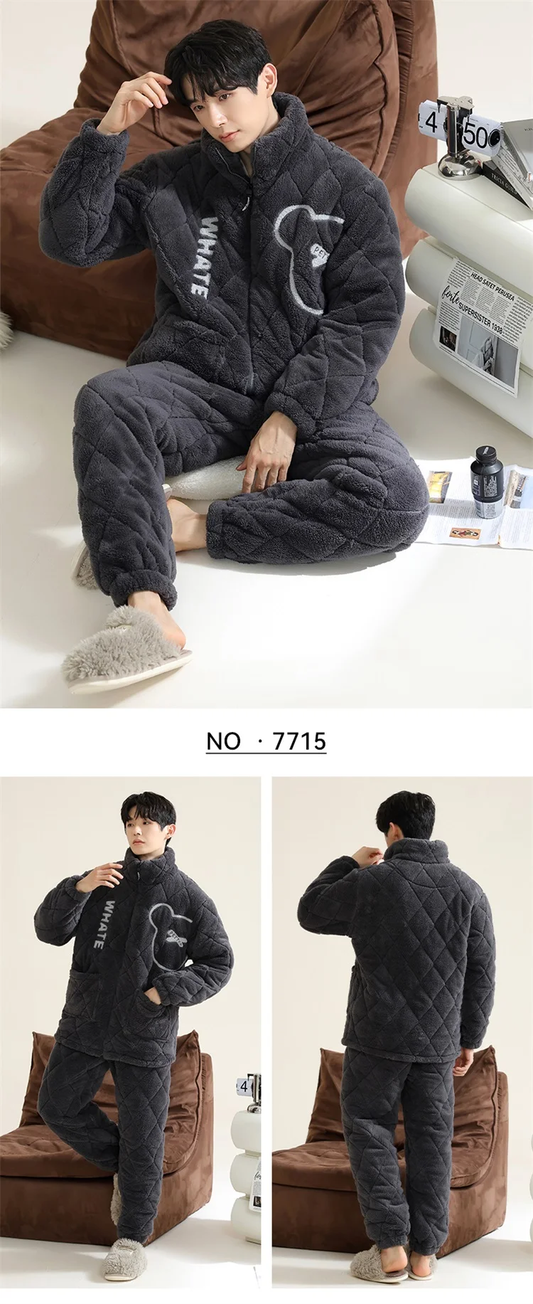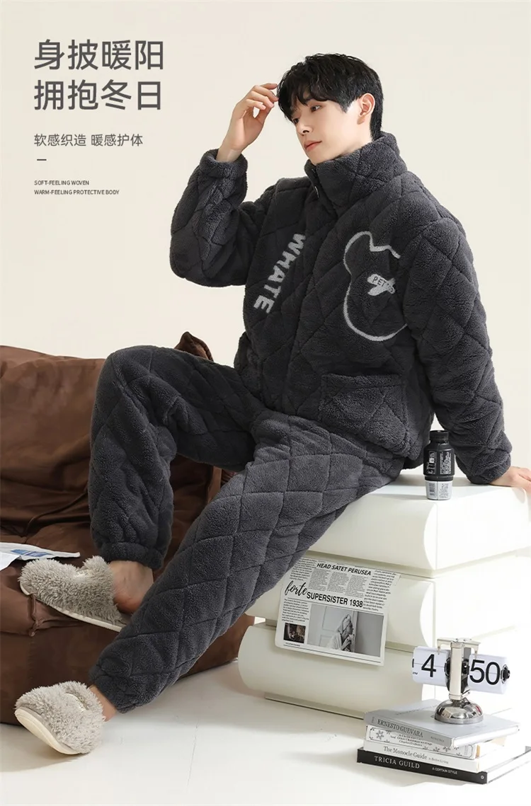 High Quality Winter Men Pajamas Set Thick Warm Men Sleepwear 3 Layer Clip Cotton Pyjamas