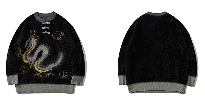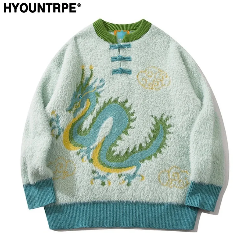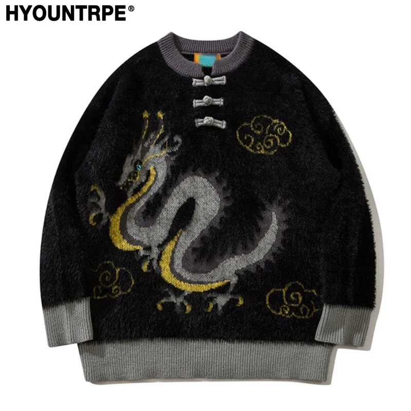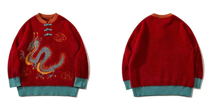 Hip Hop Knitted Sweater Unisex New Year Chinese Tie Dragon Pattern Pullover Streetwear Casual Loose Sweater Warm Jumper Knitwear