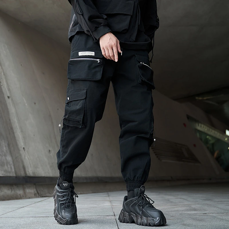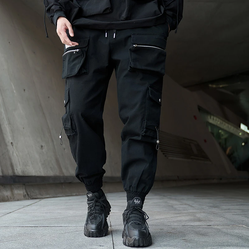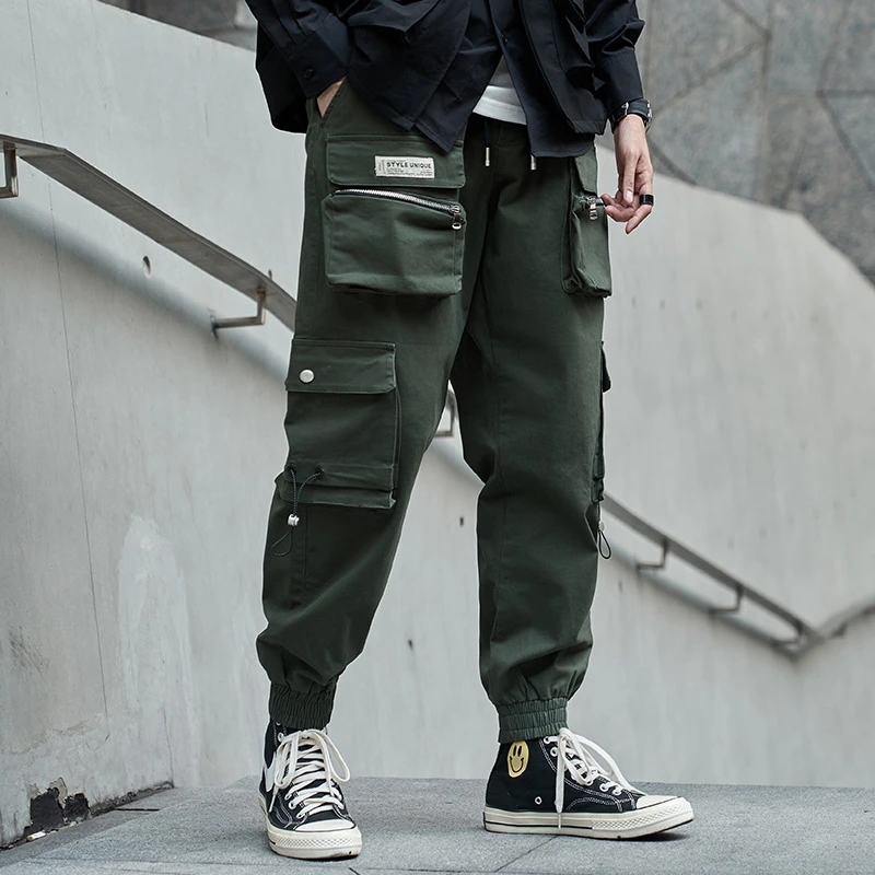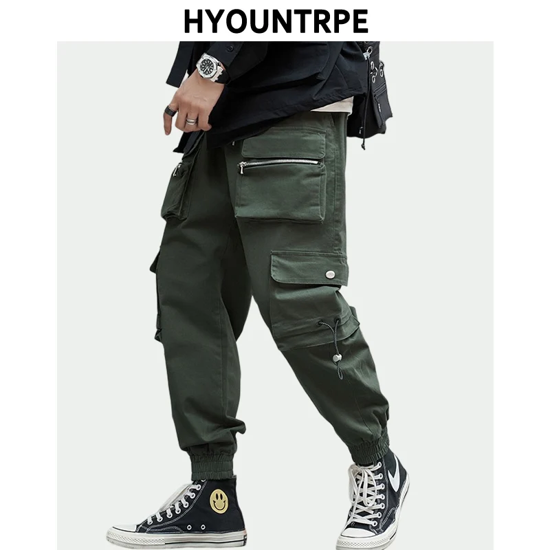 Hip Hop Loose Fit Elastic Waist Cargo Pants Fashion Military Pockets Ankle Trousers Pants Mens Drewstring Sweatpants Joggers
