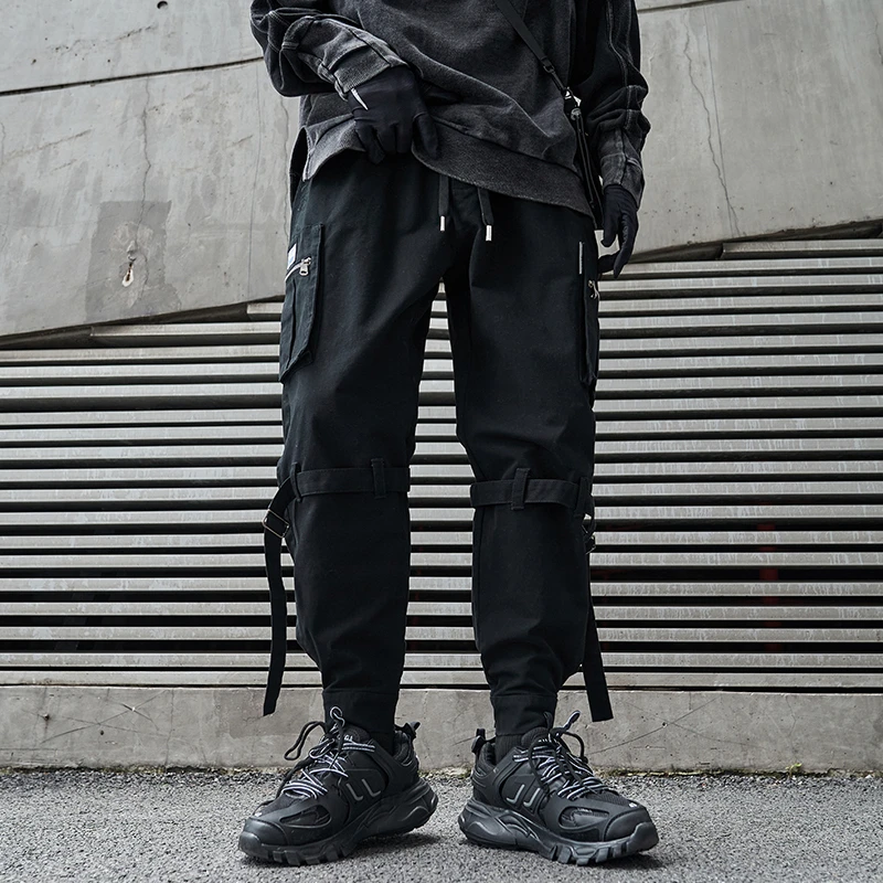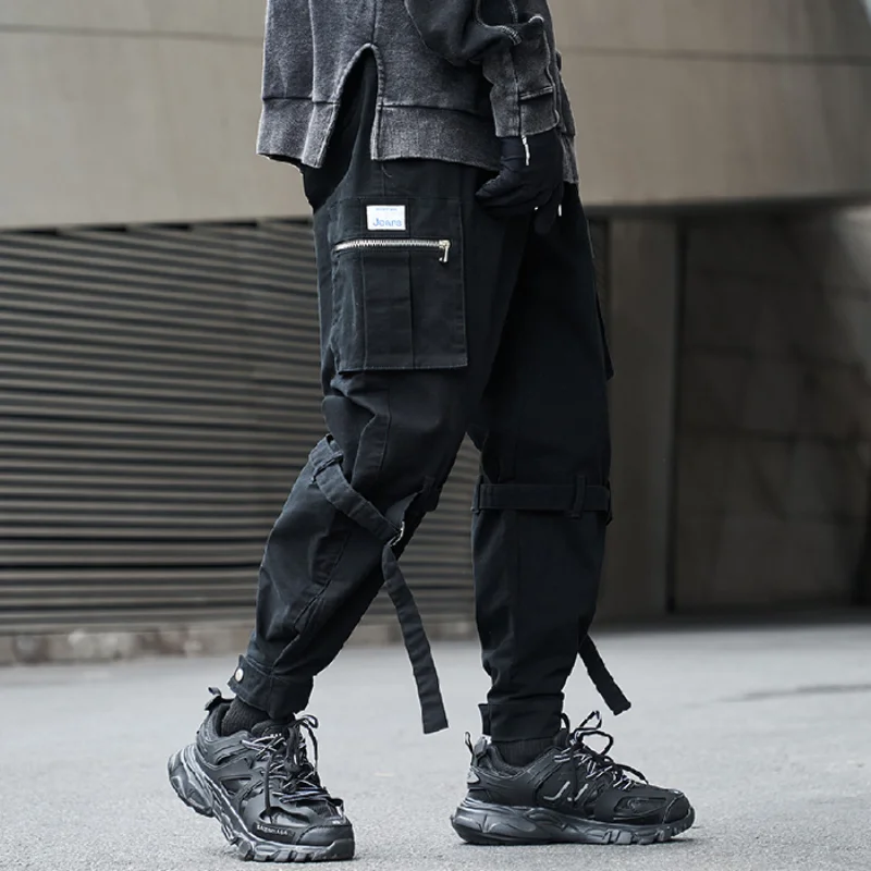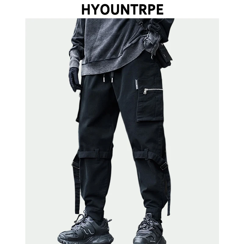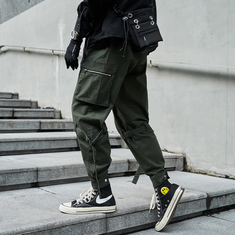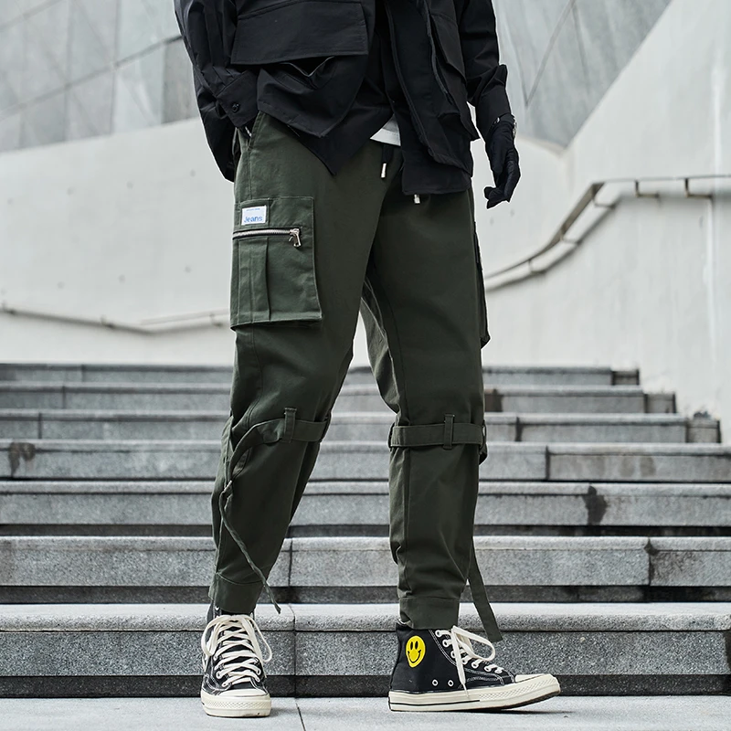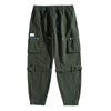 Hip Hop Loose Fit Elastic Waist Cargo Pants Side Big Pocket Ankle Pants with Belt Mens Drewstring Military Sweatpants Joggers