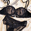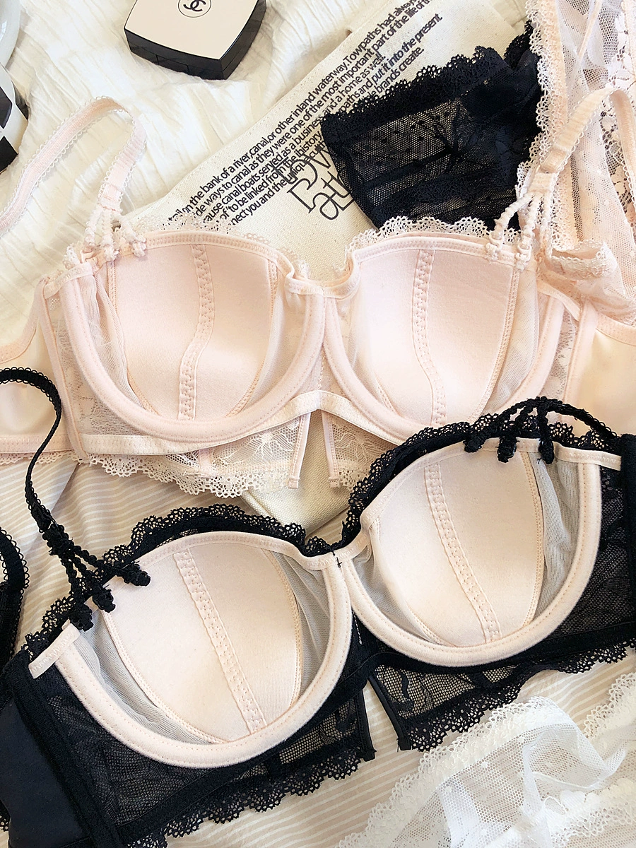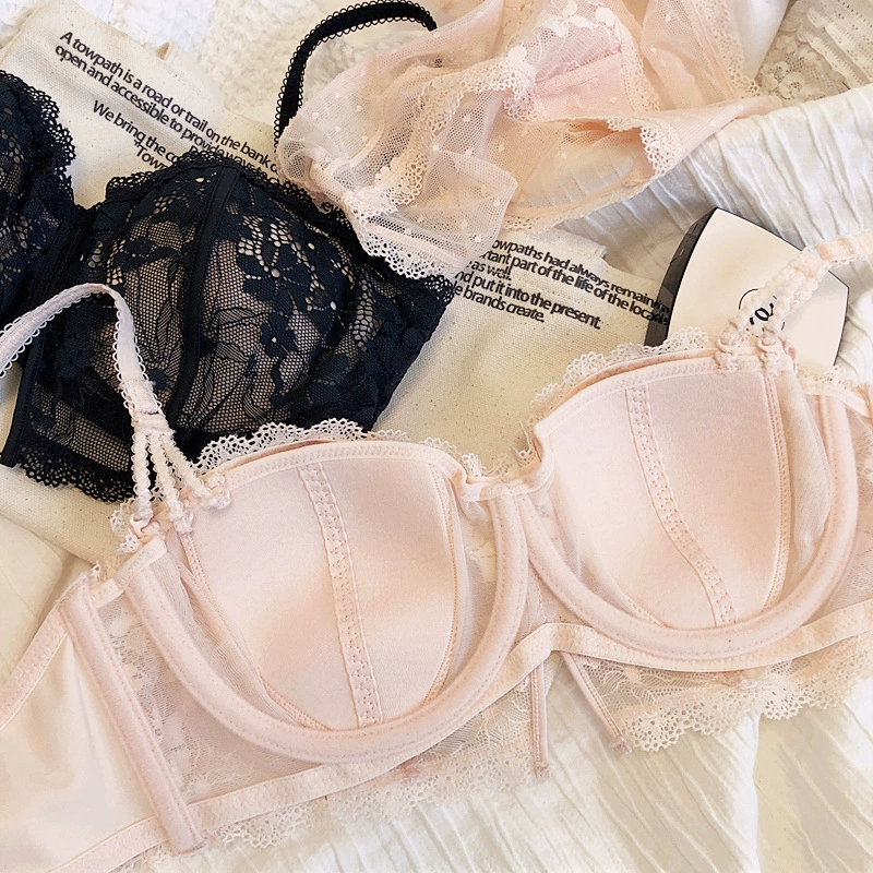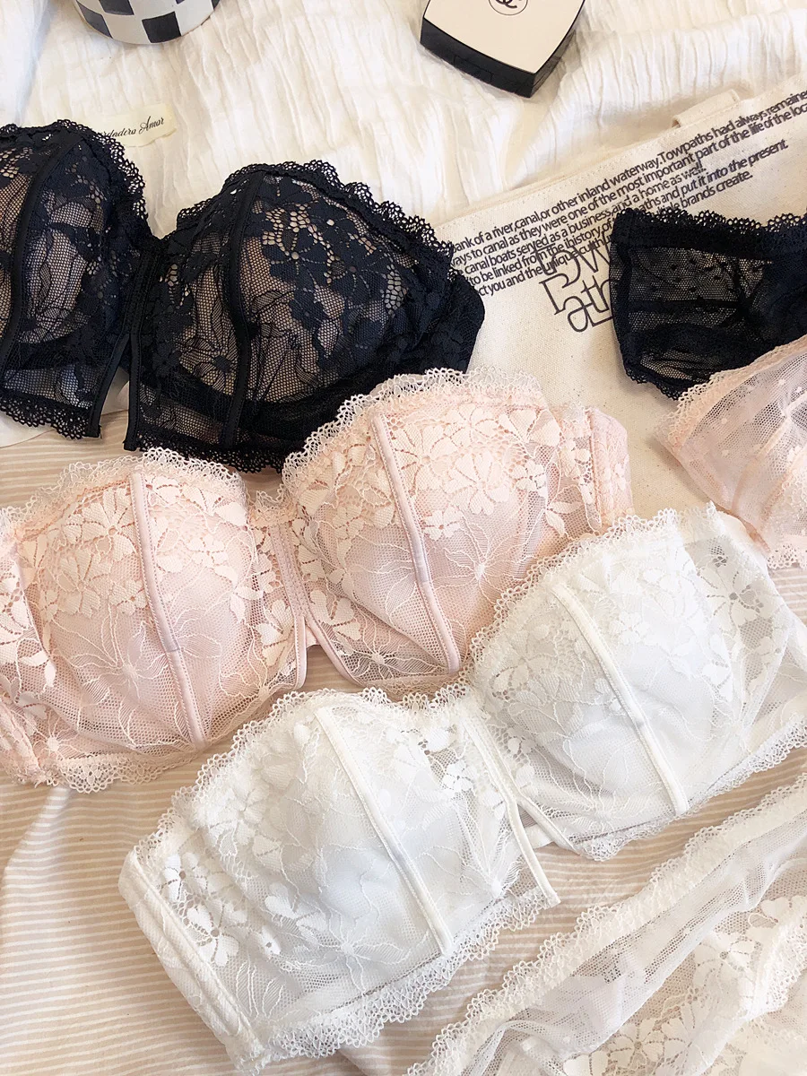 Hollow lace half-cup lingerie with panty non-slip strapless bra set soft underwire thin rabbit ear underwear bralette