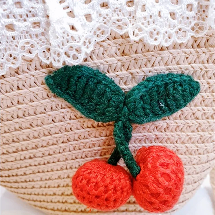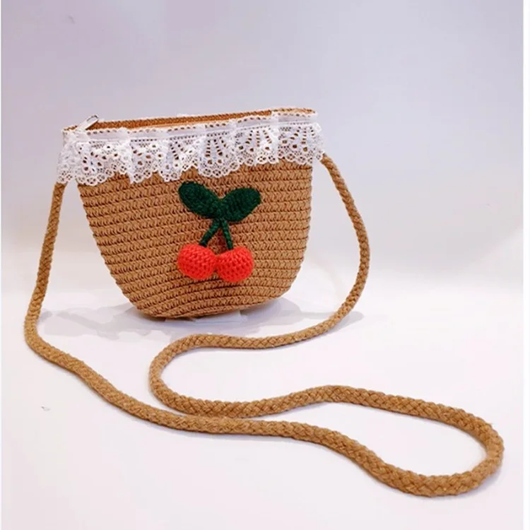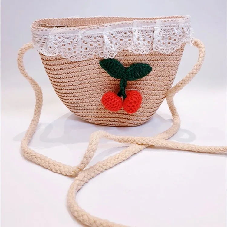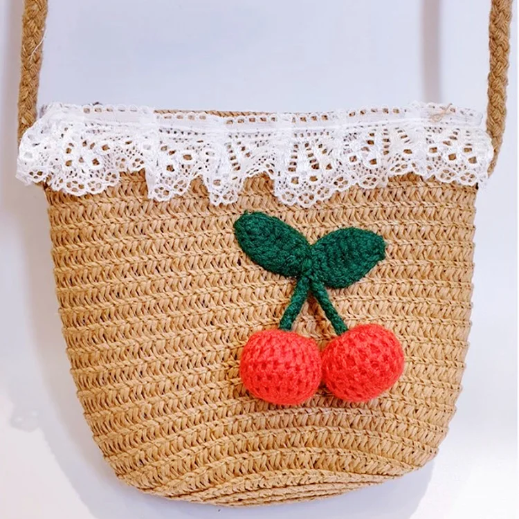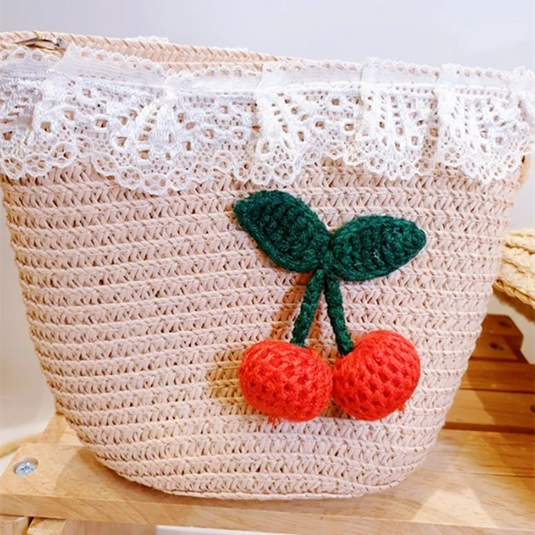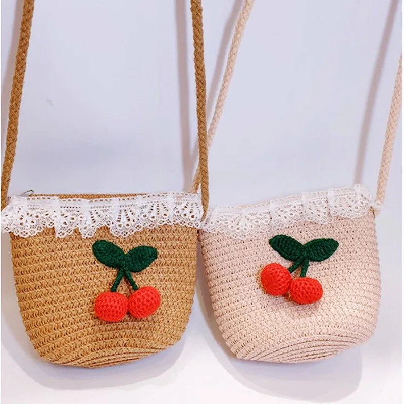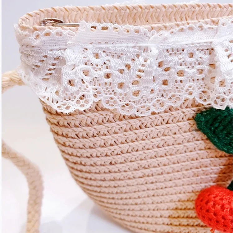 Hot Sale Summer Children Baby Girl Hand Made Plaited Straw Bag Cute Cherry Lace Single Shoulder Crossbody Bags for Kids Girls
