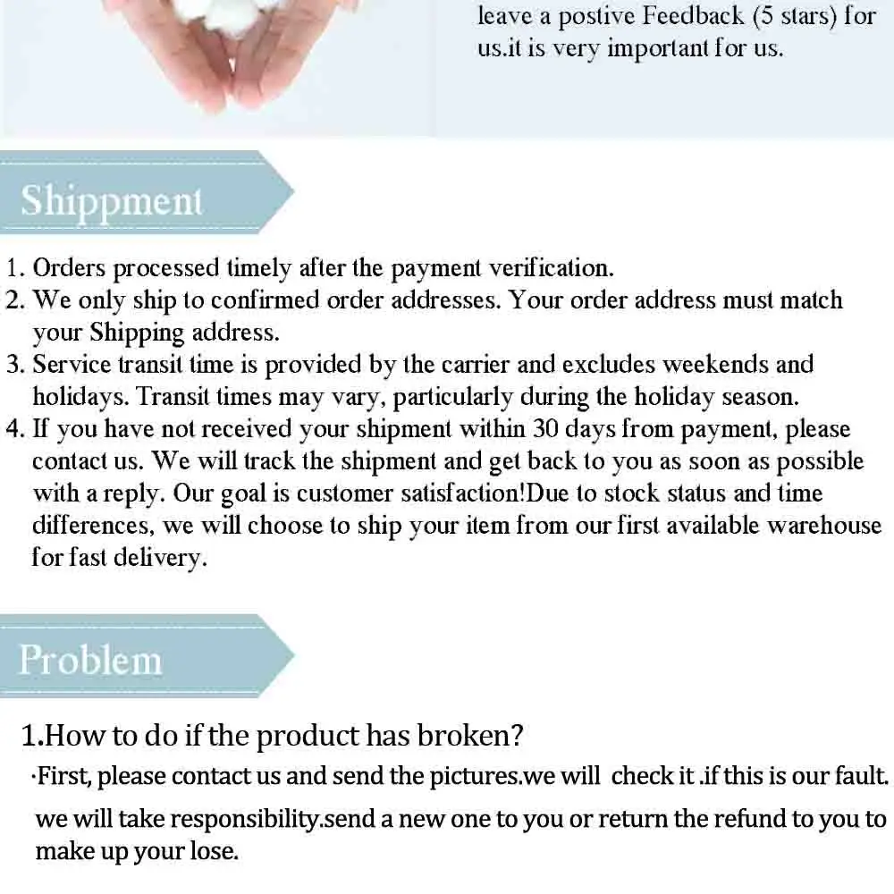 • If you did not receive the product within the guaranteed time( 45 days not including 2-5 day processing) you can request a refund or a reshipment.