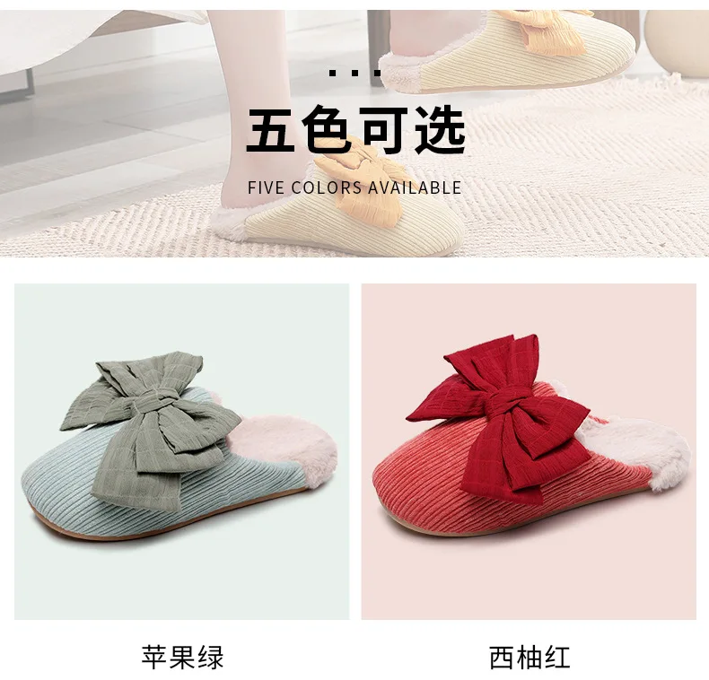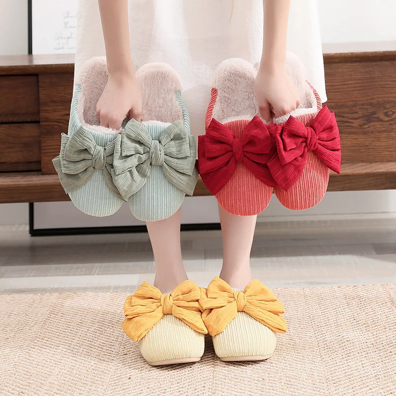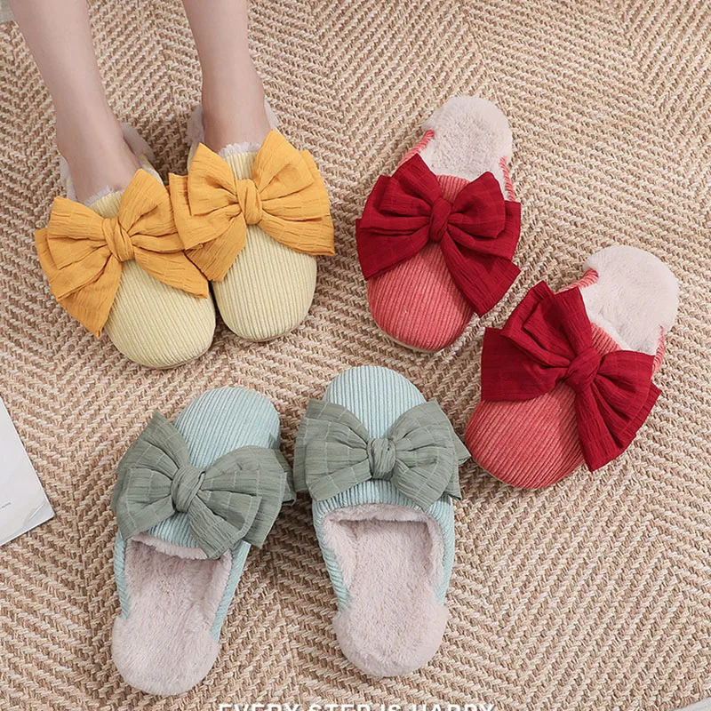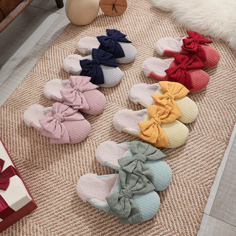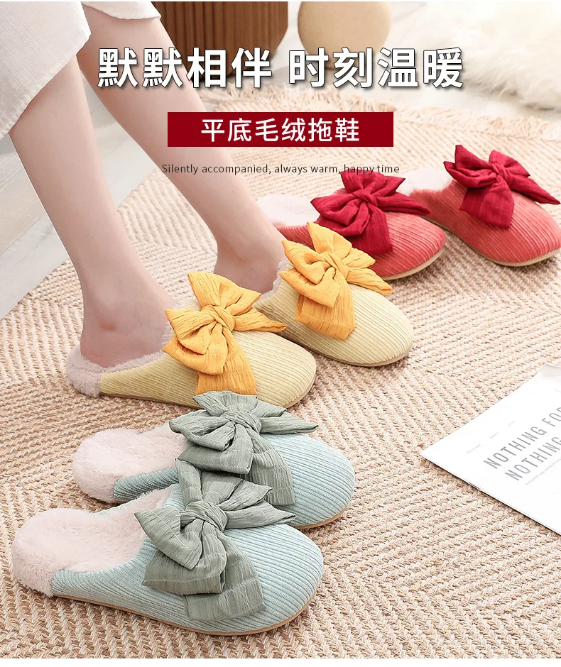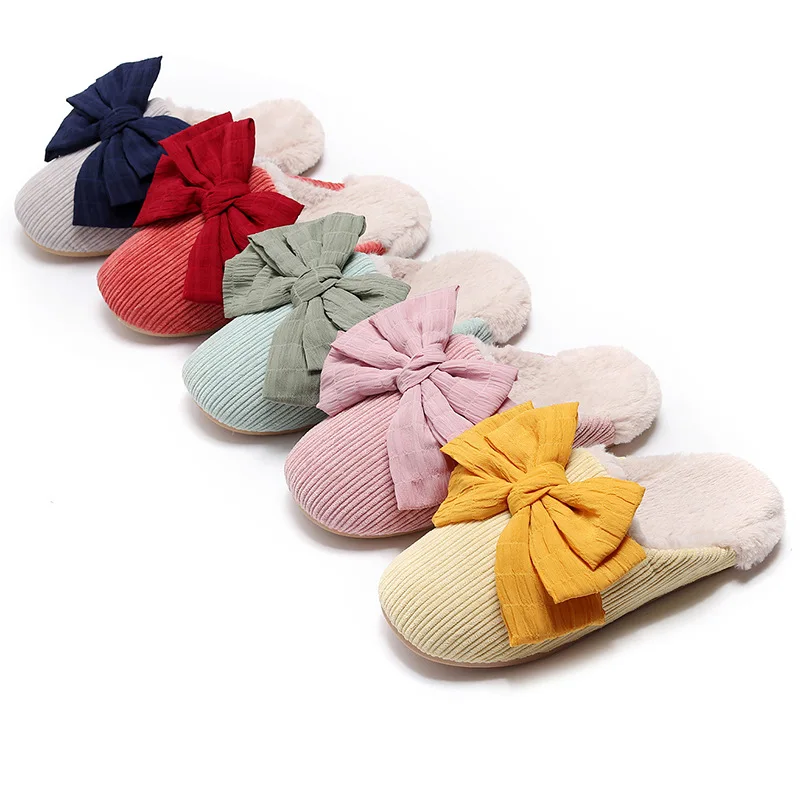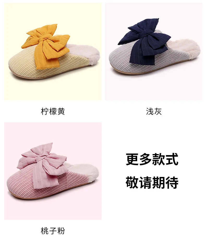 Indoor Bow-knot corduroy cotton slippers women home fur mules fleeces winter shoes woman closed toe warm plush slides mujer 2021