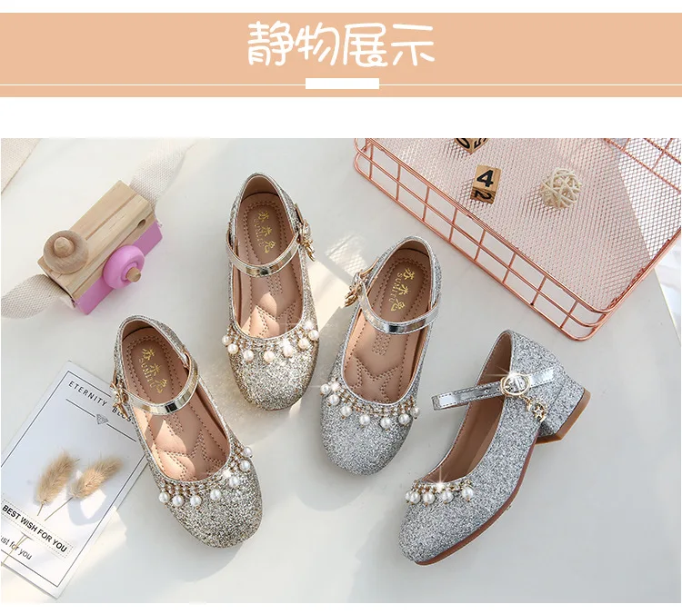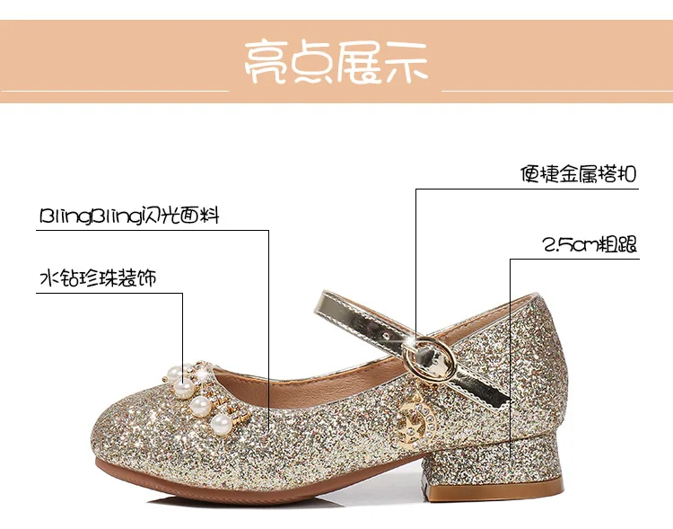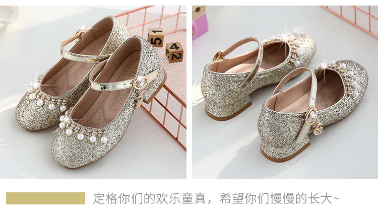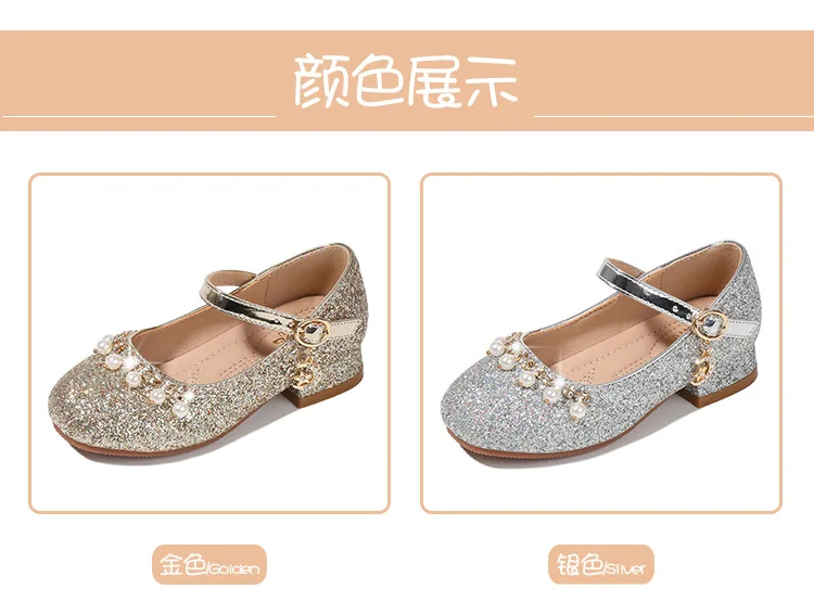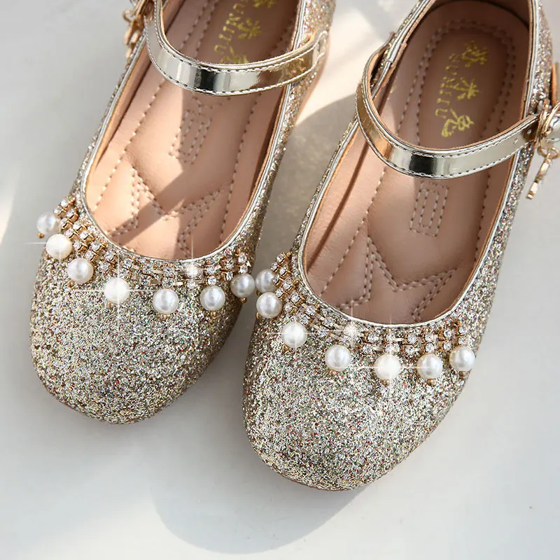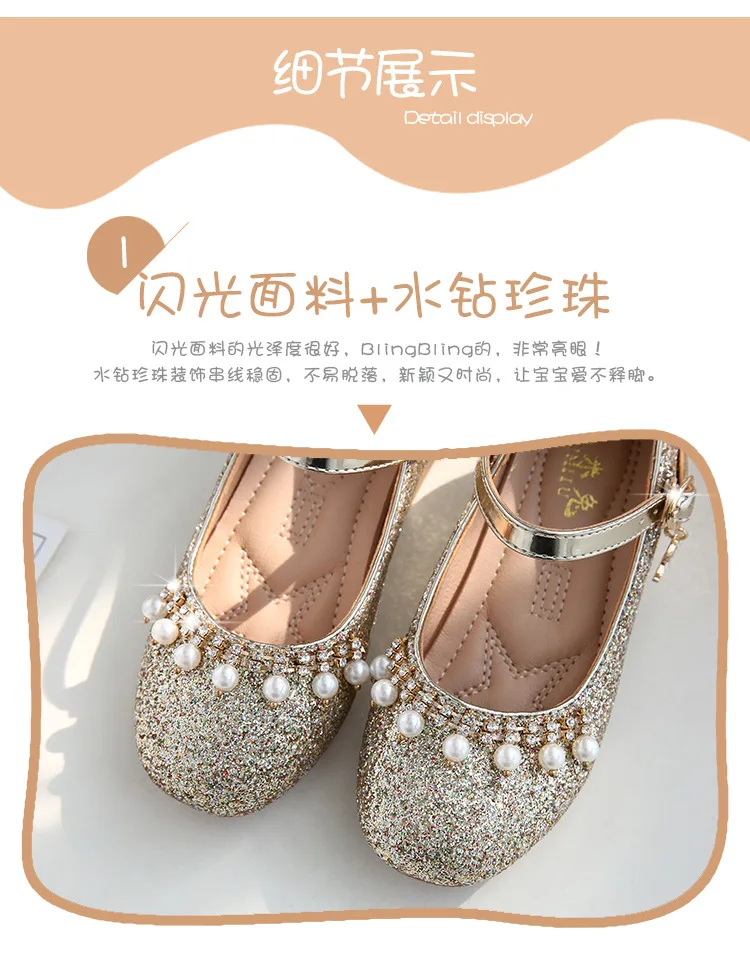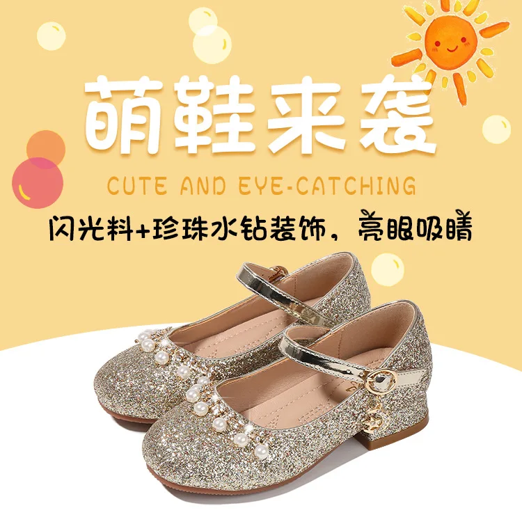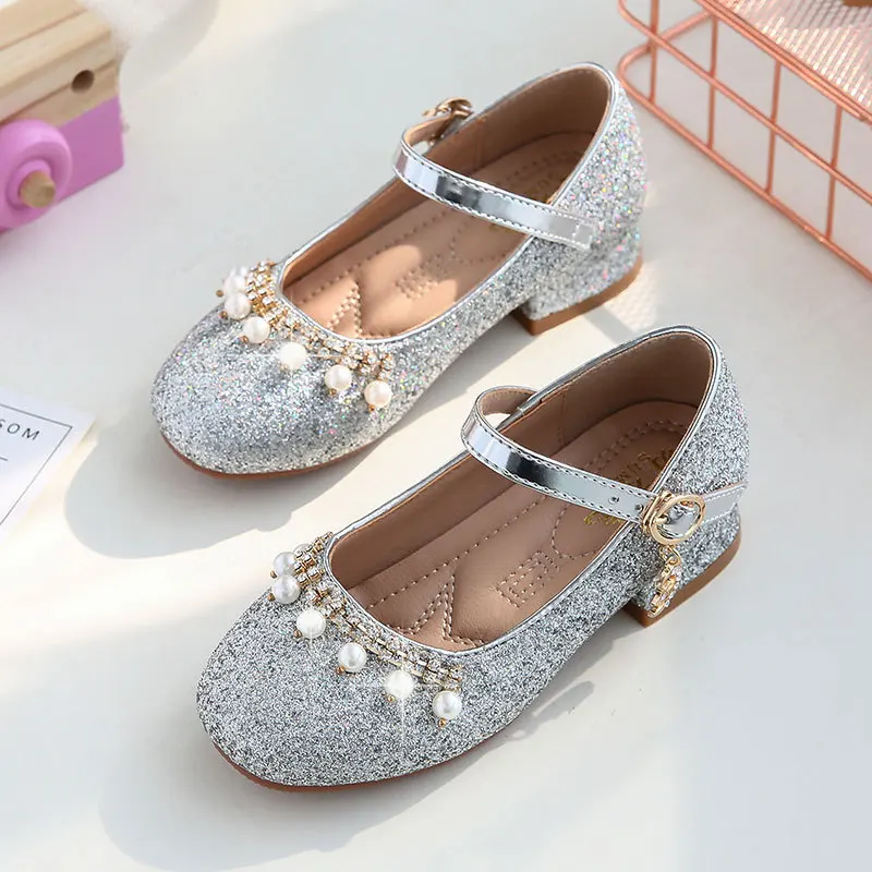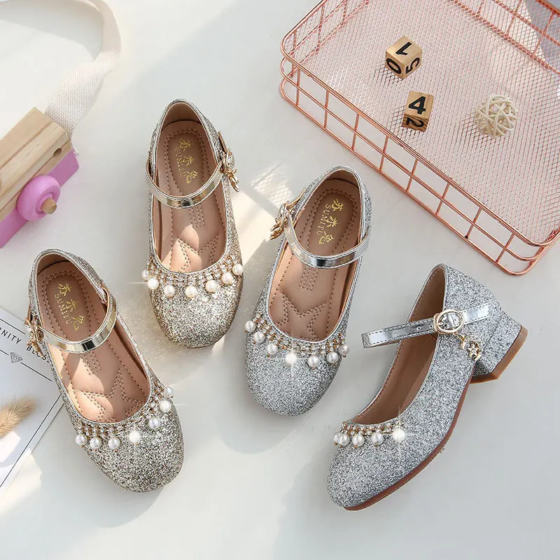Ins Girls Leather Shoes Crystal Princess Shoes Children Small High Heels Hook Loop Kids Single Shoes Pearls Squins Dancing Shoes