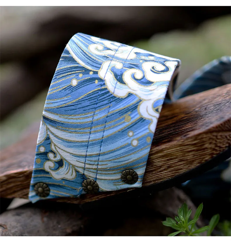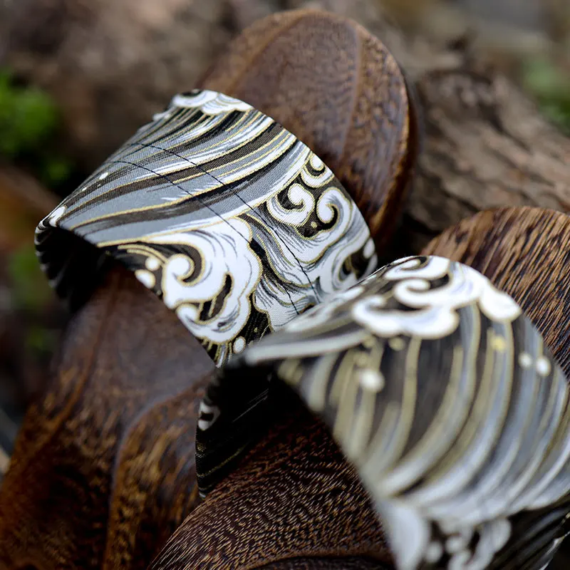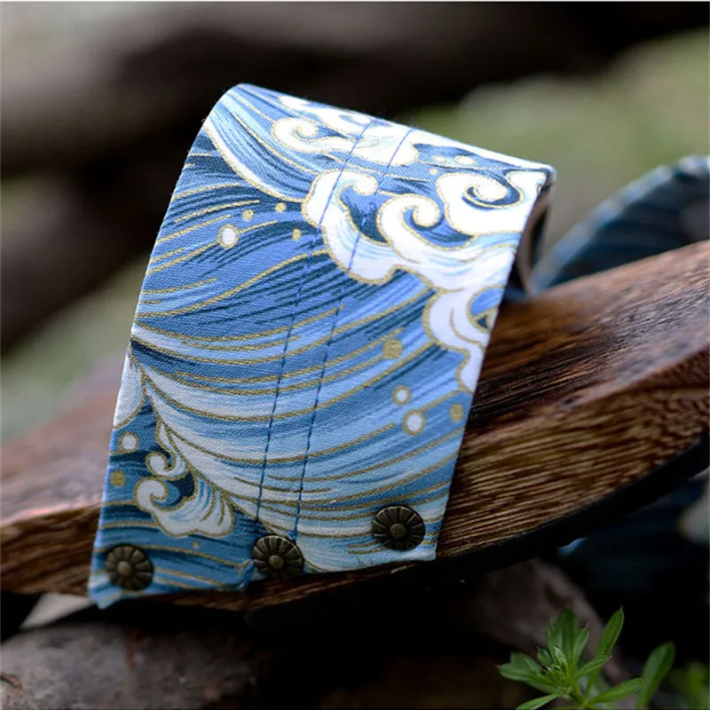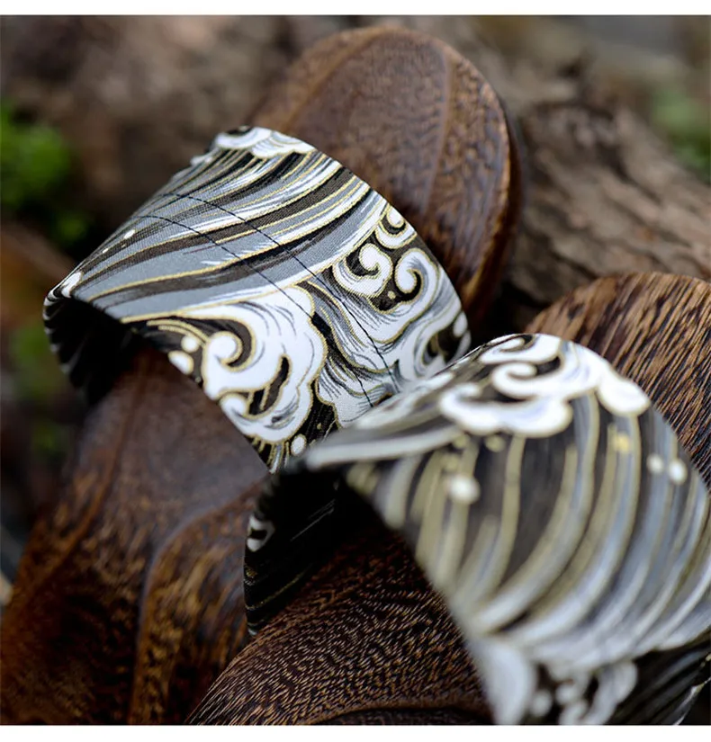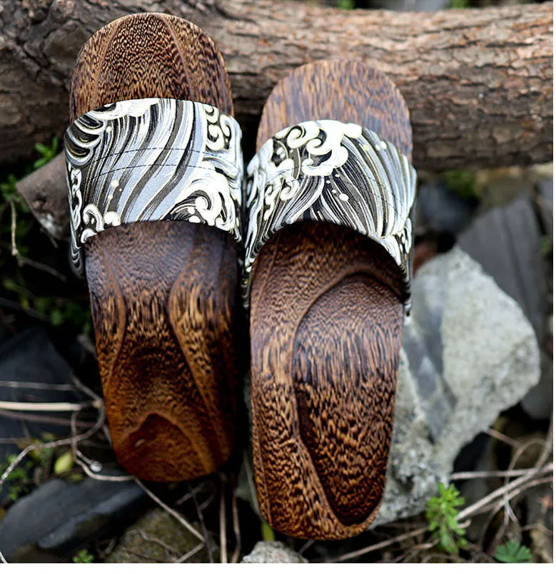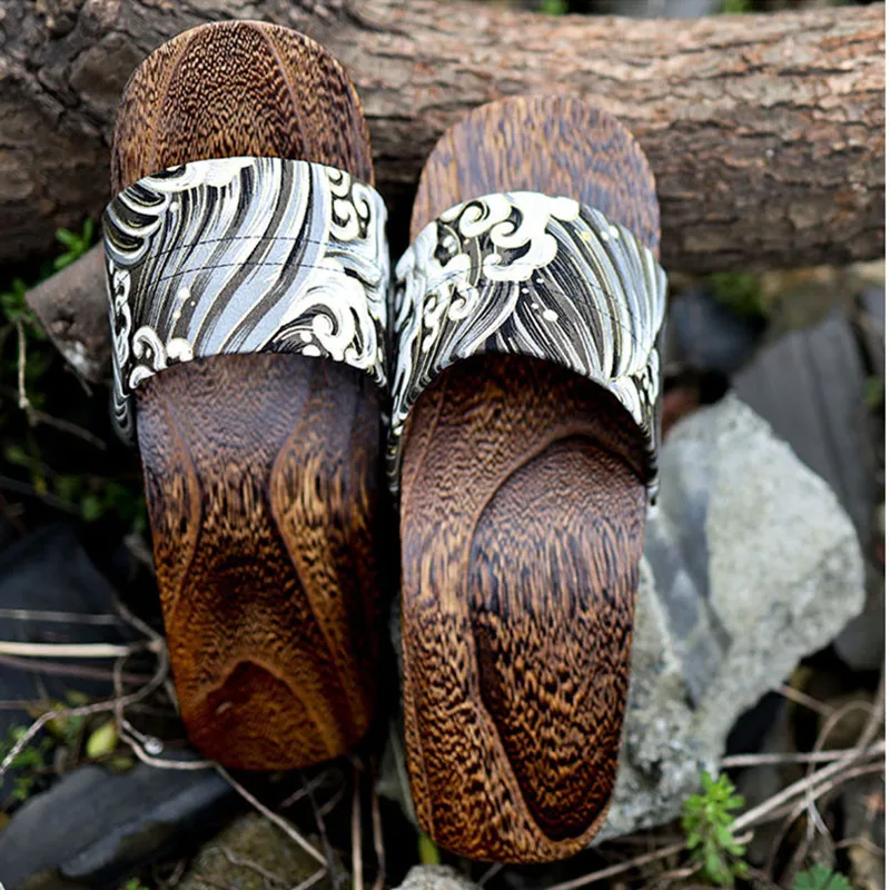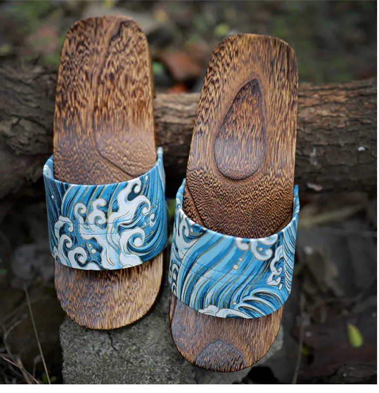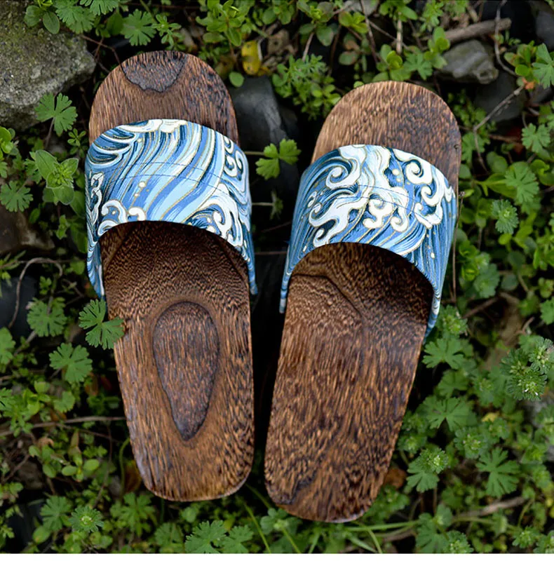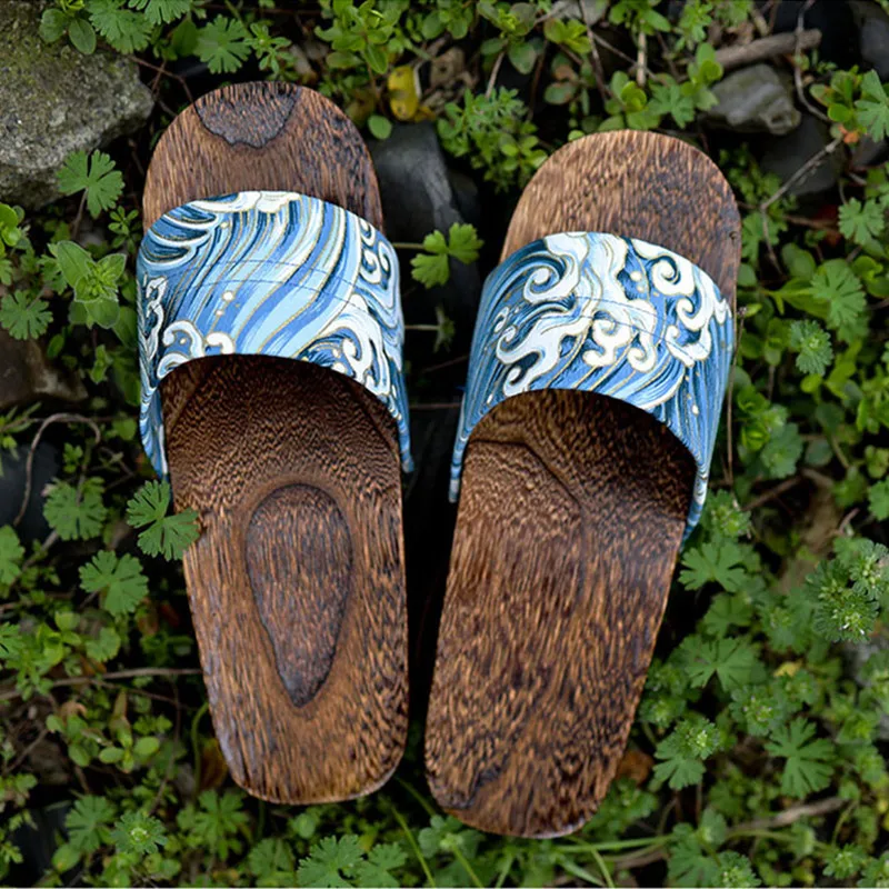 Japan Style Men’s Wooden Outdoor Slippers Ocean Wave Prints Flat Heel Summer Casual Sandals Beach Slippers Cosplay Shoes
