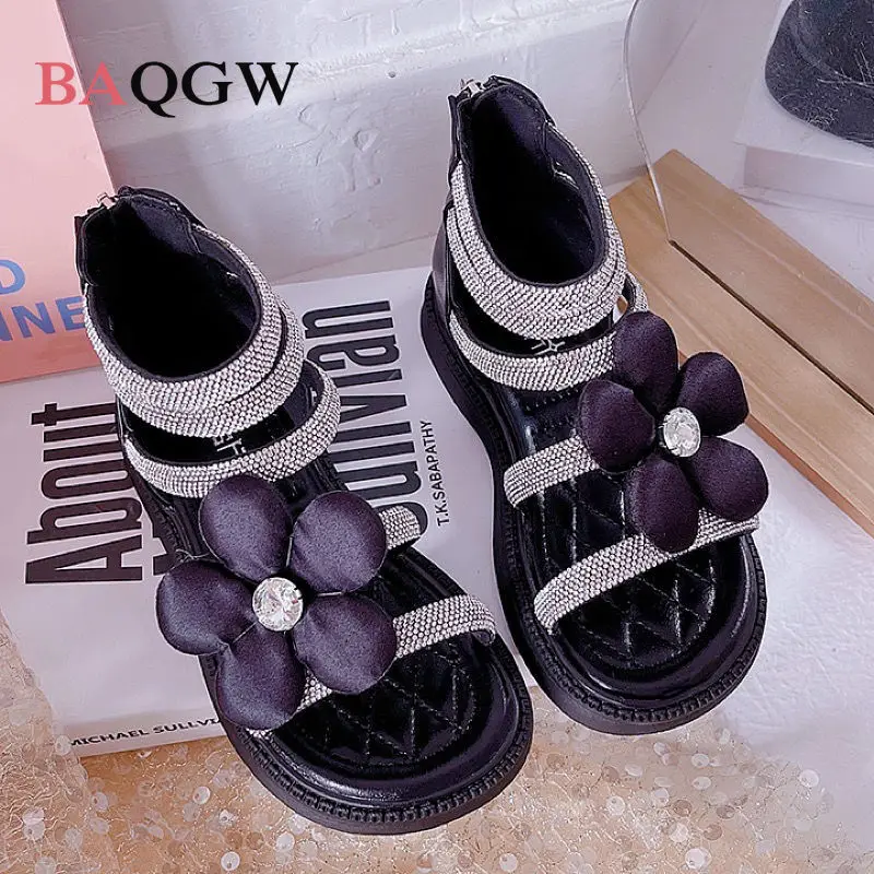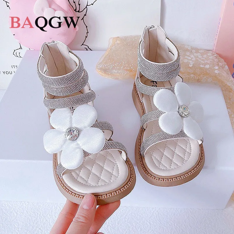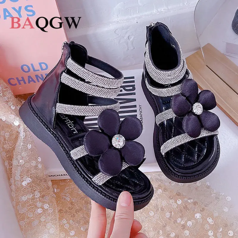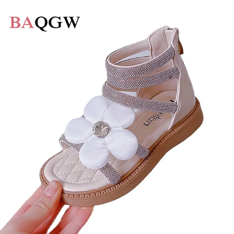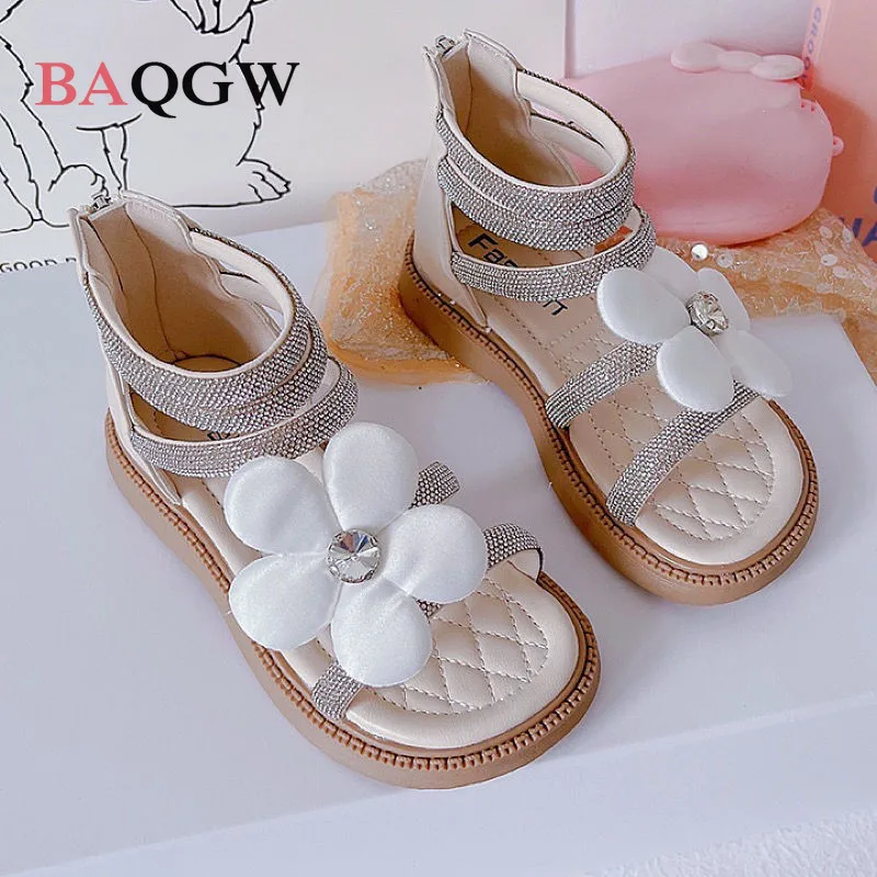 Kid Princess Sandals Summer Girls Fashion Gladiator HIgh Top Rome Shoes Children Flower Rhinestone Bling Toddler Flats Soft Sole