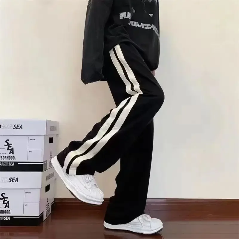 Korean Fashion Wide Leg Pants Women Loose Casual Striped High Waist Hiphop Elastic Waist Pocket Straight Pants