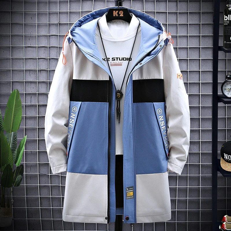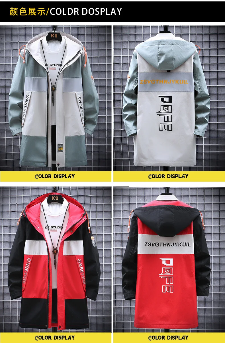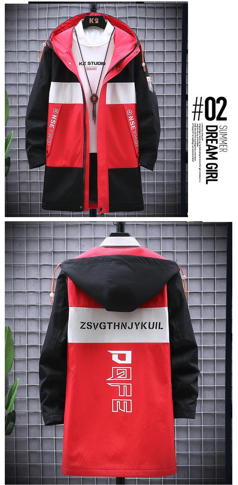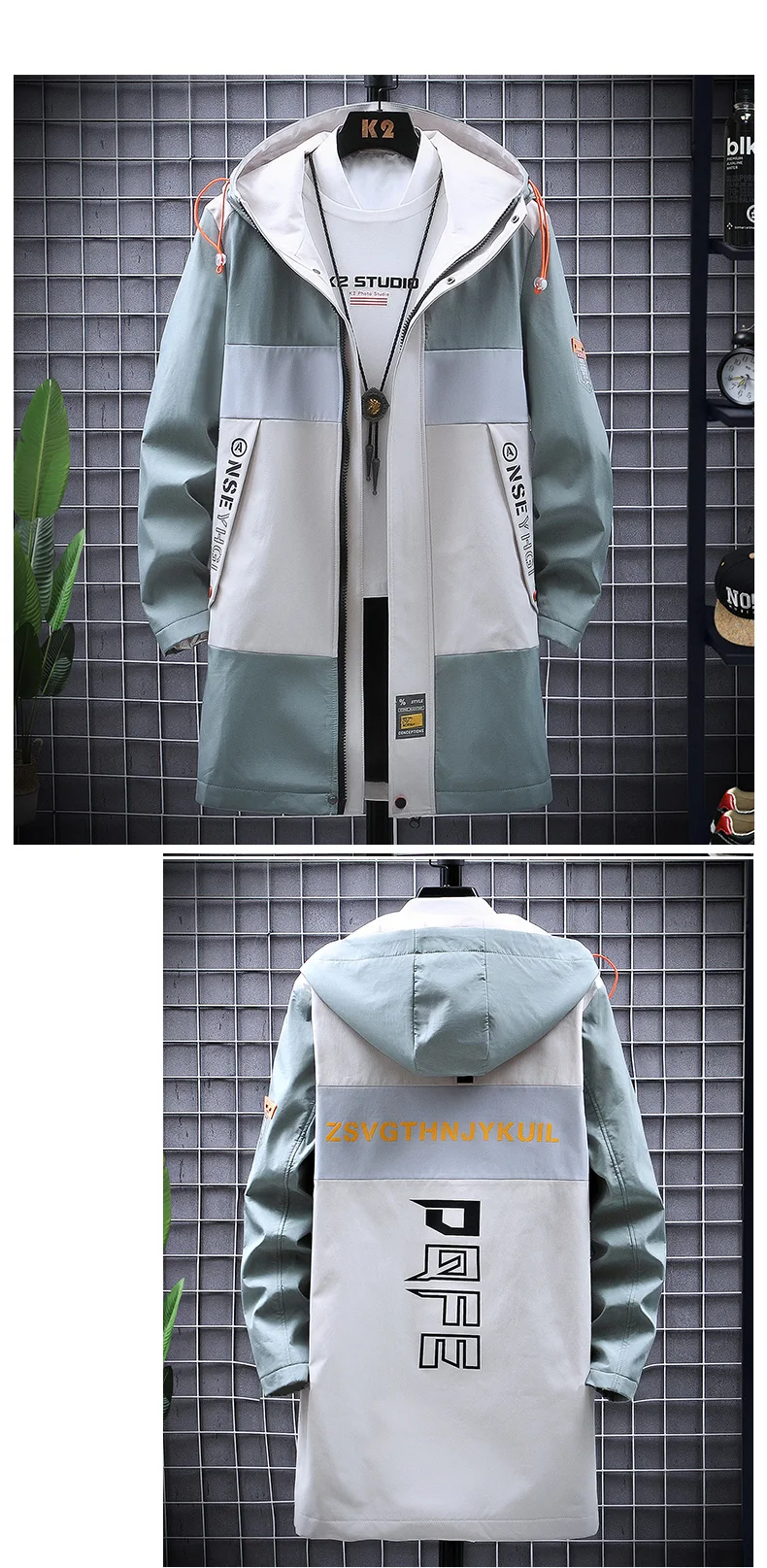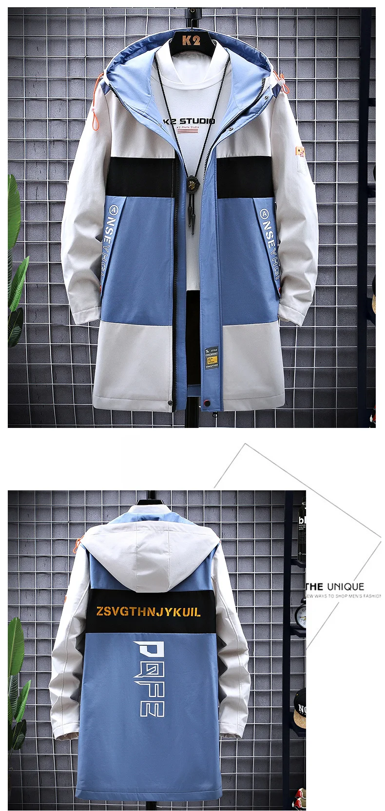 Korean Men’s Windbreaker Jackets Men Long Trench Coat Printed Cardigan Casual Hooded Coats Male 3 Color M-3XL