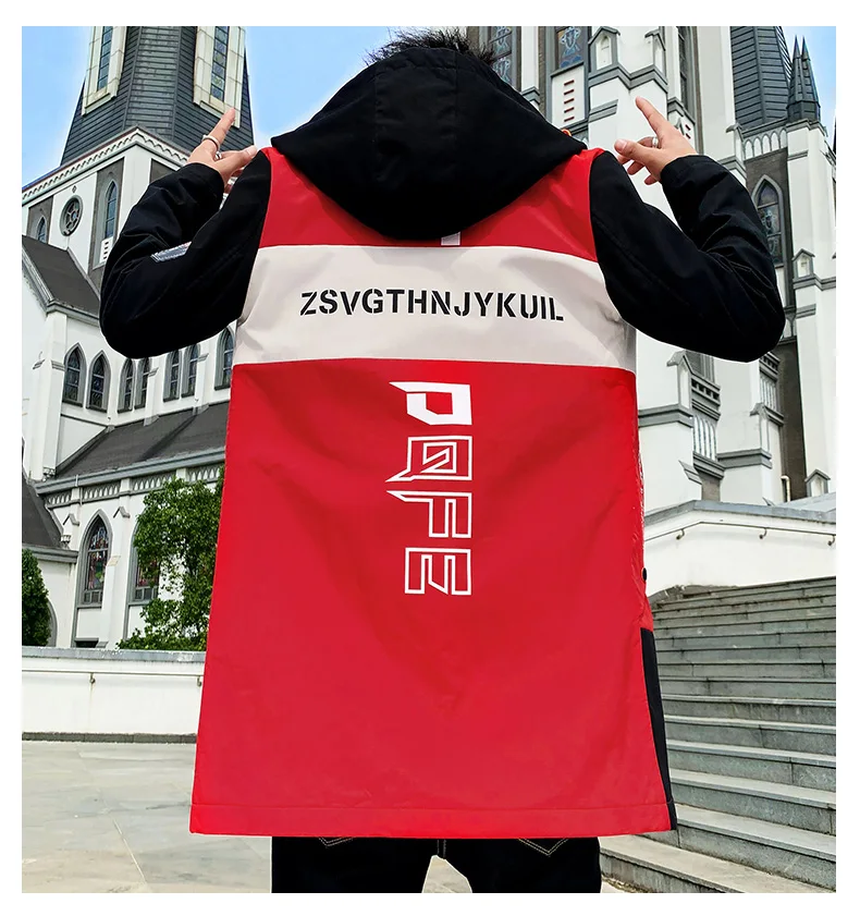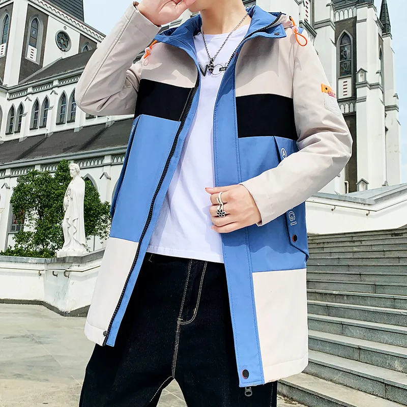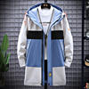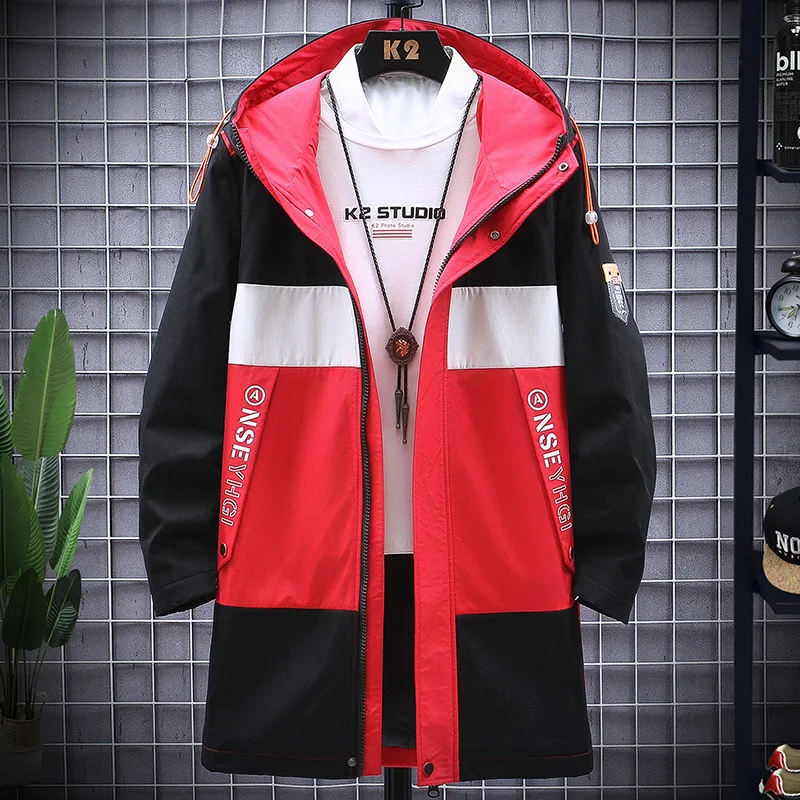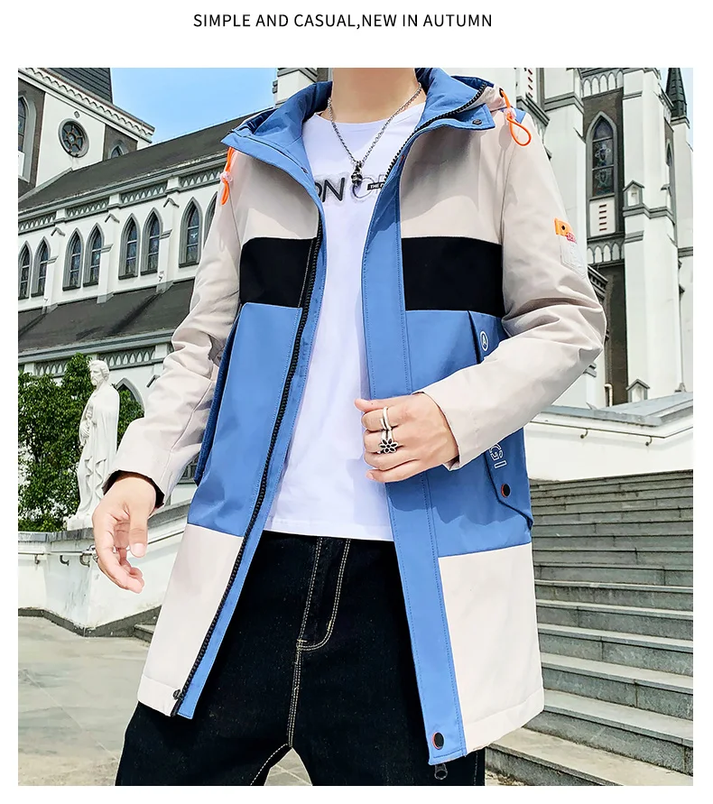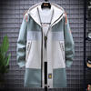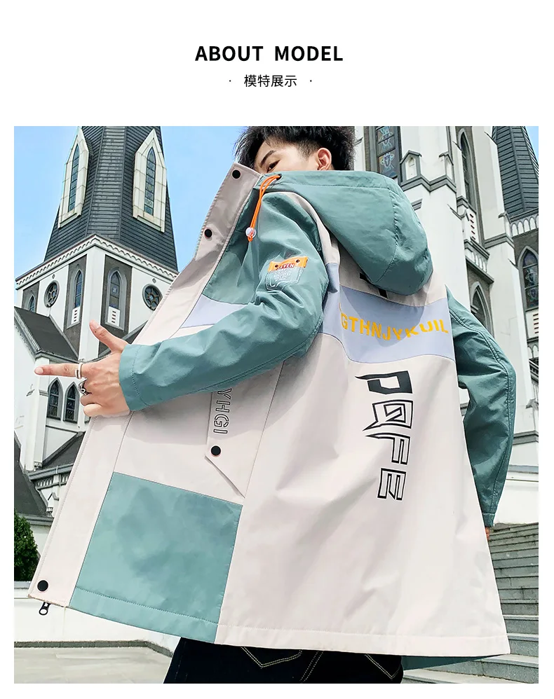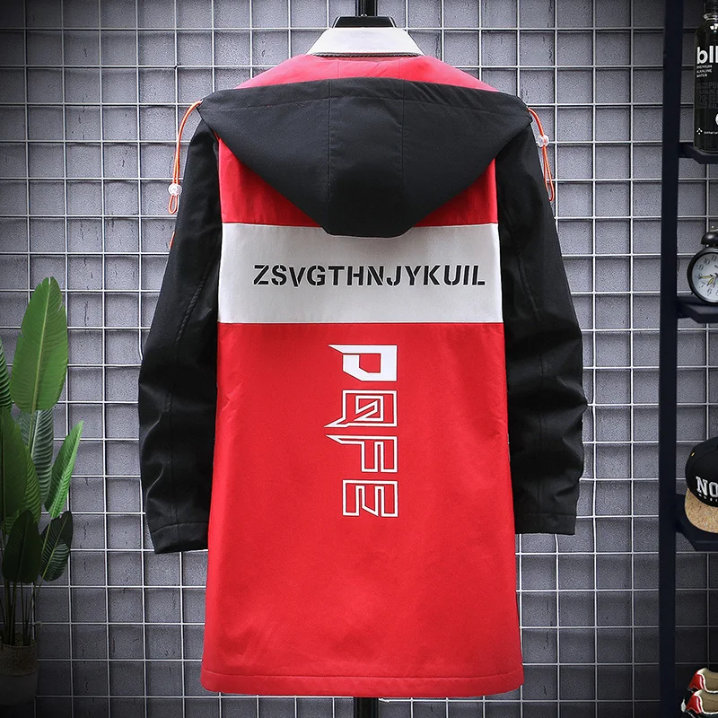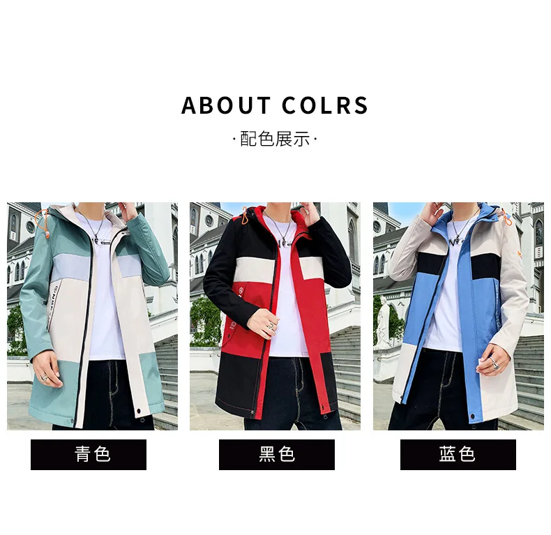 Korean Men’s Windbreaker Jackets Men Long Trench Coat Printed Cardigan Casual Hooded Coats Male 3 Color M-3XL