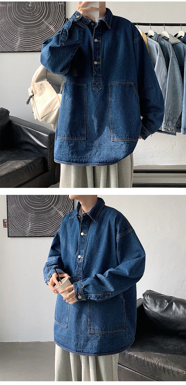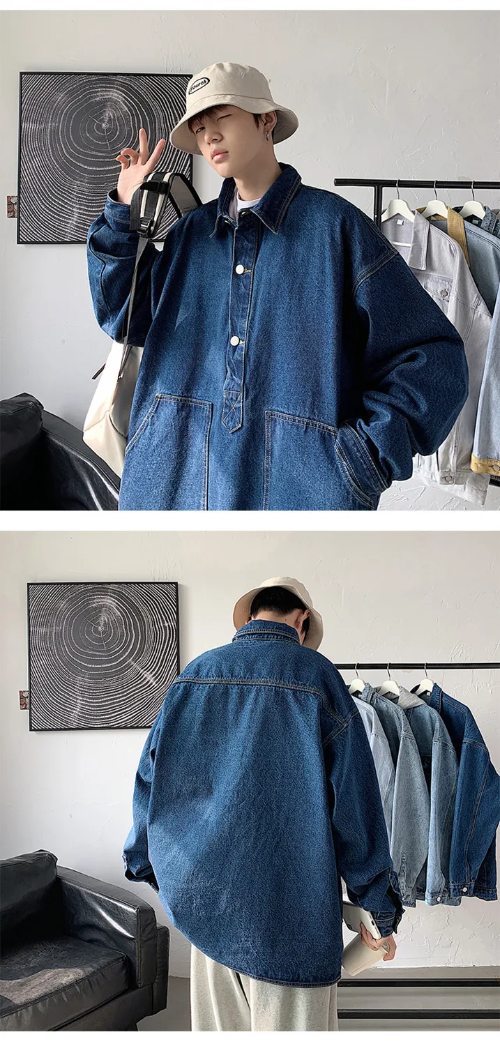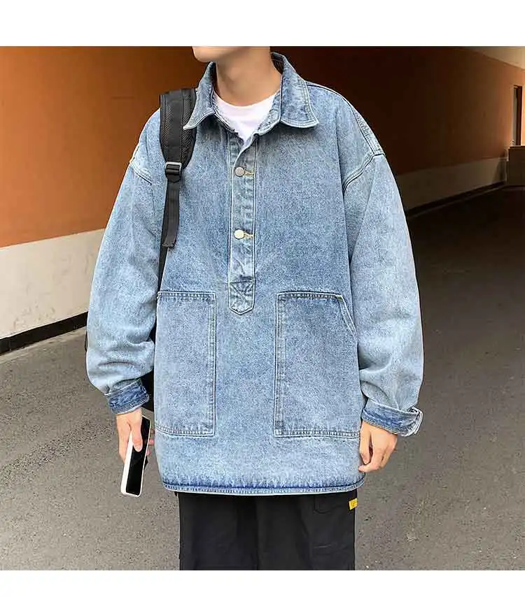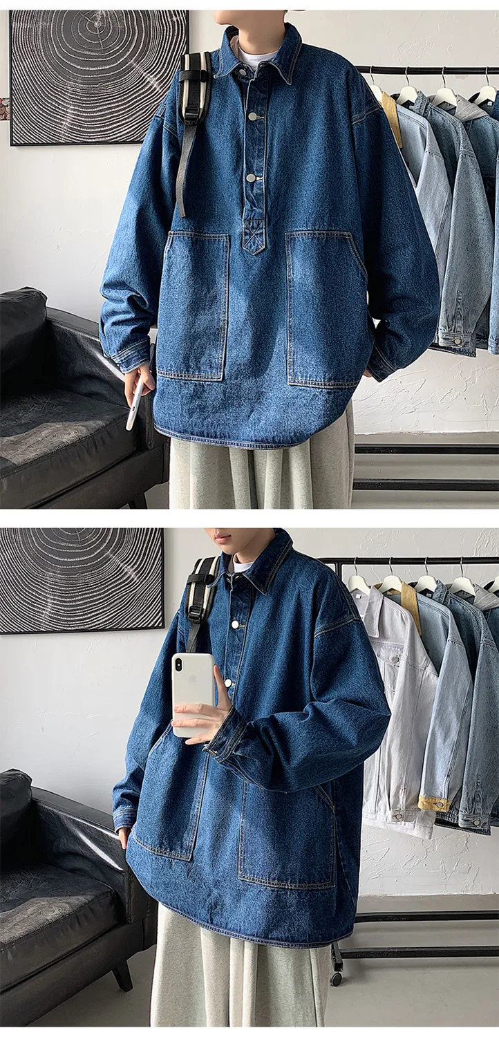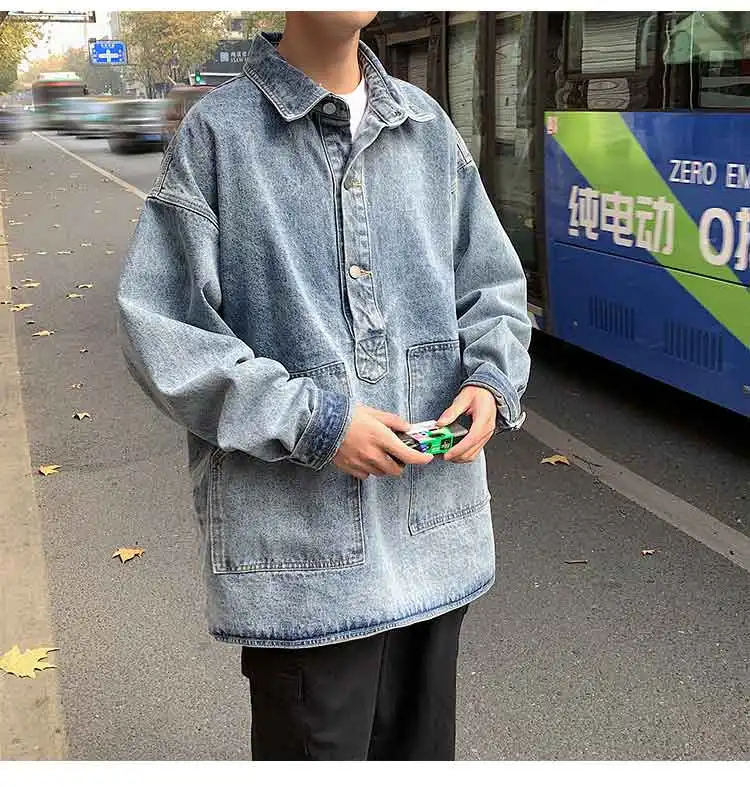 Korean Pullover Denim Jacket Men’s Fashion Retro Pocket Denim Jackets Mens Streetwear Loose Hip-hop Bomber Jacket Men S-2XL