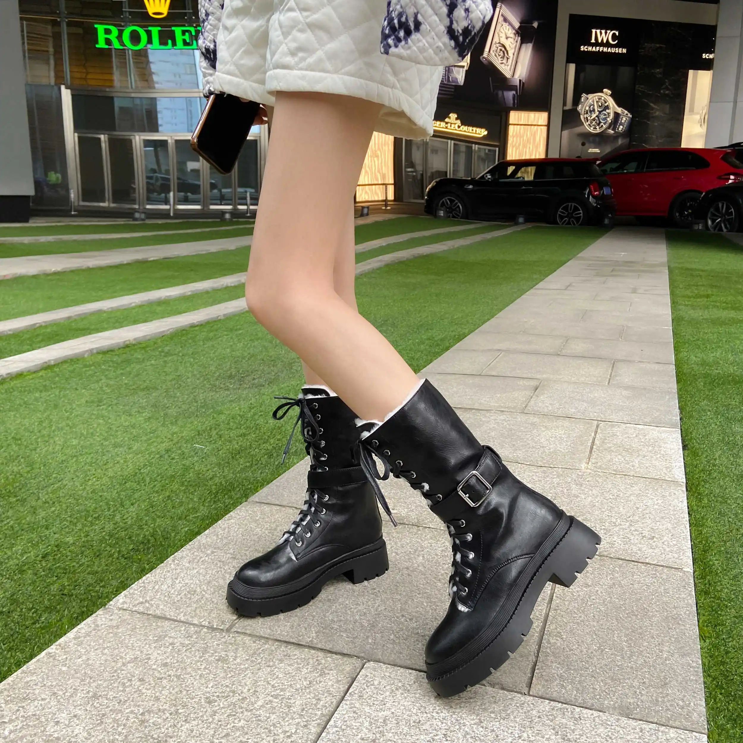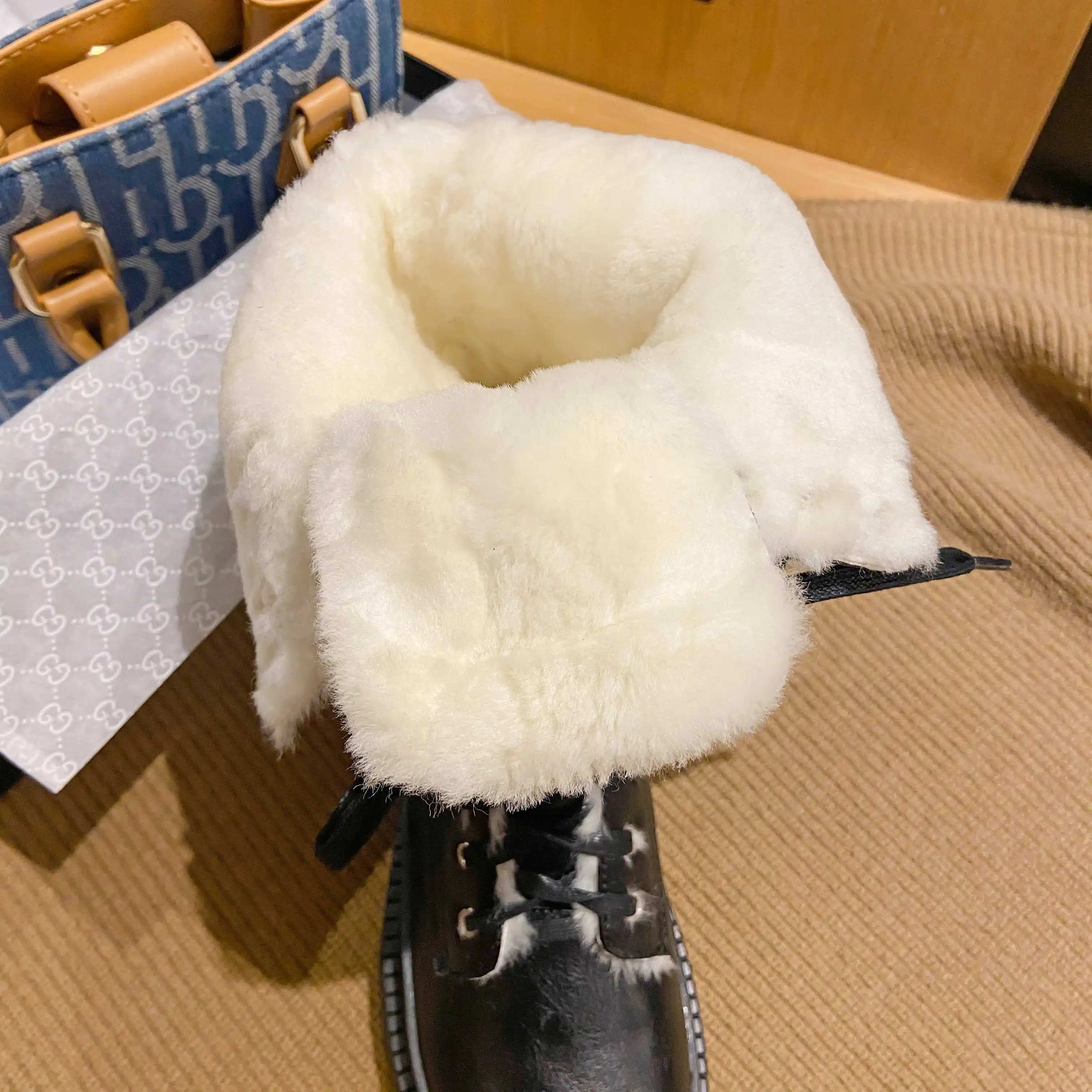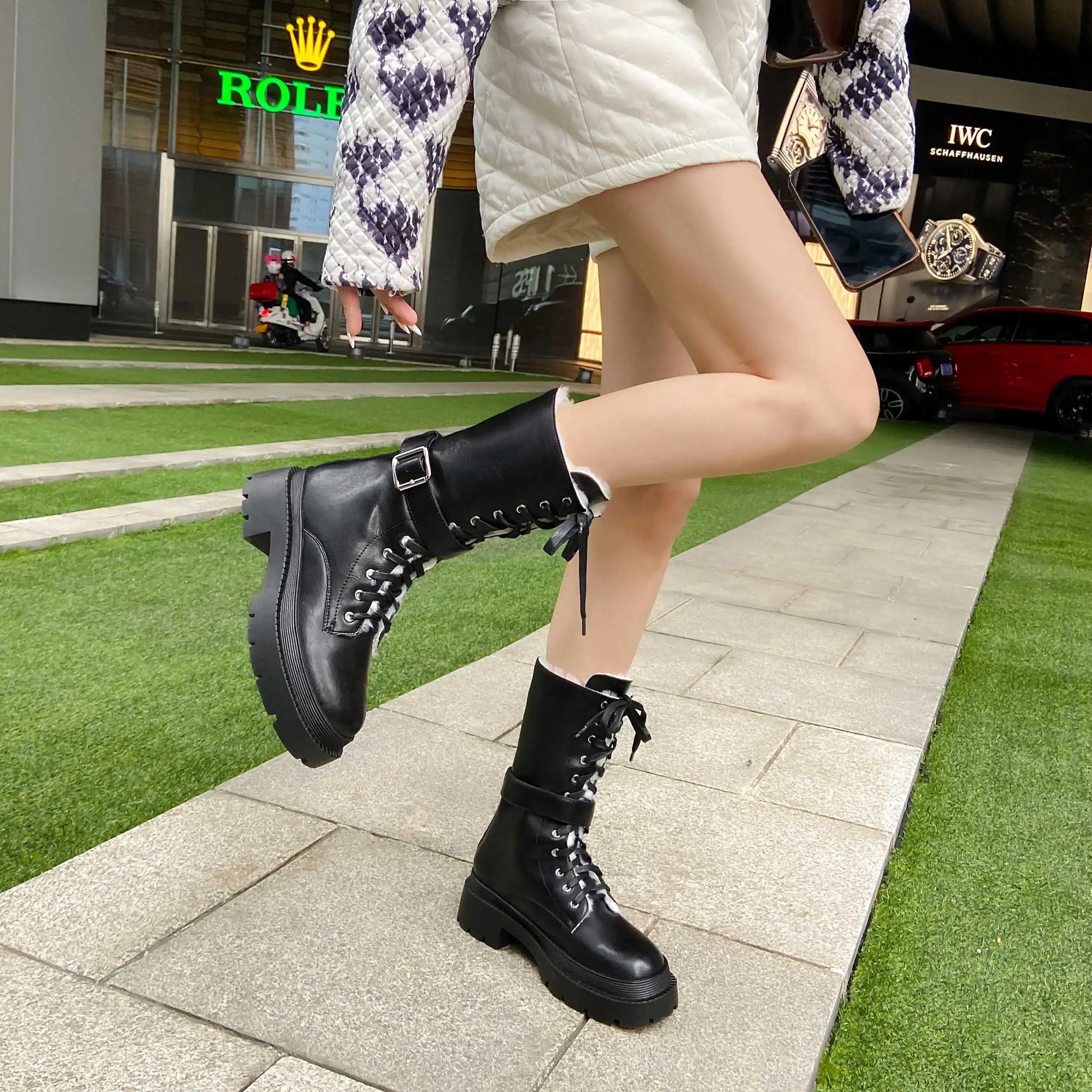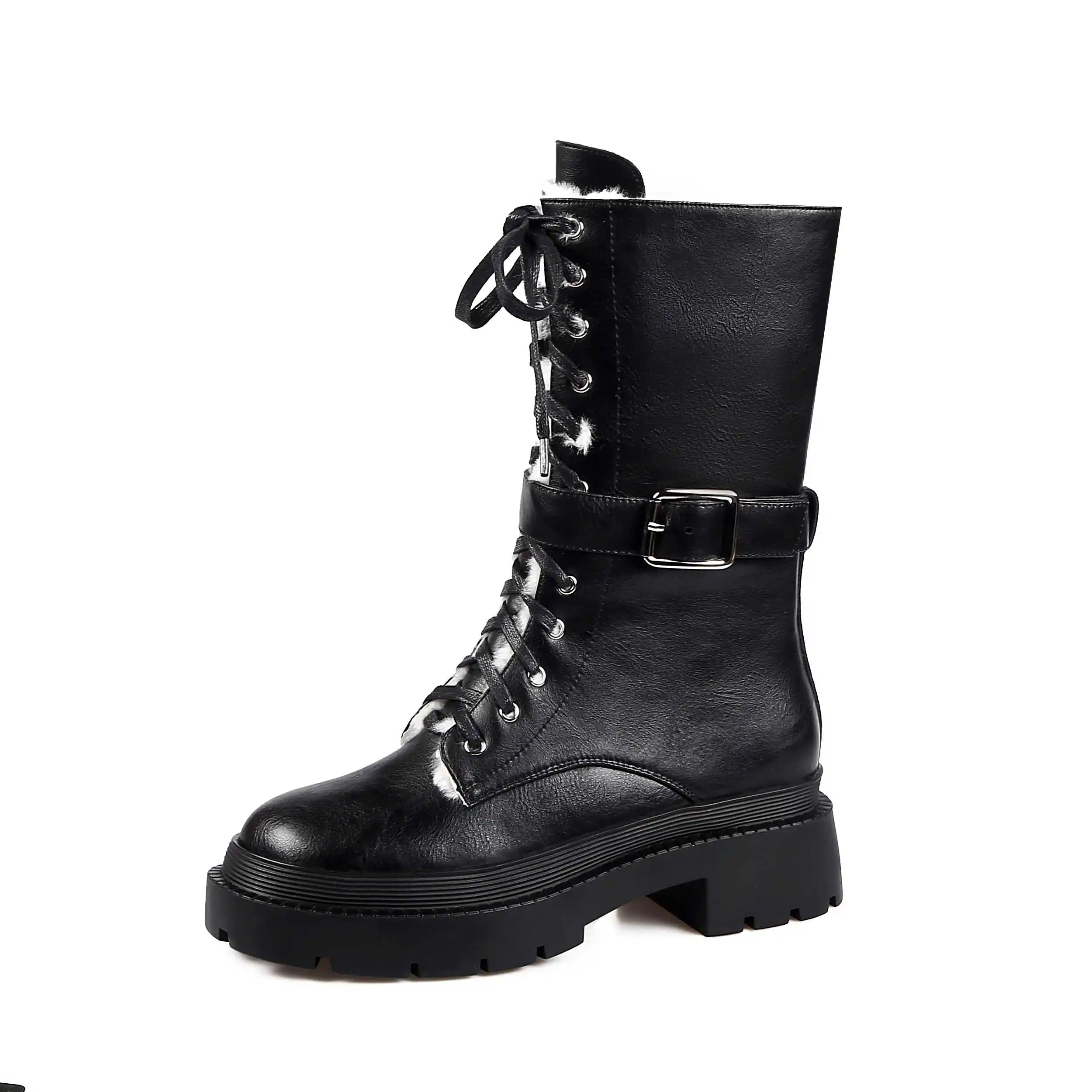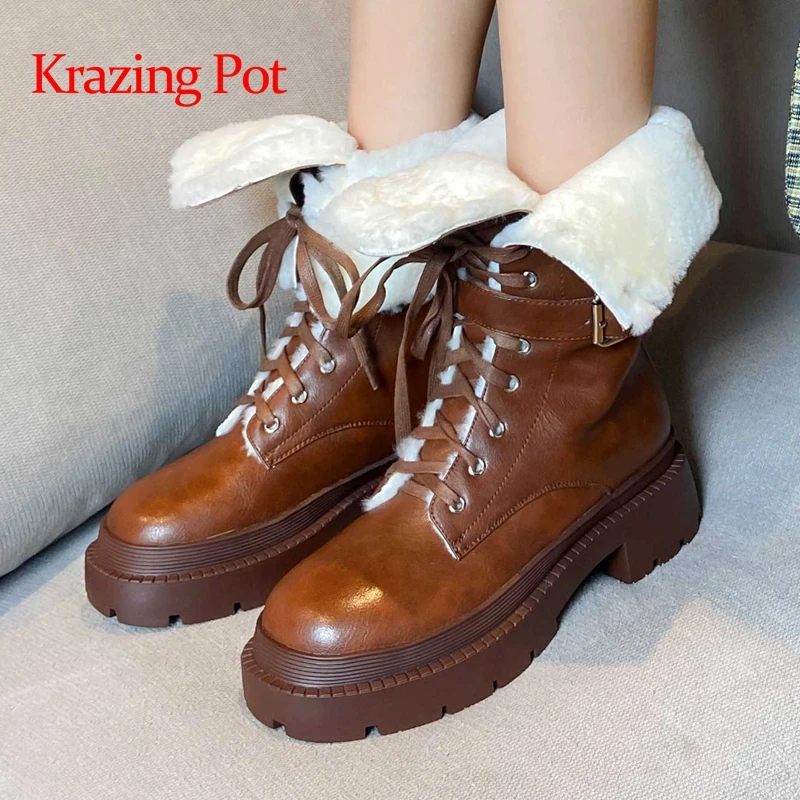 Krazing Pot Cold-resistant Cow Split Leather Round Toe Thick Bottom Snow Boots Punk Winter Keep Warm Fur Fashion Mid-calf Boots