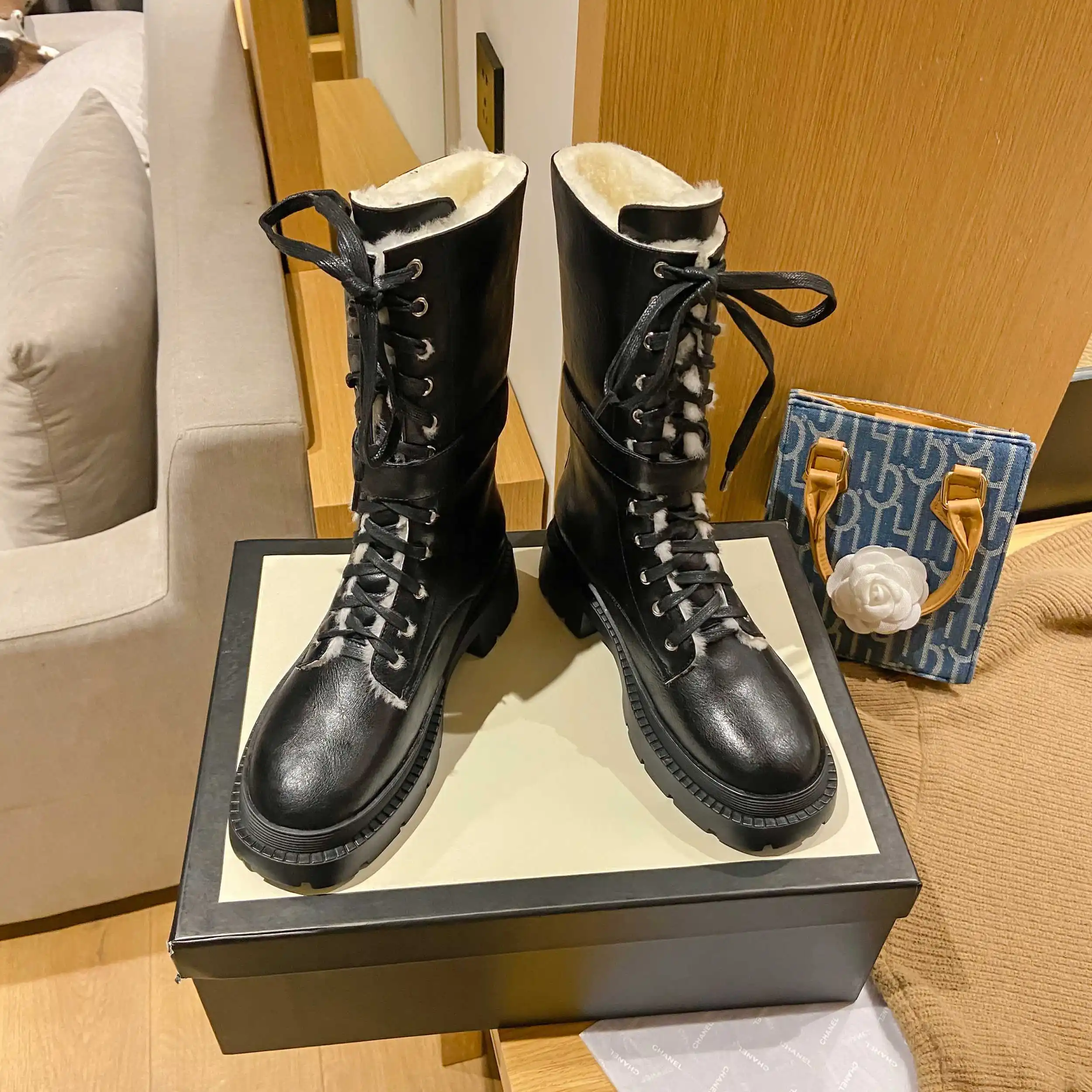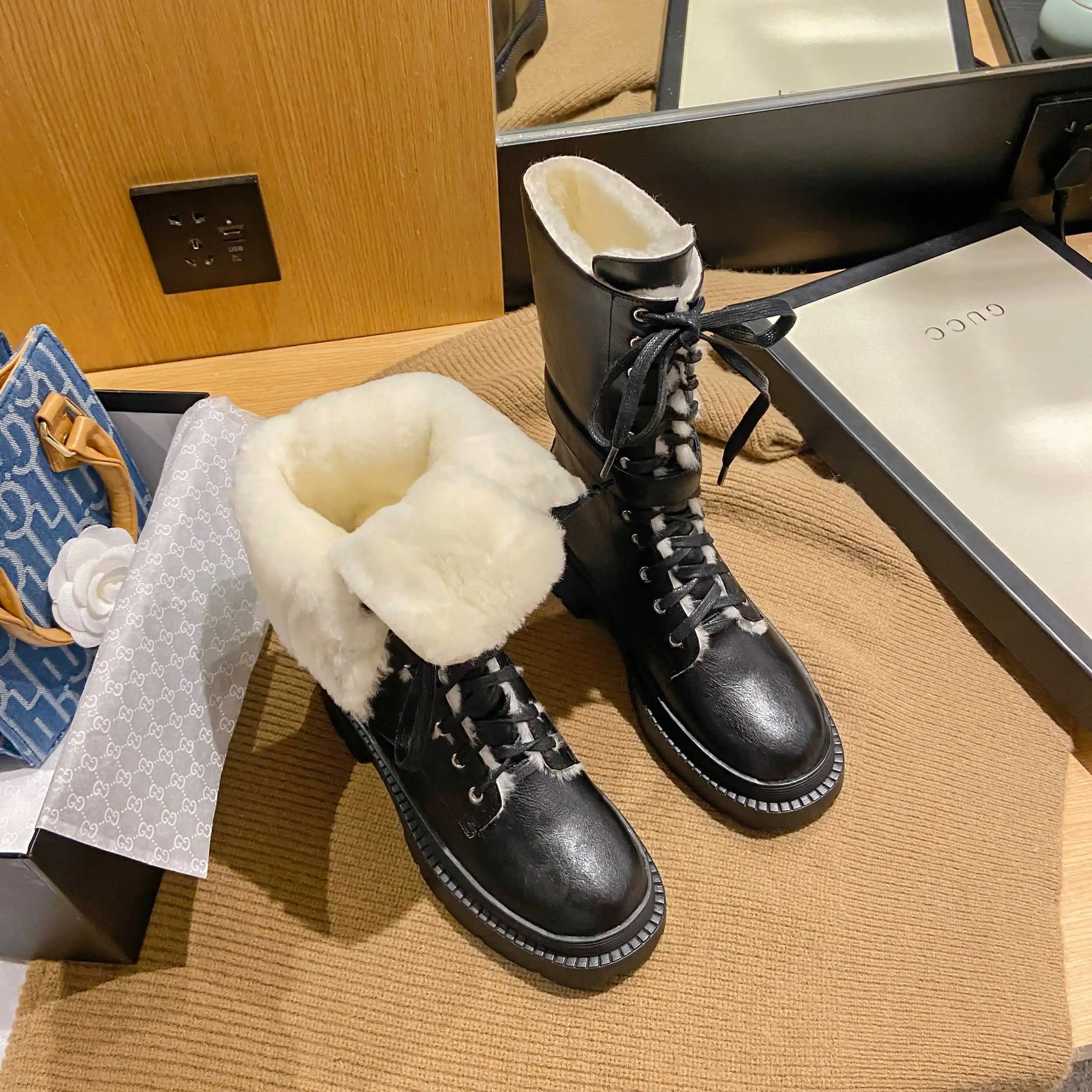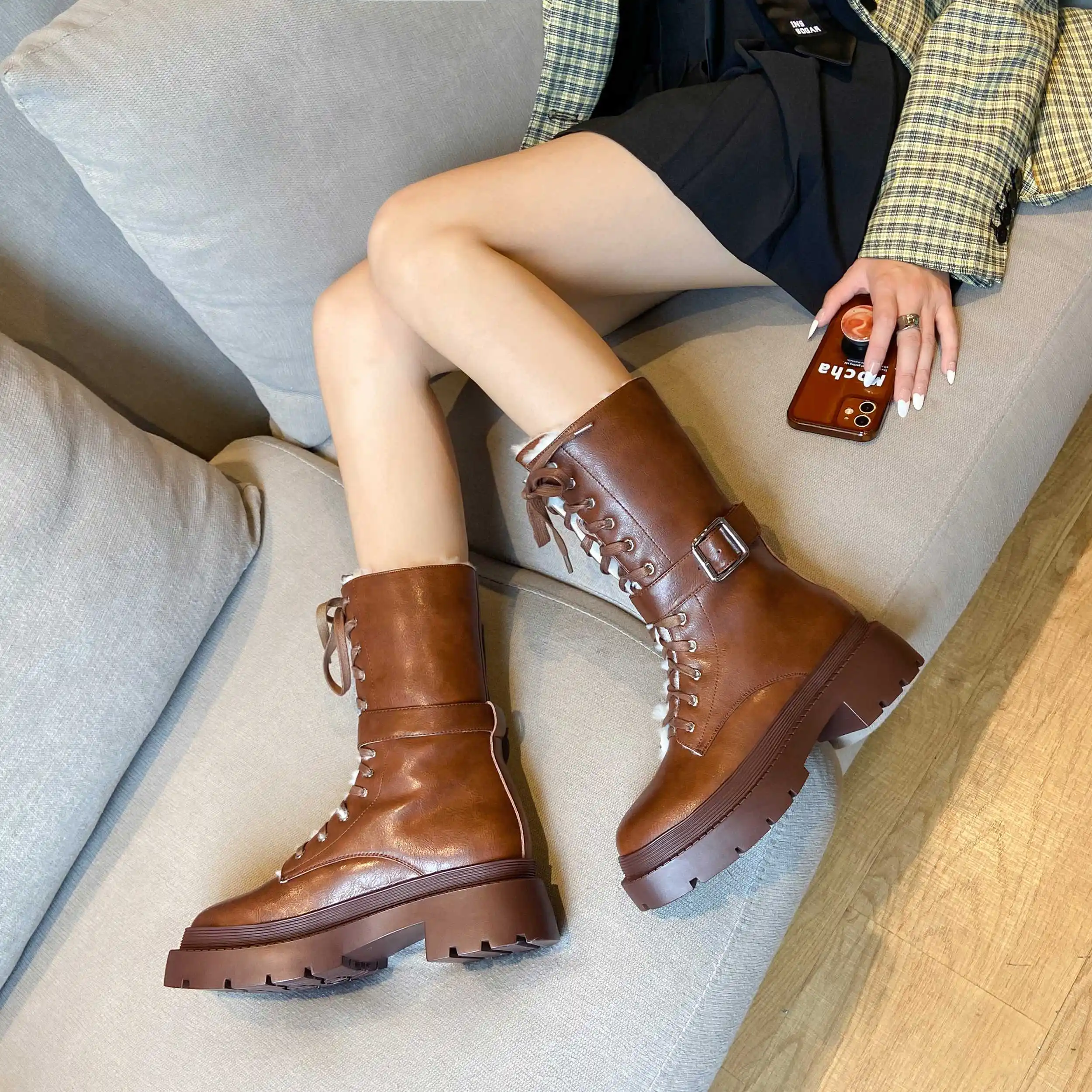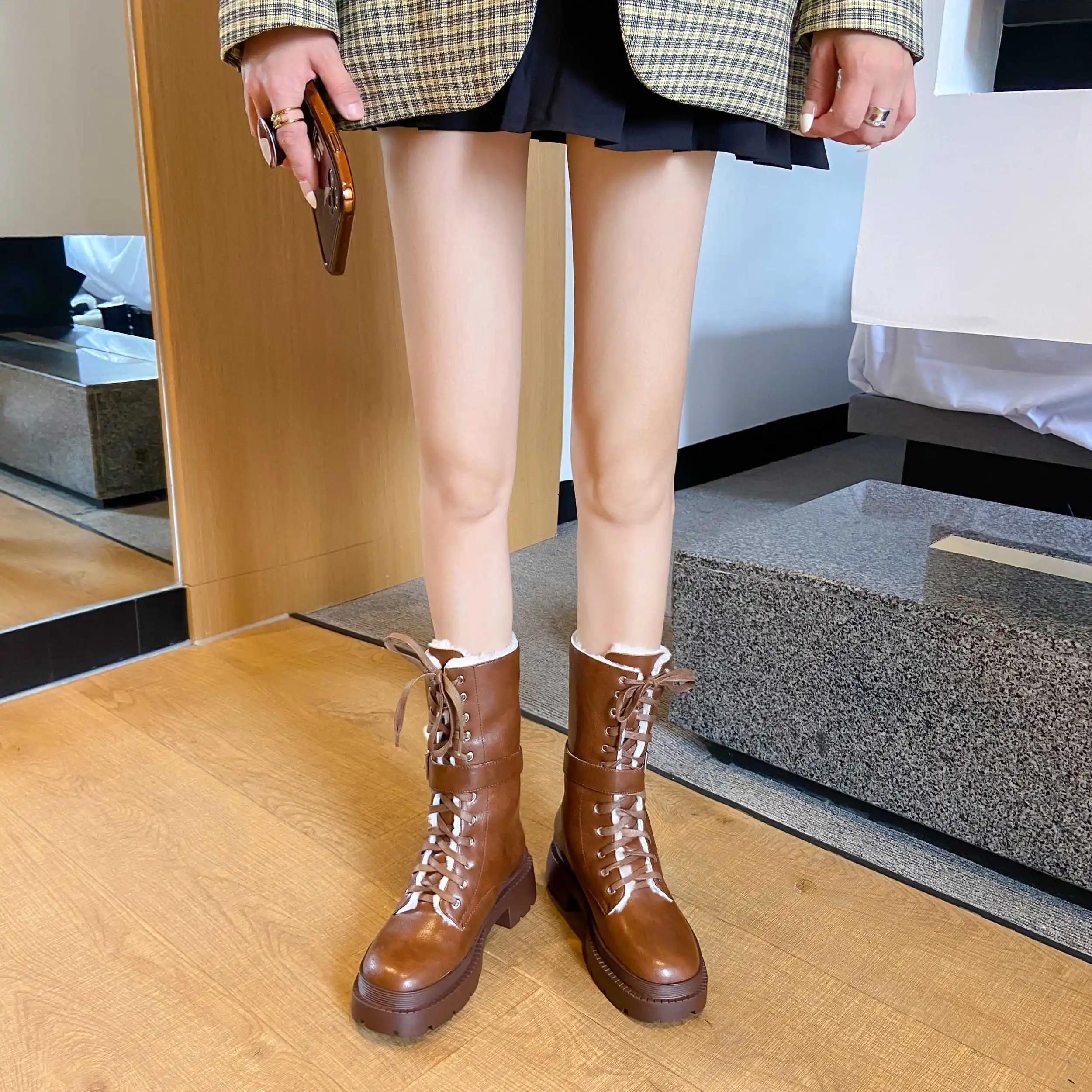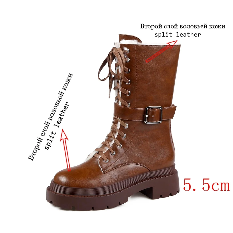 Krazing Pot Cold-resistant Cow Split Leather Round Toe Thick Bottom Snow Boots Punk Winter Keep Warm Fur Fashion Mid-calf Boots