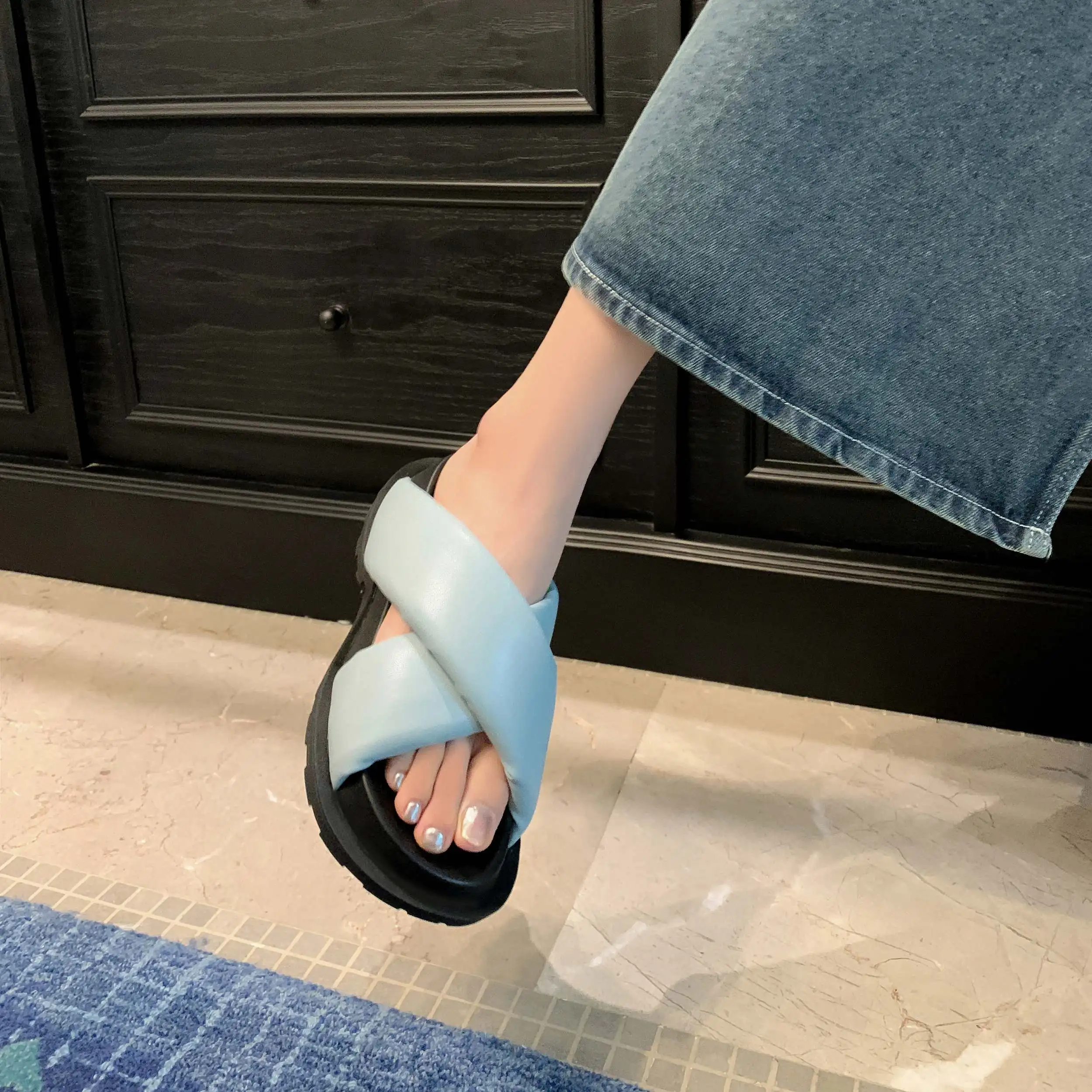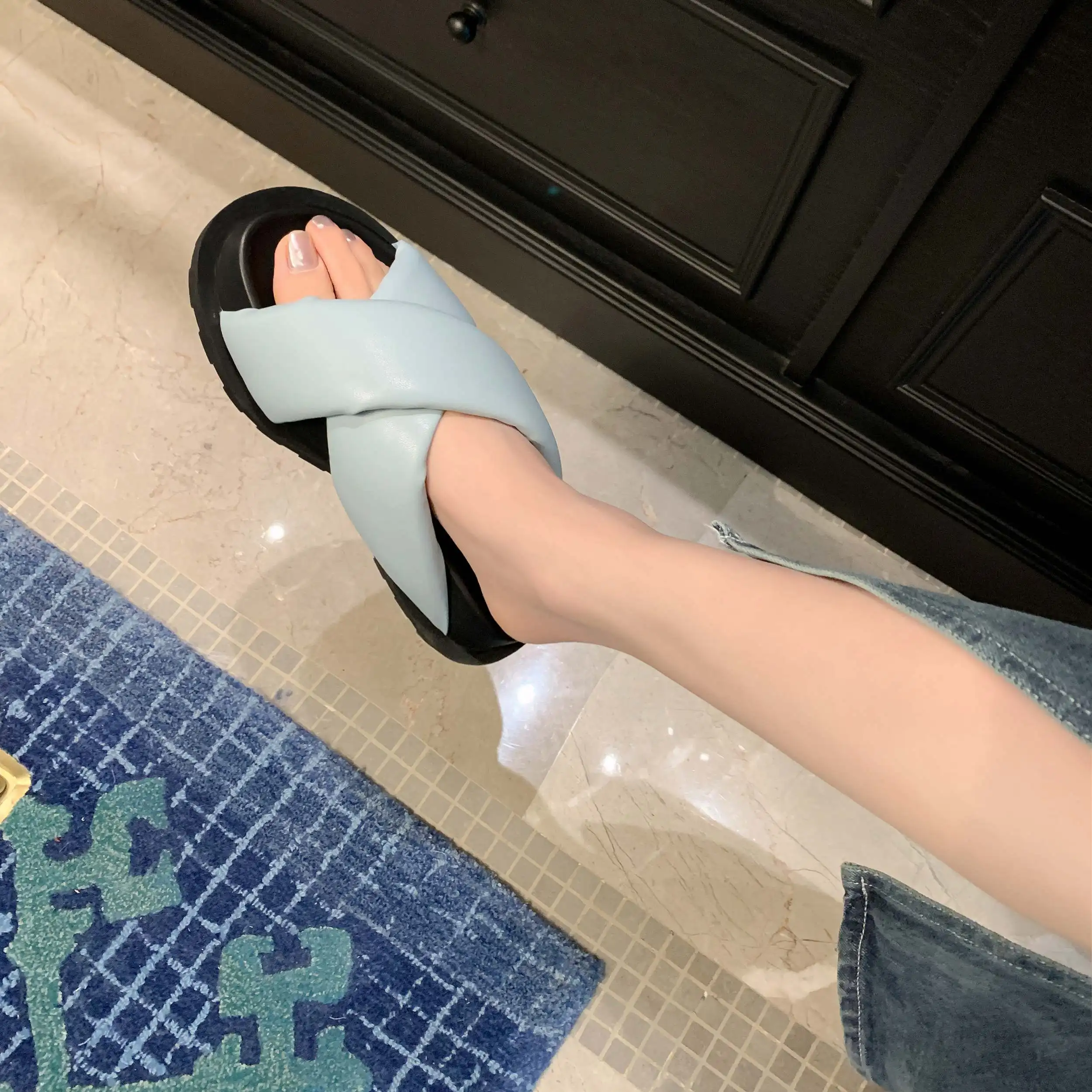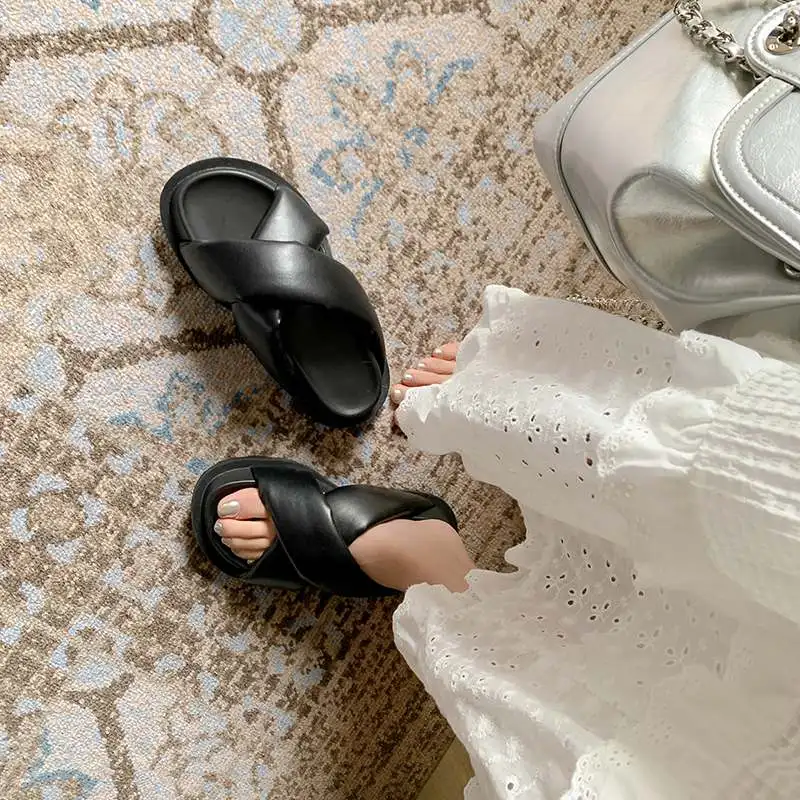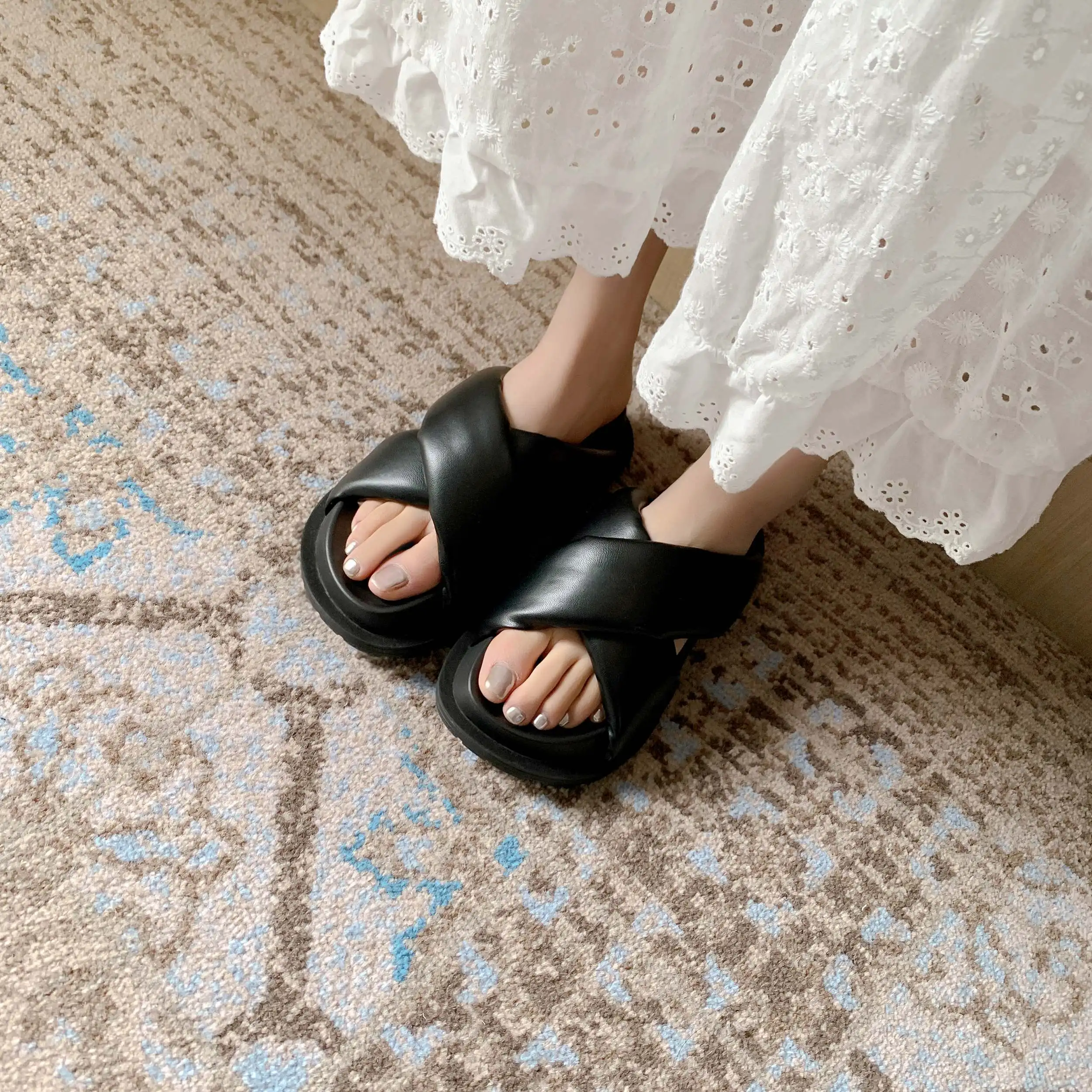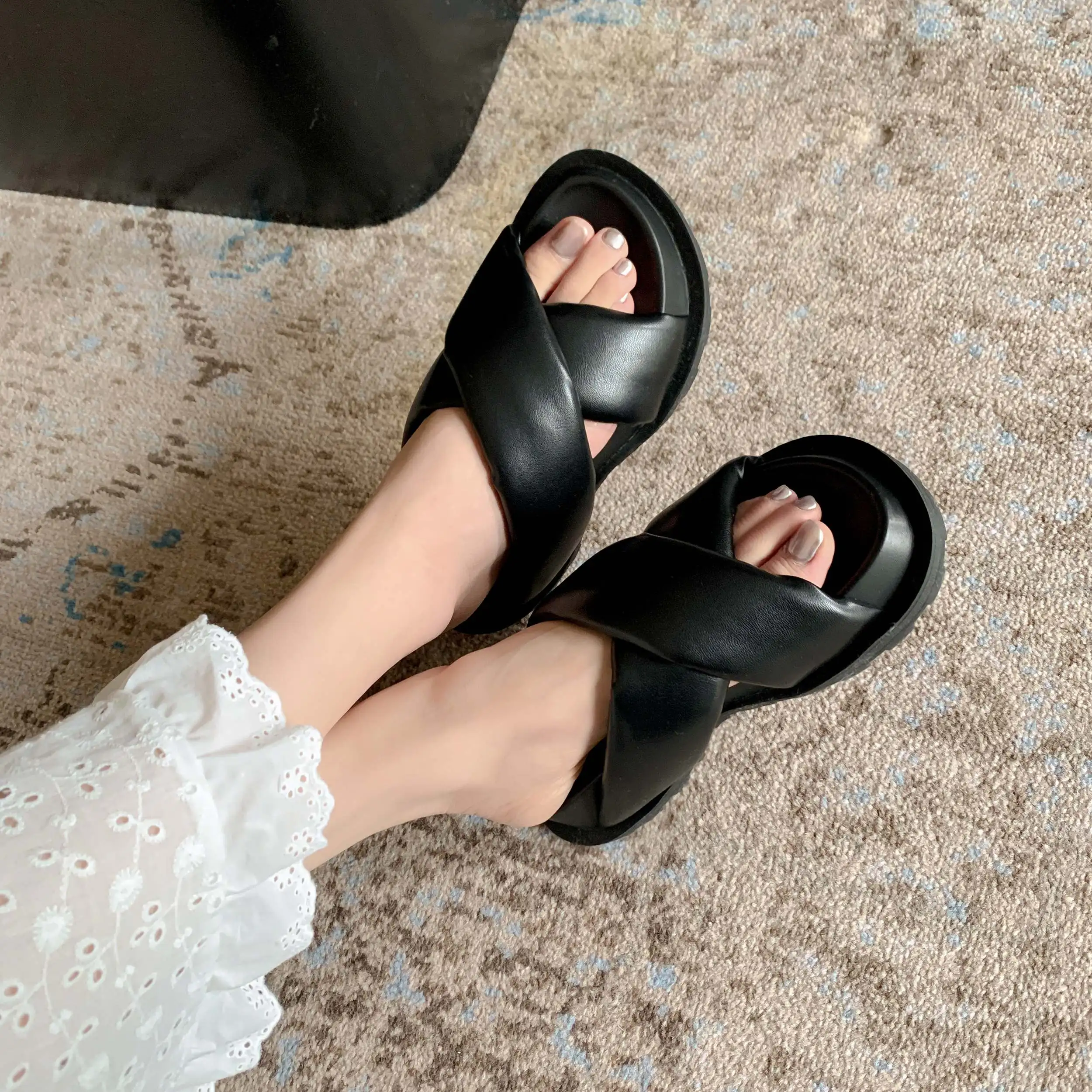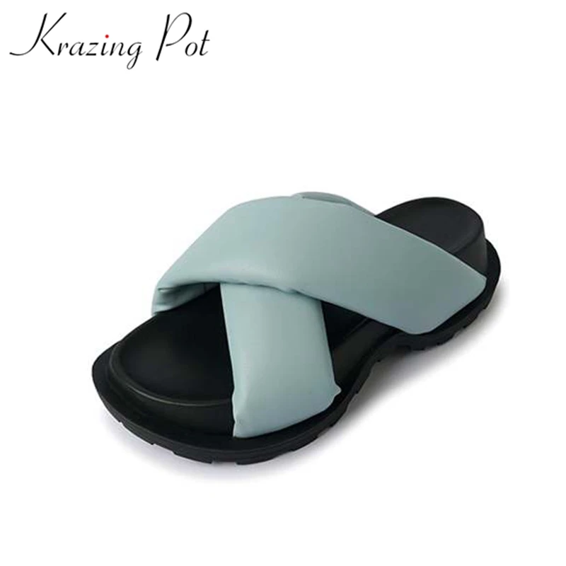 Krazing Pot Fashion Sheep Leather Med Heels Mules Flat Platform Slingback Summer Beach Shoes Dating Women Cozy Outside Slippers