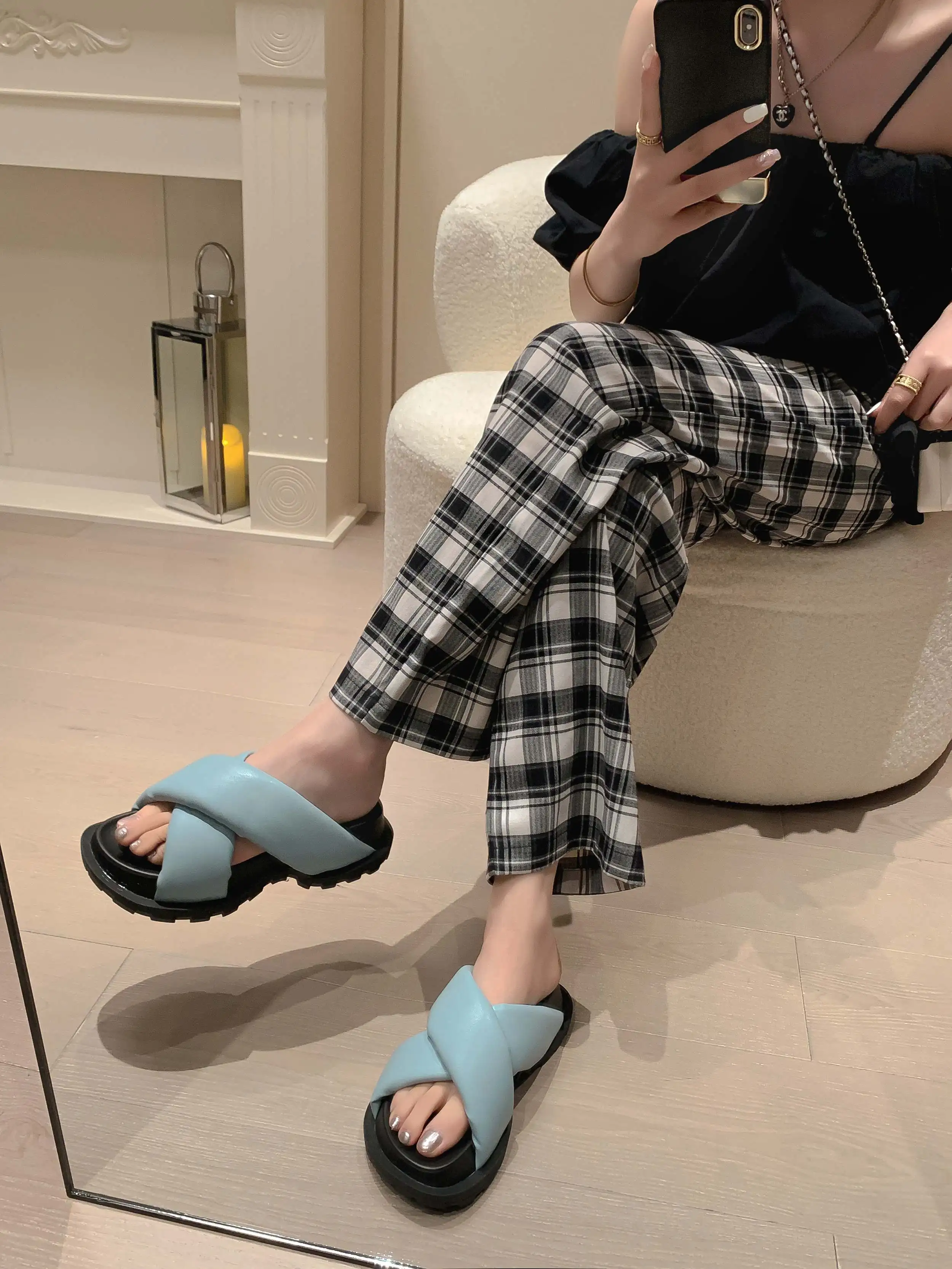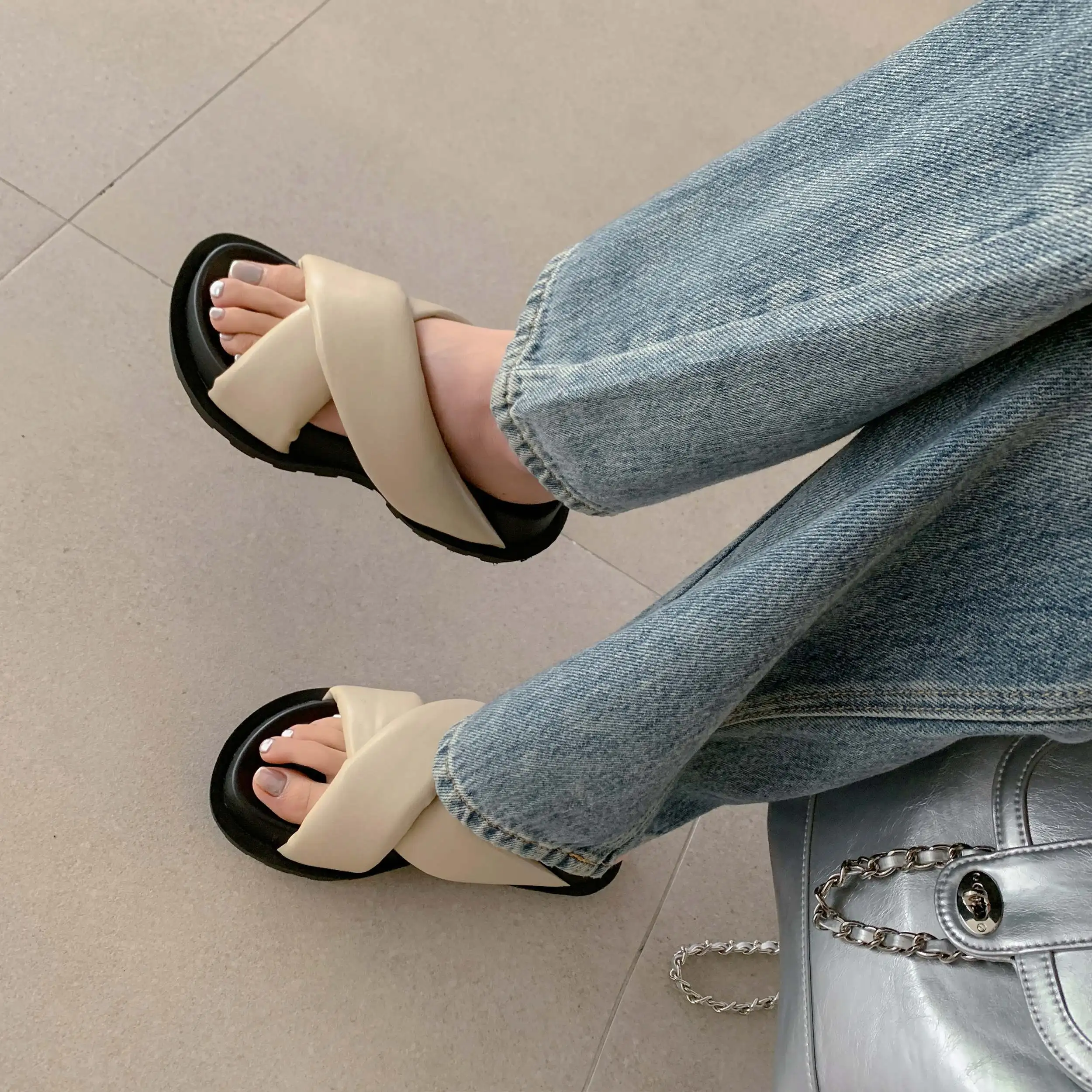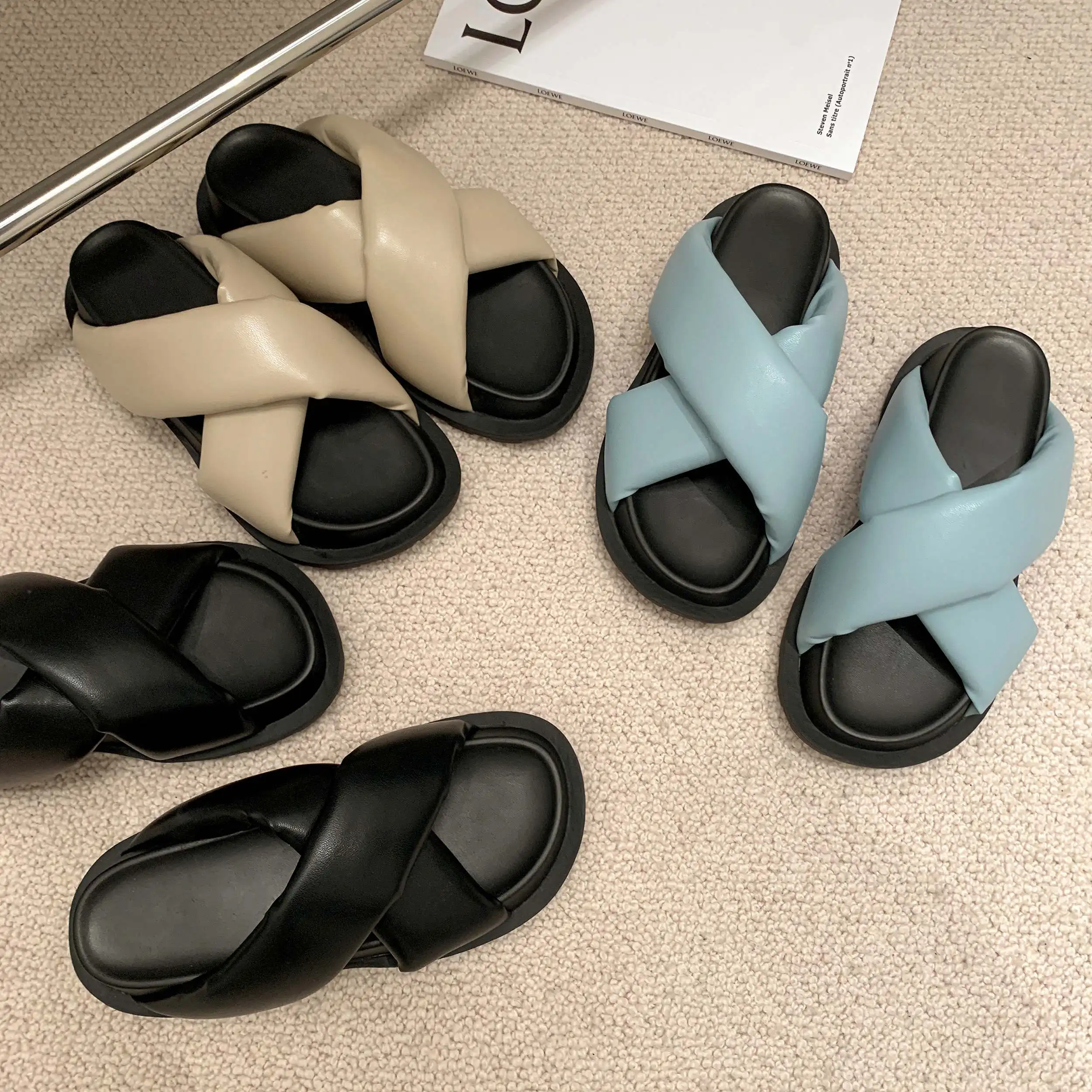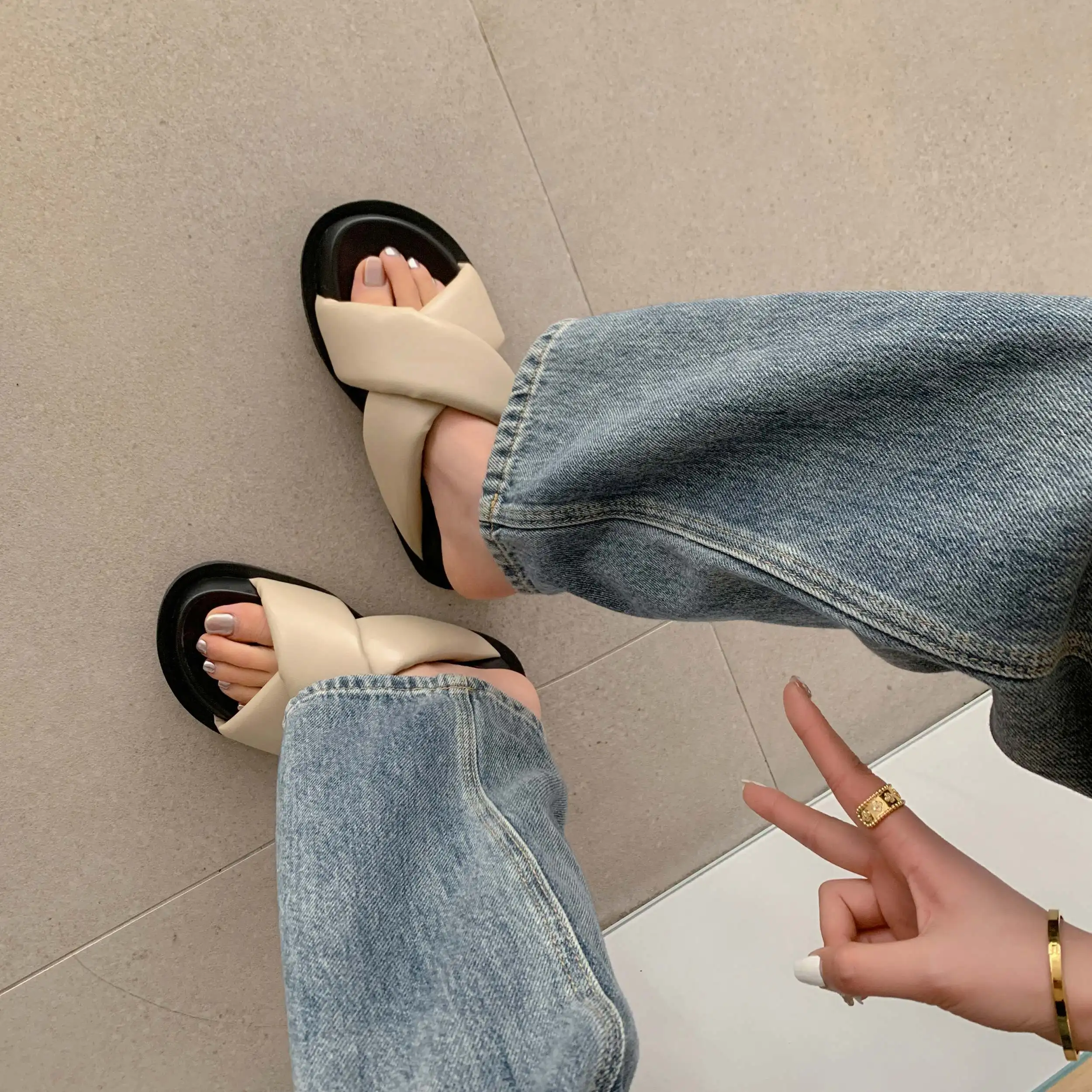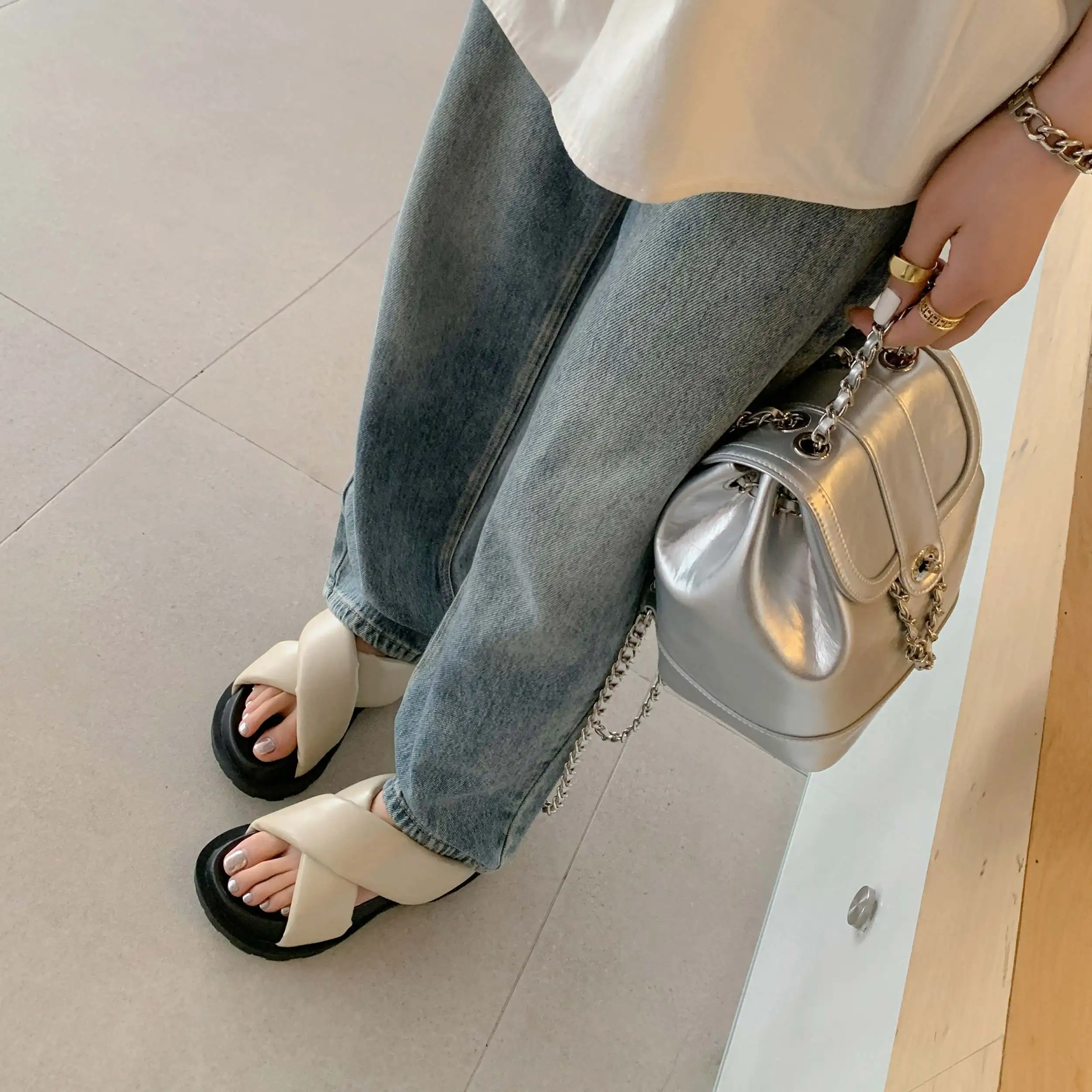Krazing Pot Fashion Sheep Leather Med Heels Mules Flat Platform Slingback Summer Beach Shoes Dating Women Cozy Outside Slippers