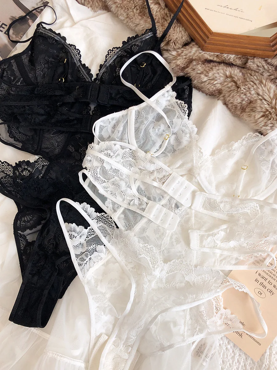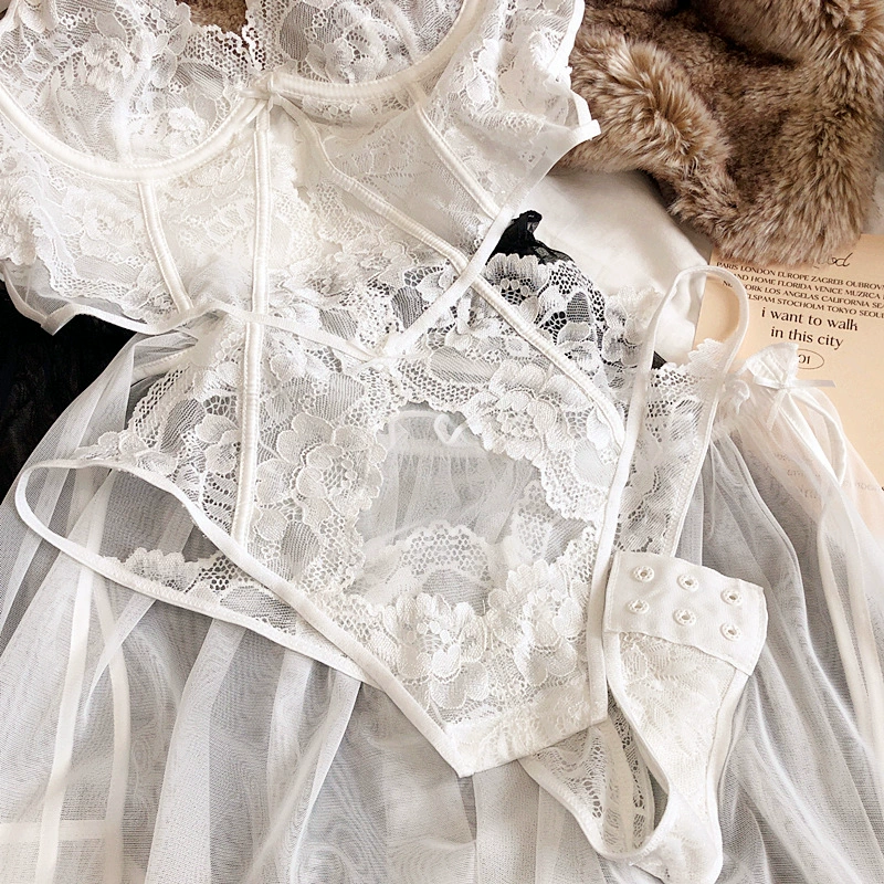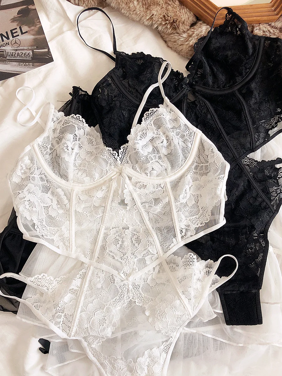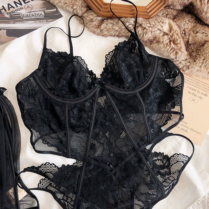 Lace jumpsuit underwear can be separated short sarong sexy ultra-thin soft steel ring bra hollow lace lingerie