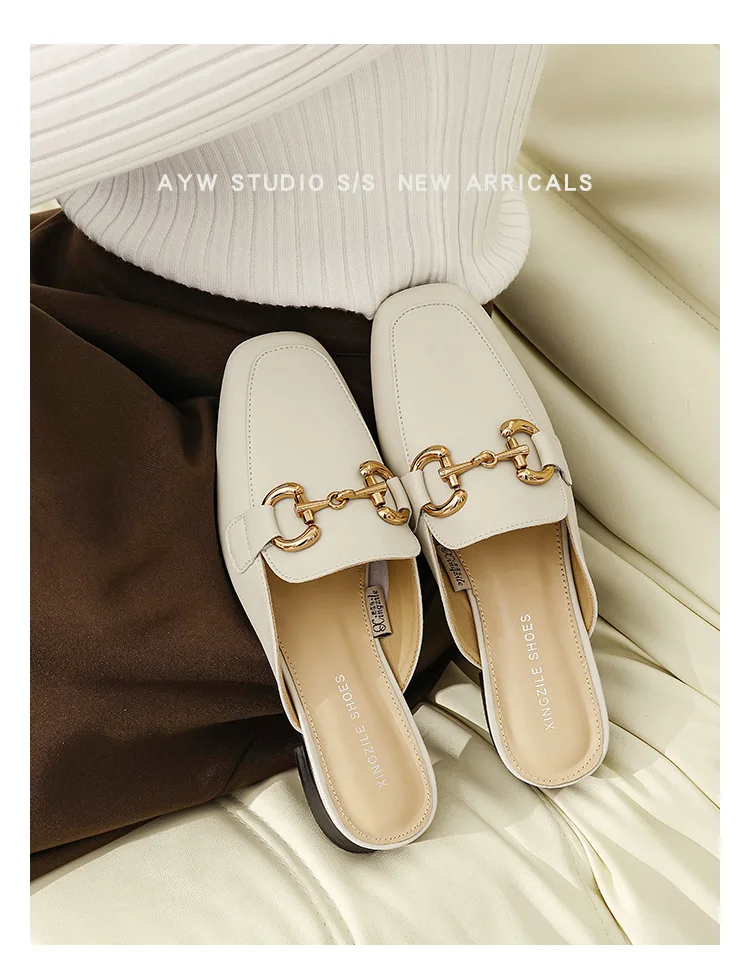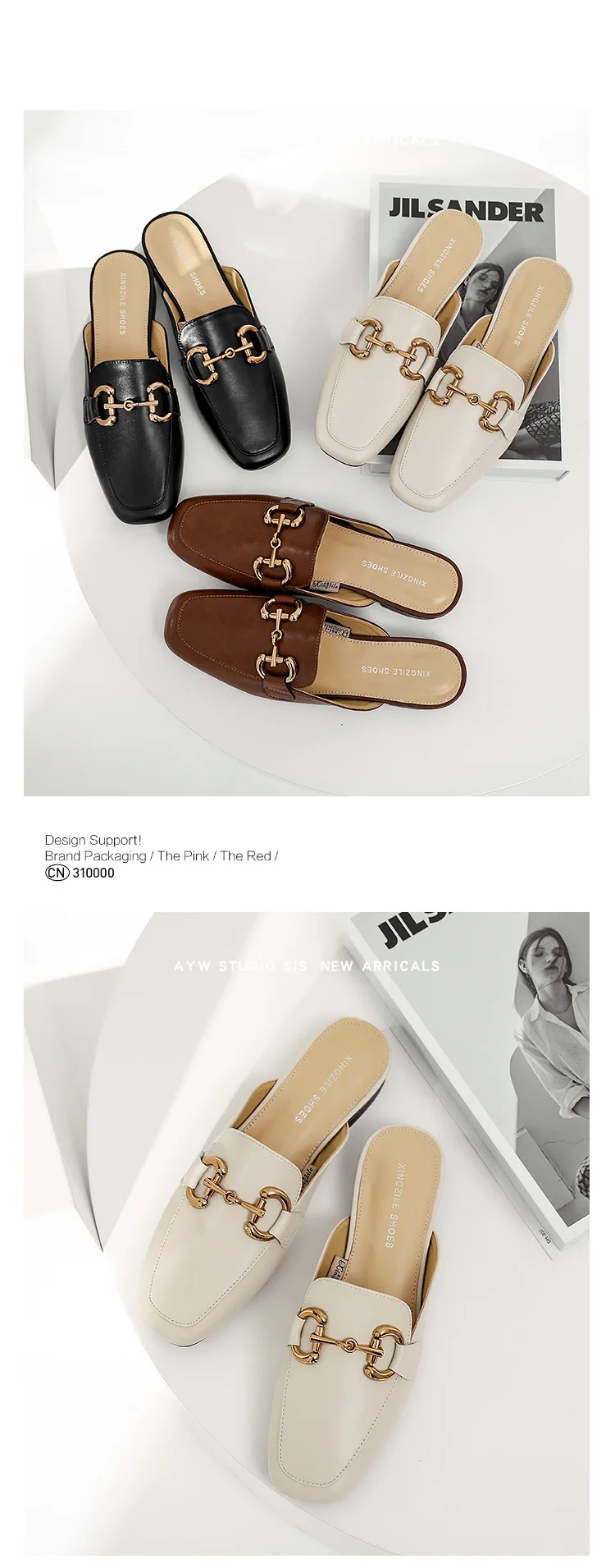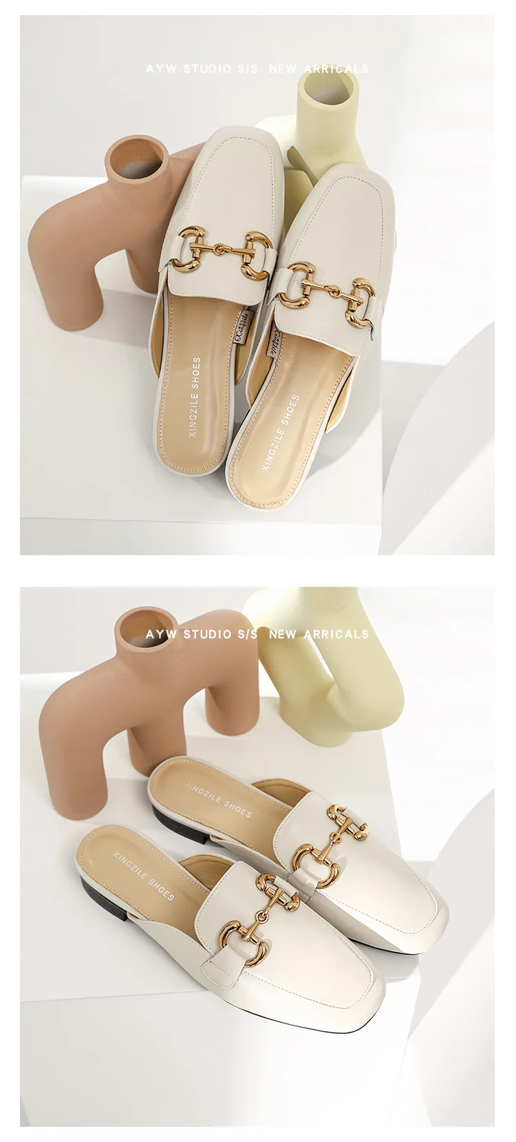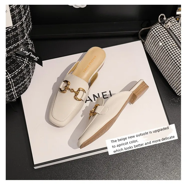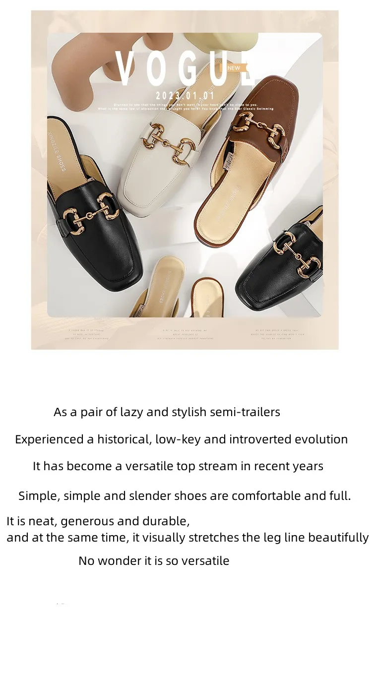 Leather Baotou semi-slippers women wear 2023 new horse-bit buckle sandals without heels lazy shoes flat Muller shoes.