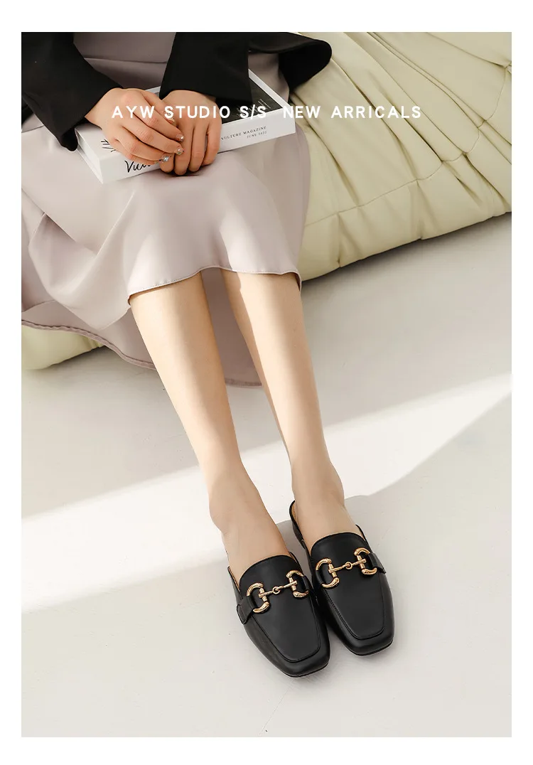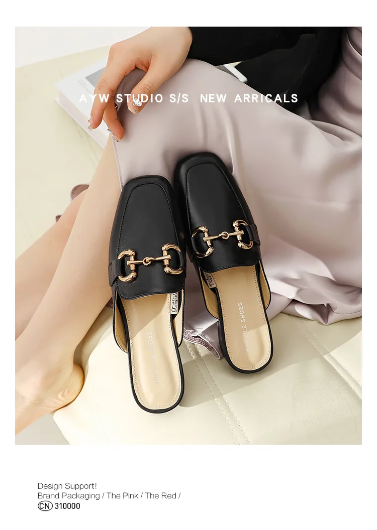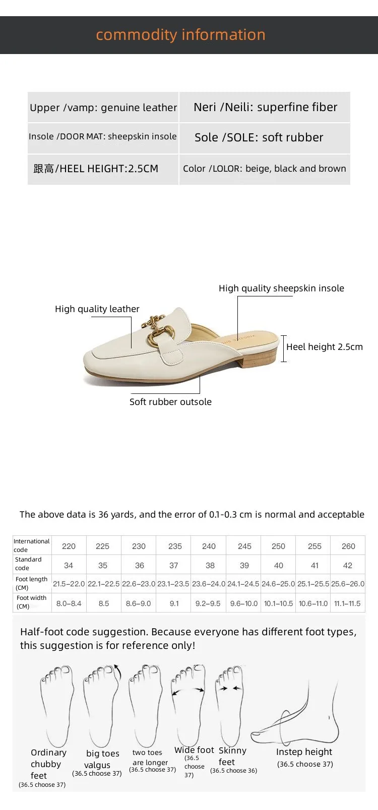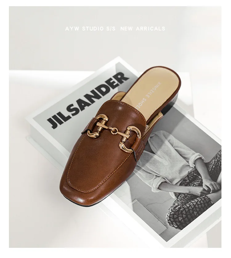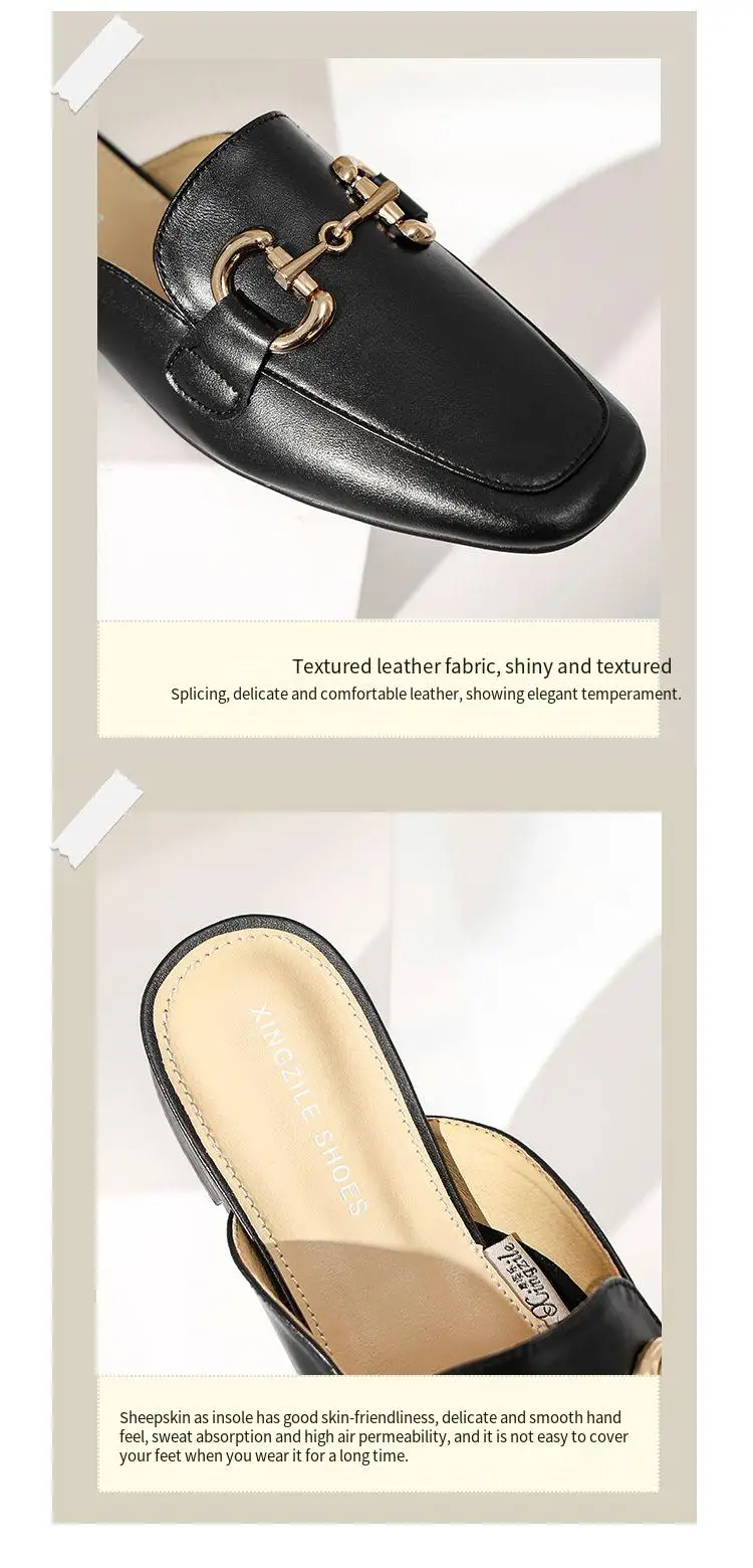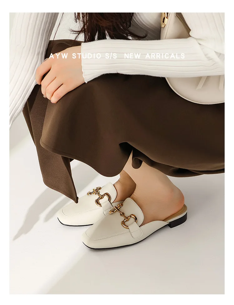Leather Baotou semi-slippers women wear 2023 new horse-bit buckle sandals without heels lazy shoes flat Muller shoes.