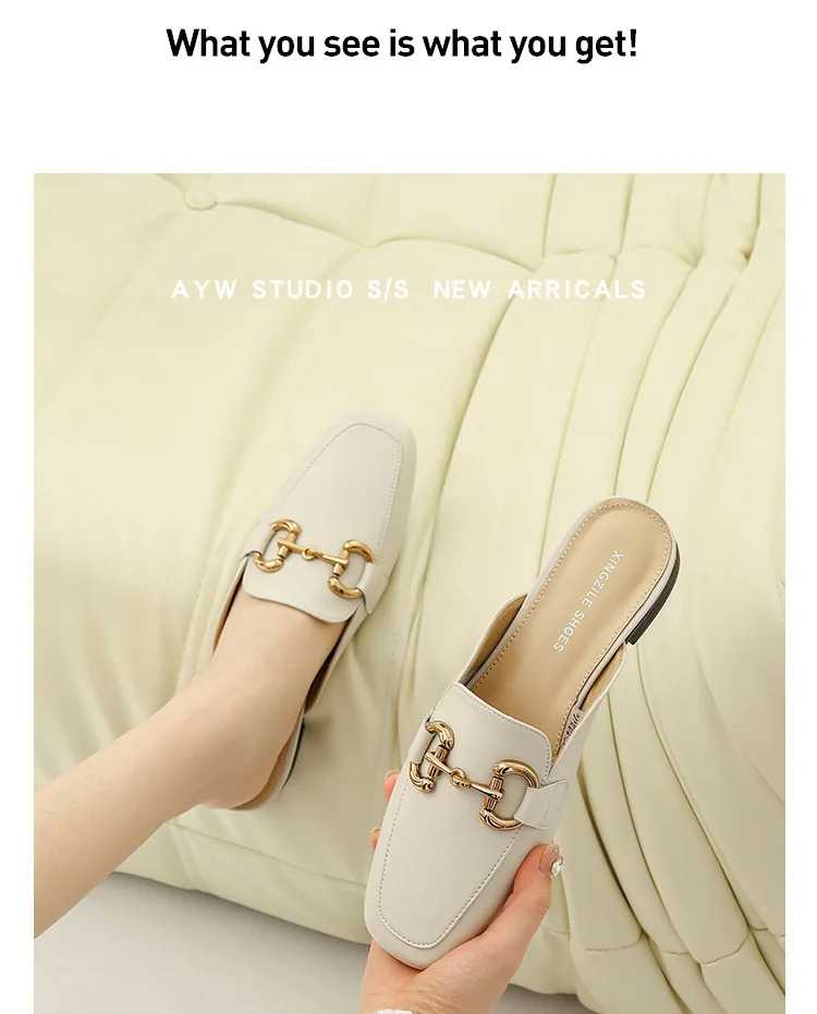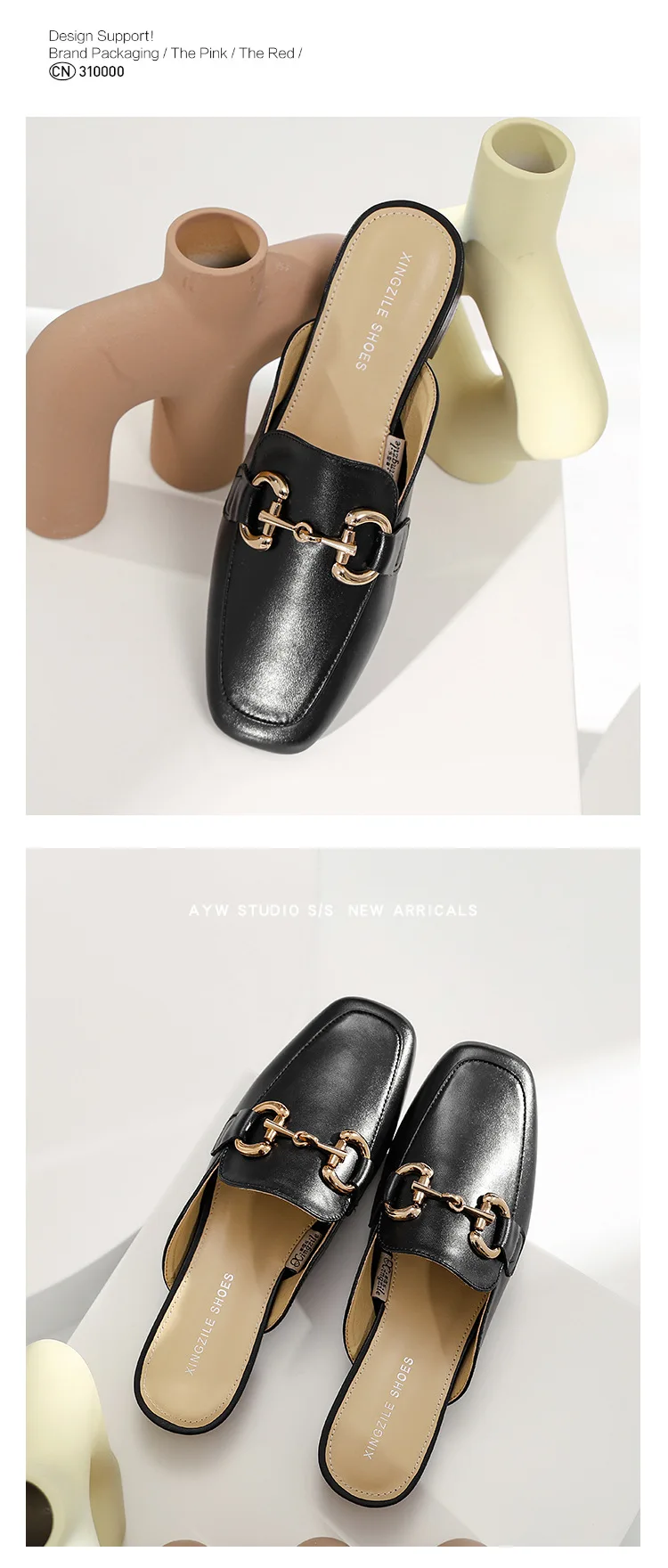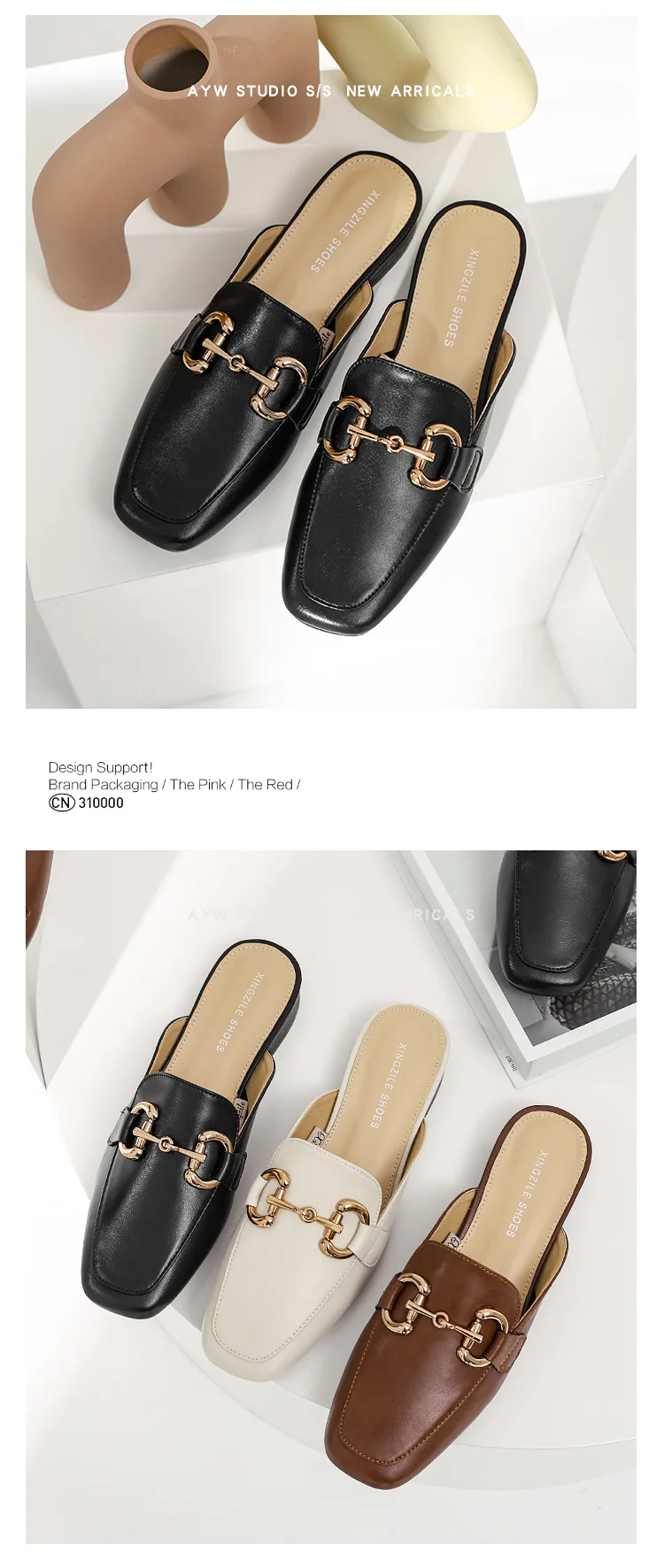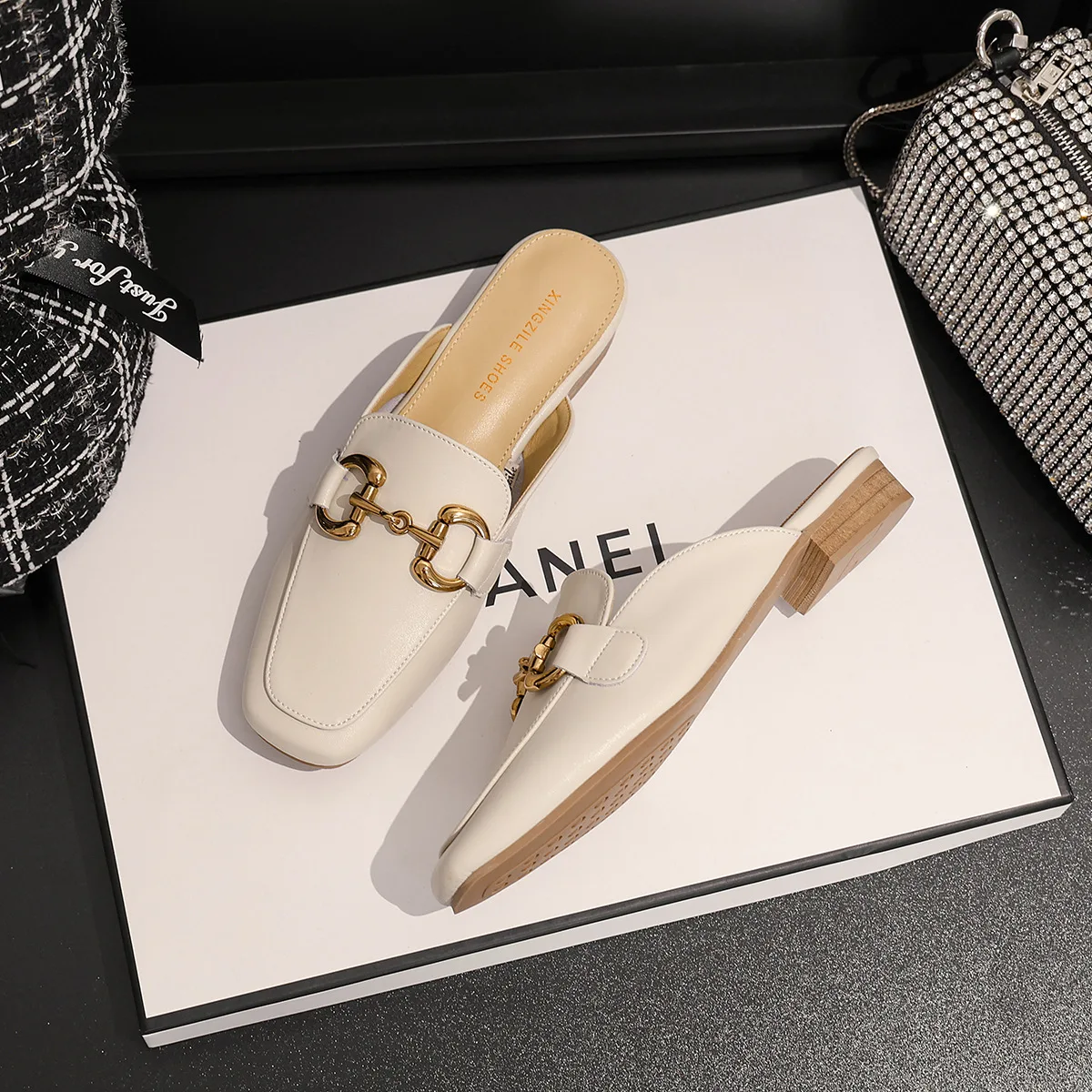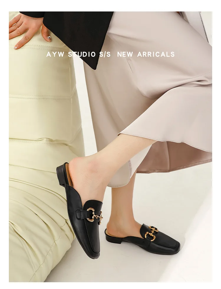 Leather Baotou semi-slippers women wear 2023 new horse-bit buckle sandals without heels lazy shoes flat Muller shoes.