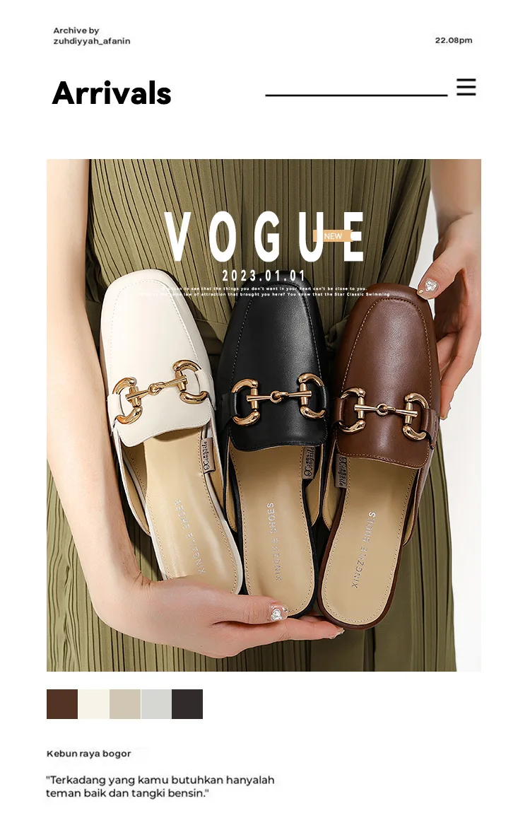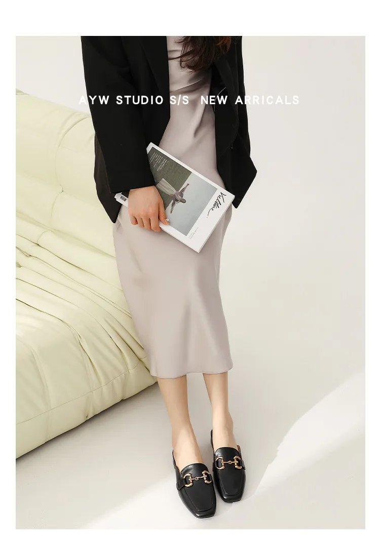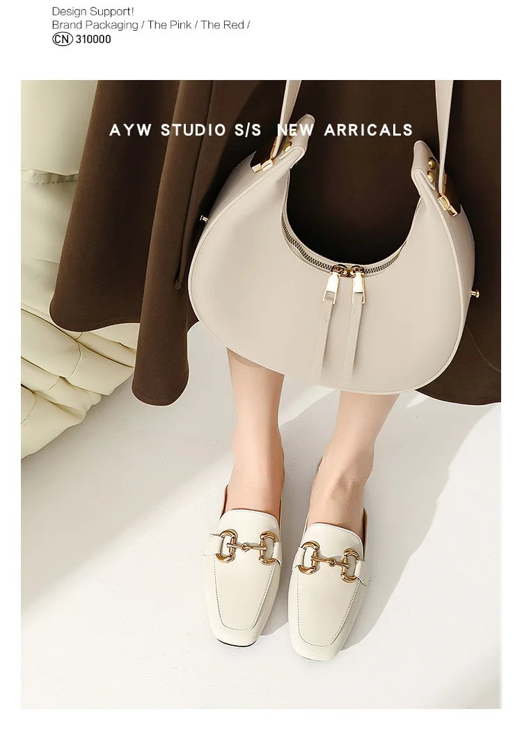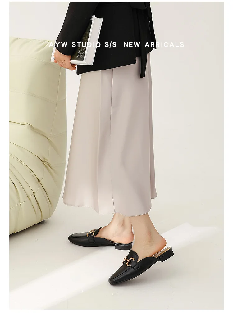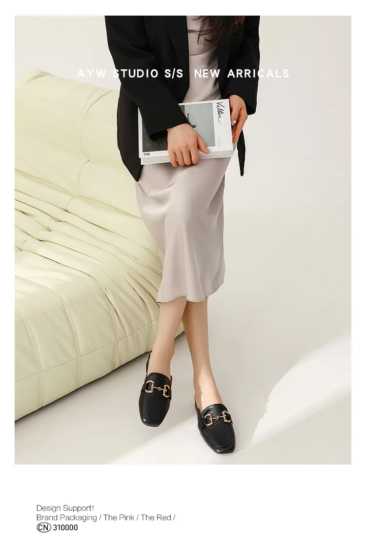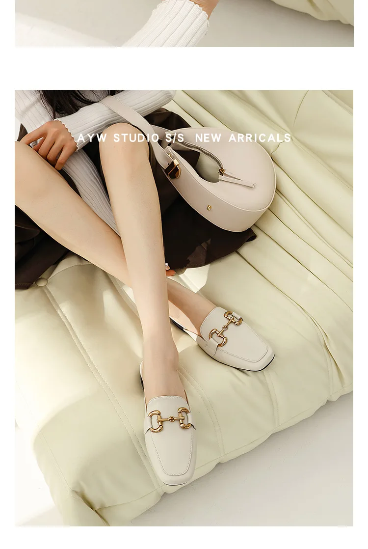 Leather Baotou semi-slippers women wear 2023 new horse-bit buckle sandals without heels lazy shoes flat Muller shoes.