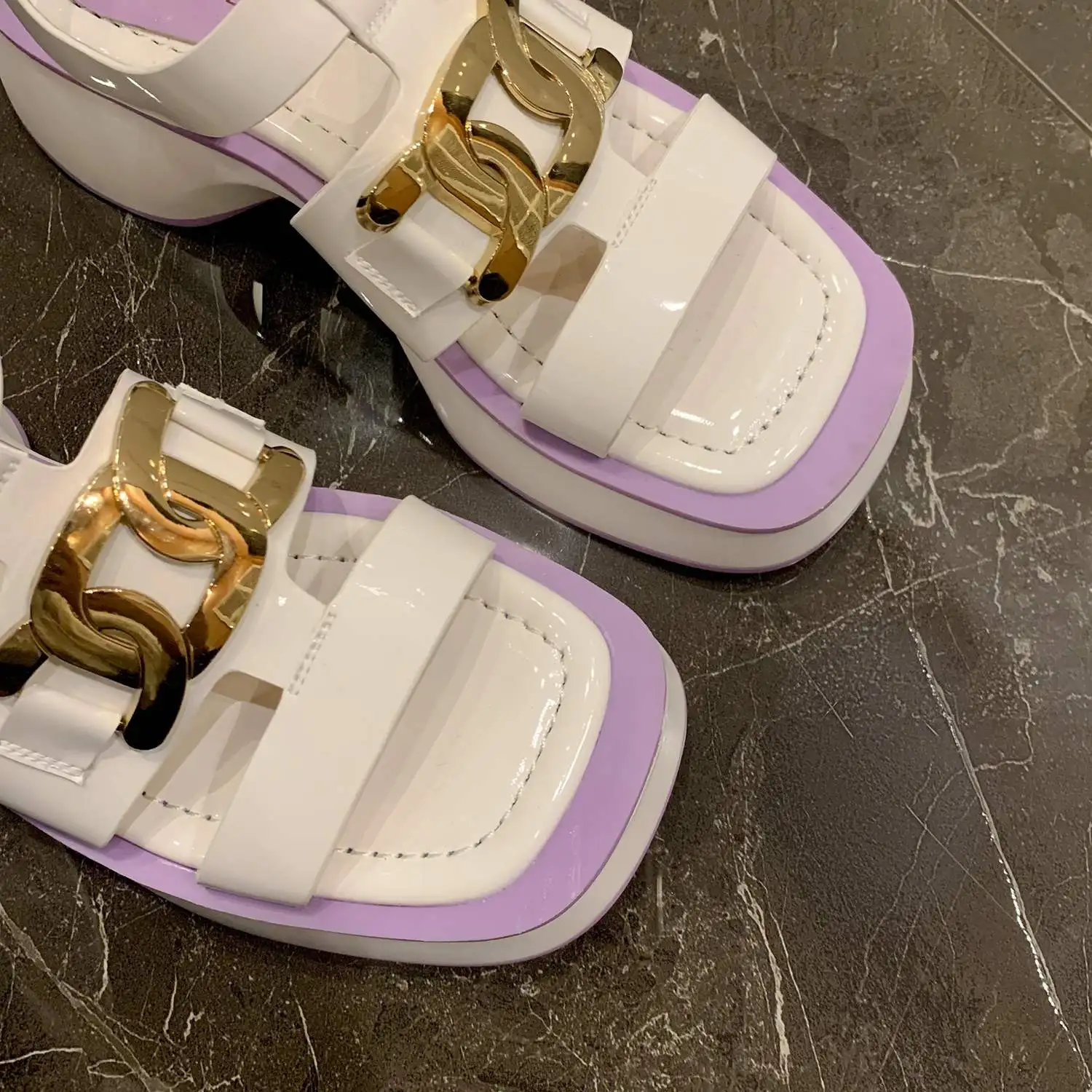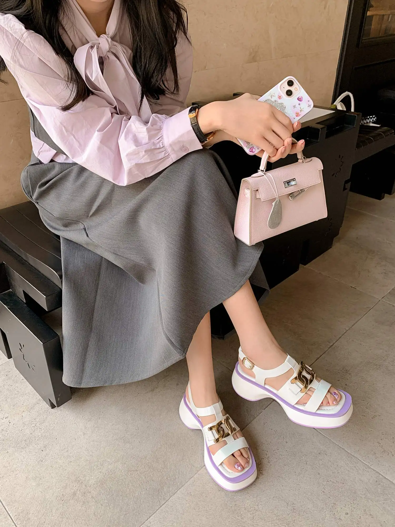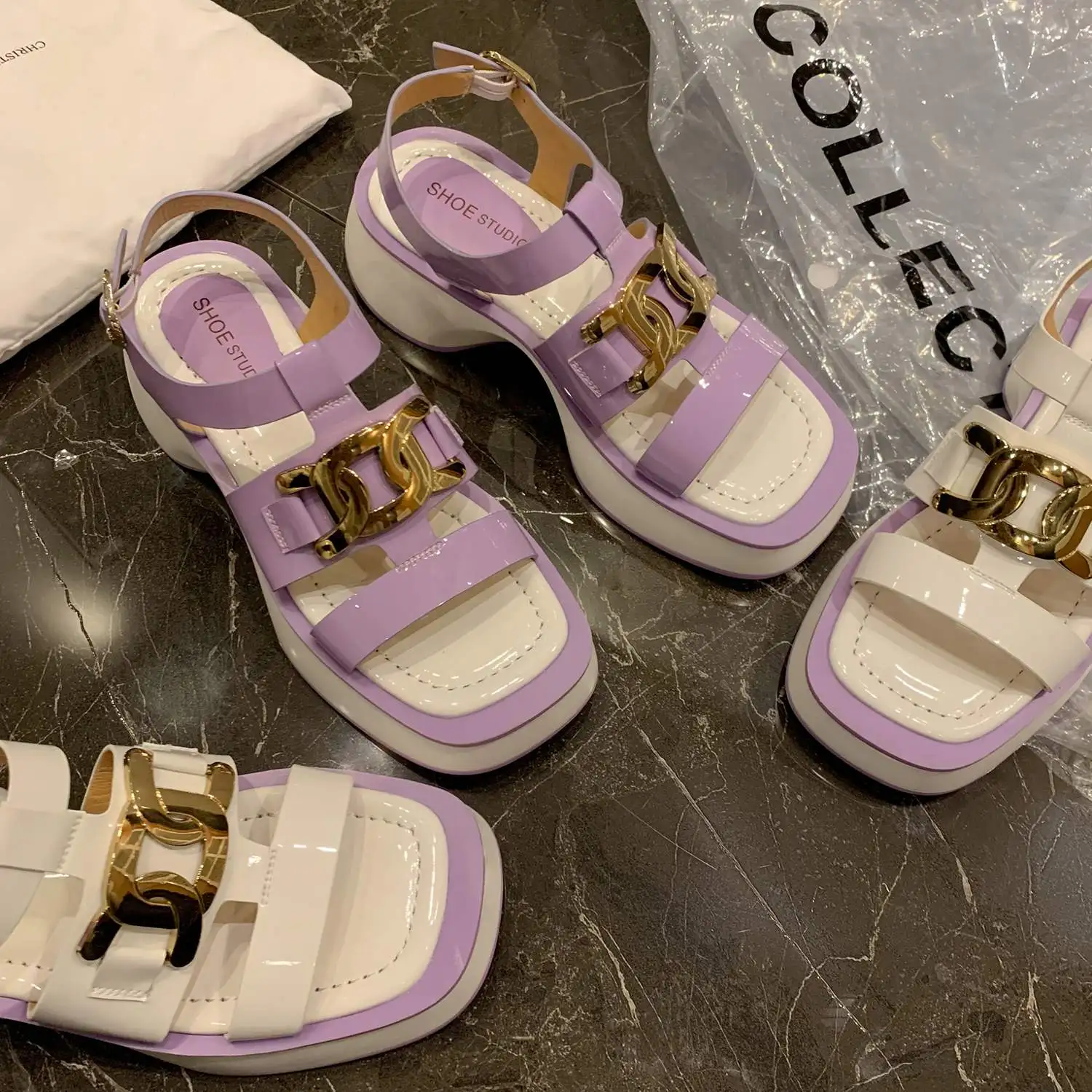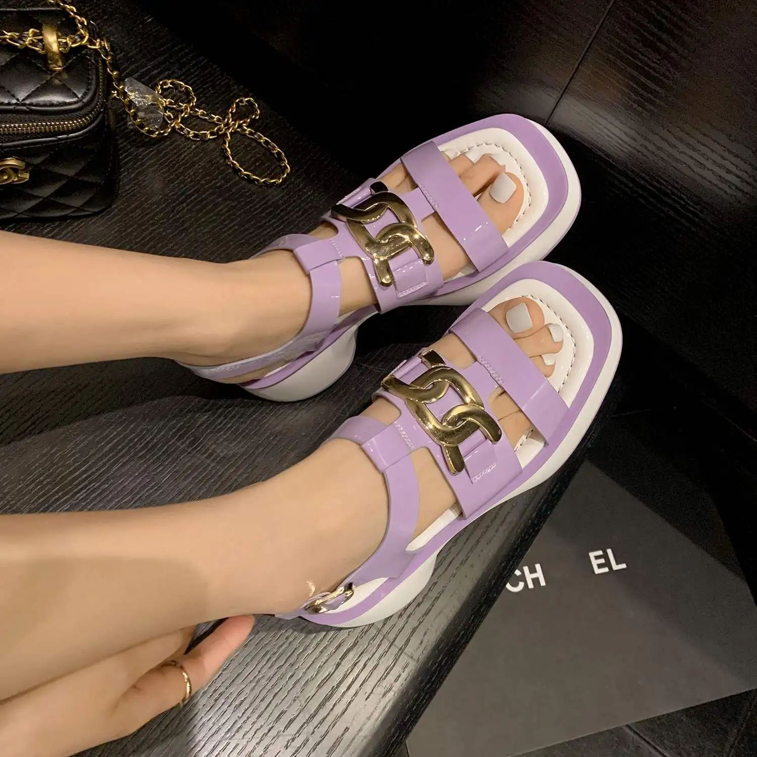Lenkisen Cow Leather Fashion Purple Big Size 42 Peep Toe Summer Shoes Thick Bottom Med Heels Metal Chains Brand Sandals Women