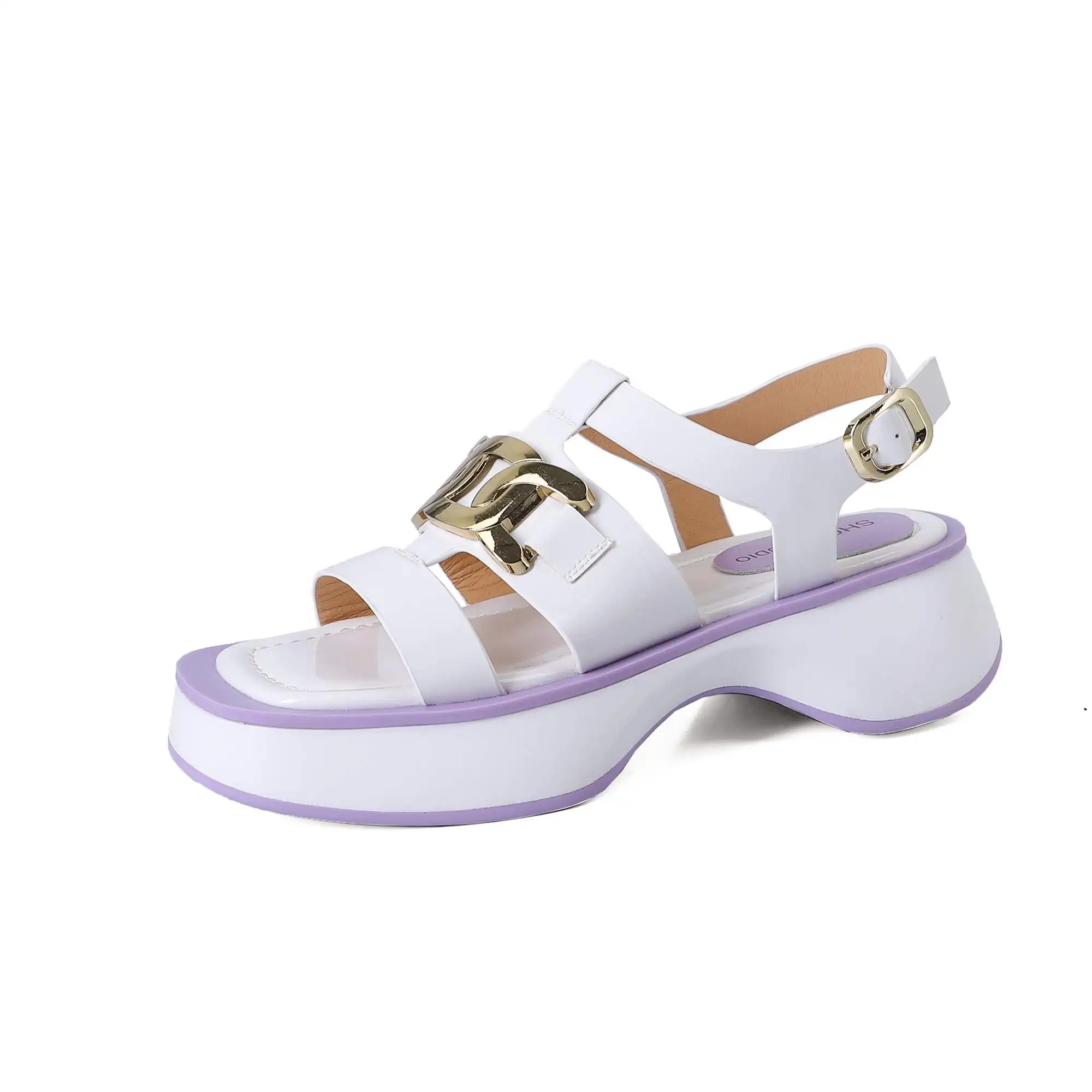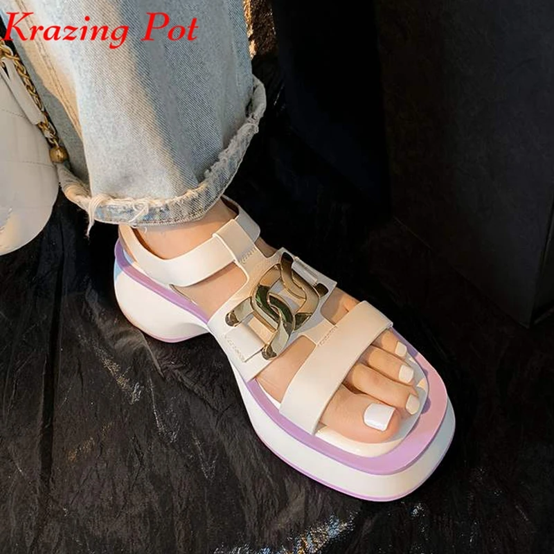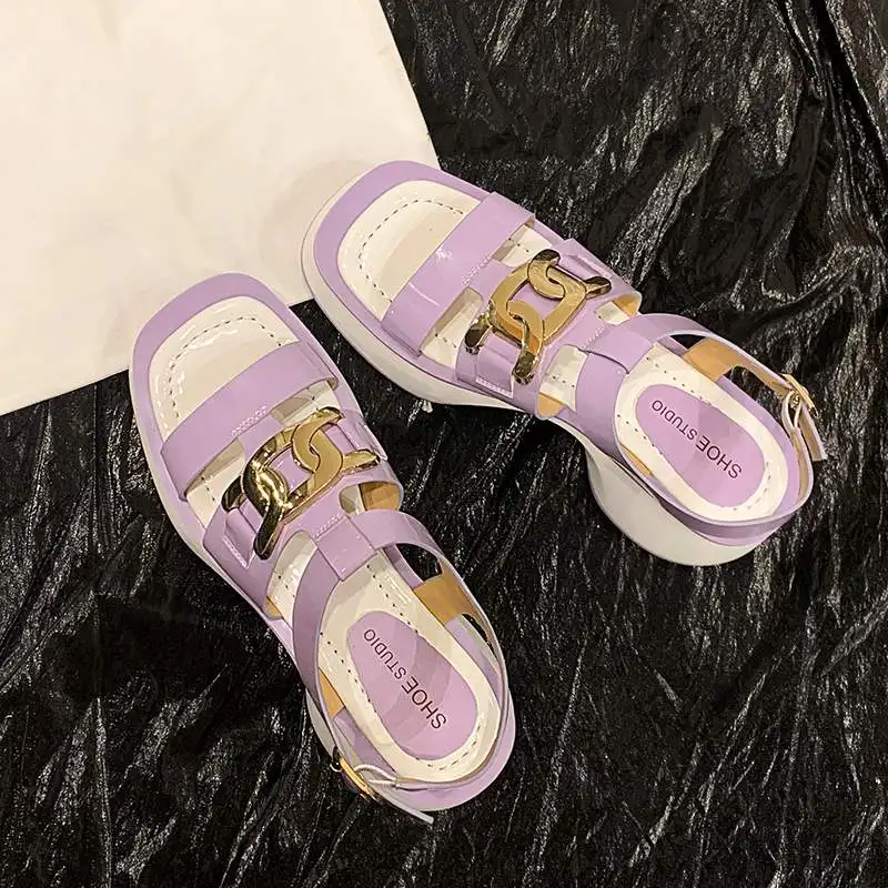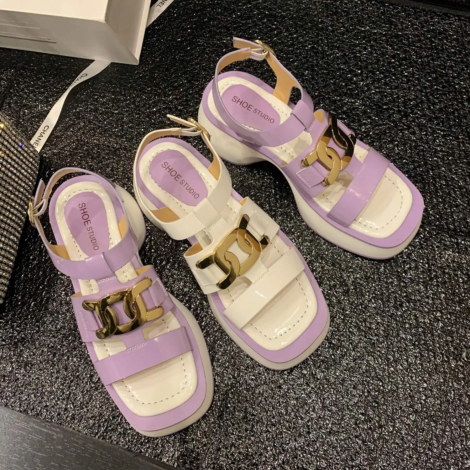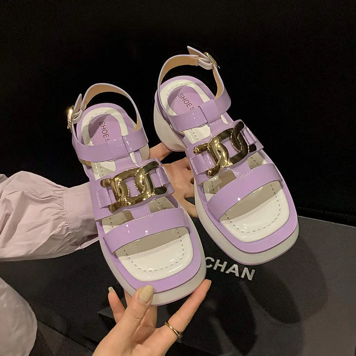 Lenkisen Cow Leather Fashion Purple Big Size 42 Peep Toe Summer Shoes Thick Bottom Med Heels Metal Chains Brand Sandals Women