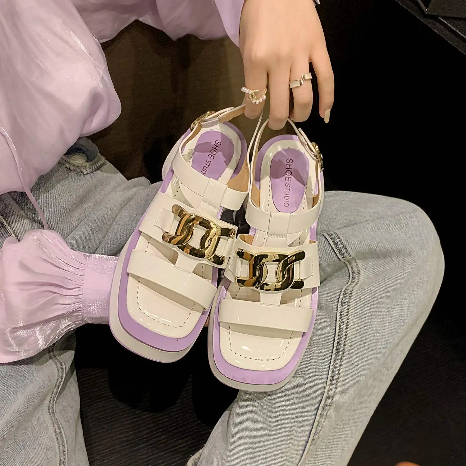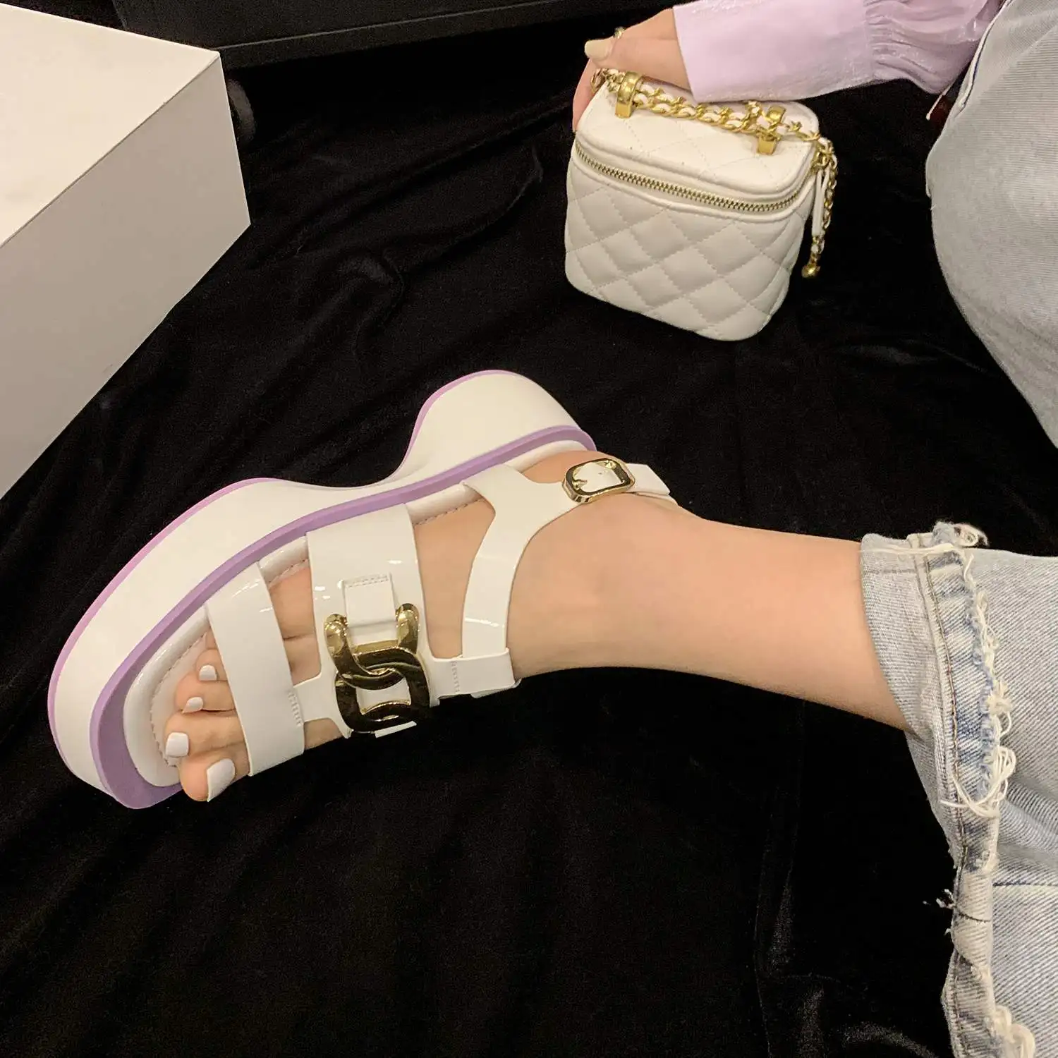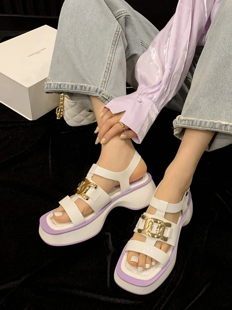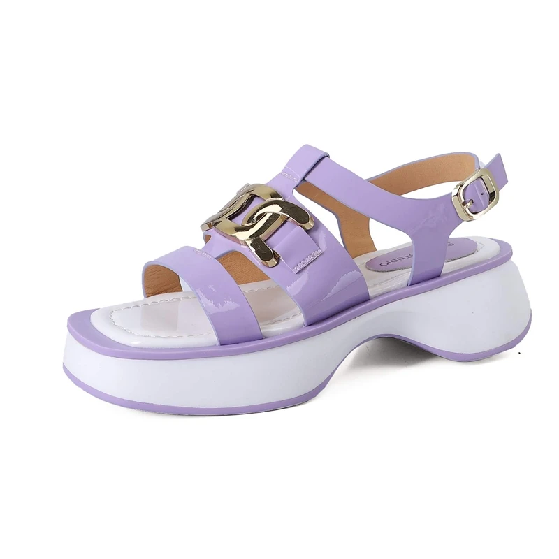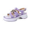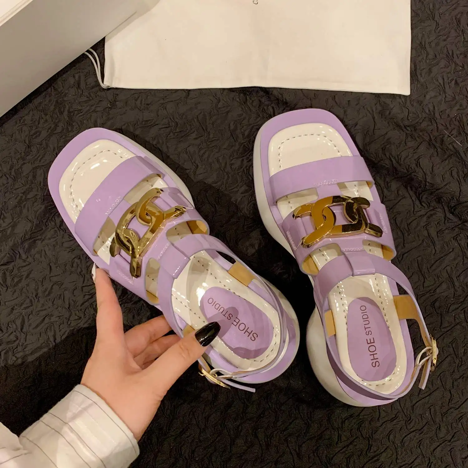 Lenkisen Cow Leather Fashion Purple Big Size 42 Peep Toe Summer Shoes Thick Bottom Med Heels Metal Chains Brand Sandals Women