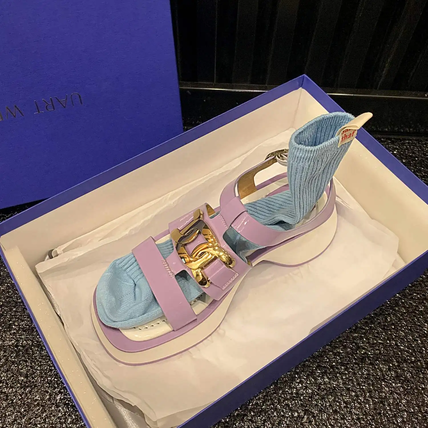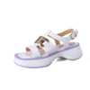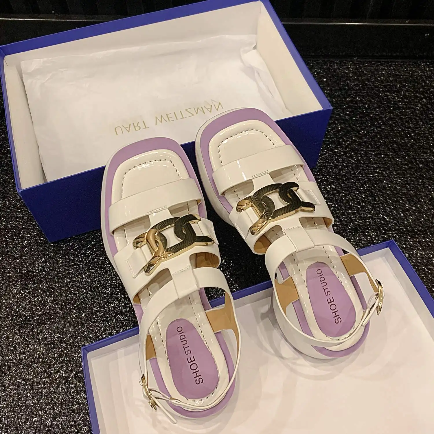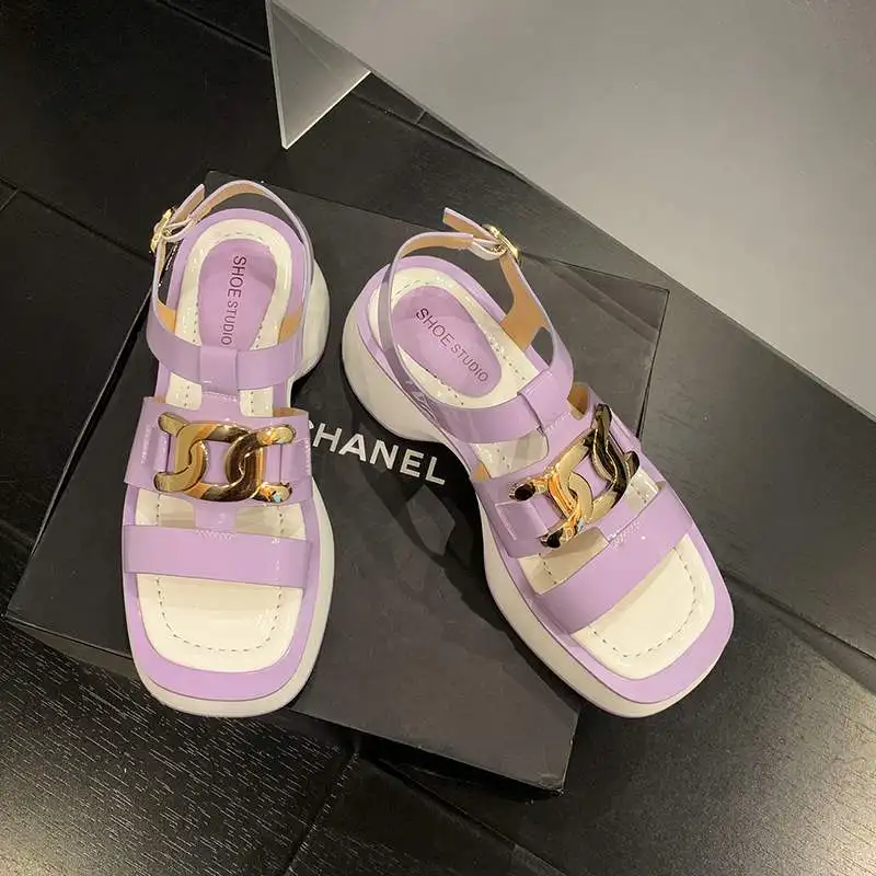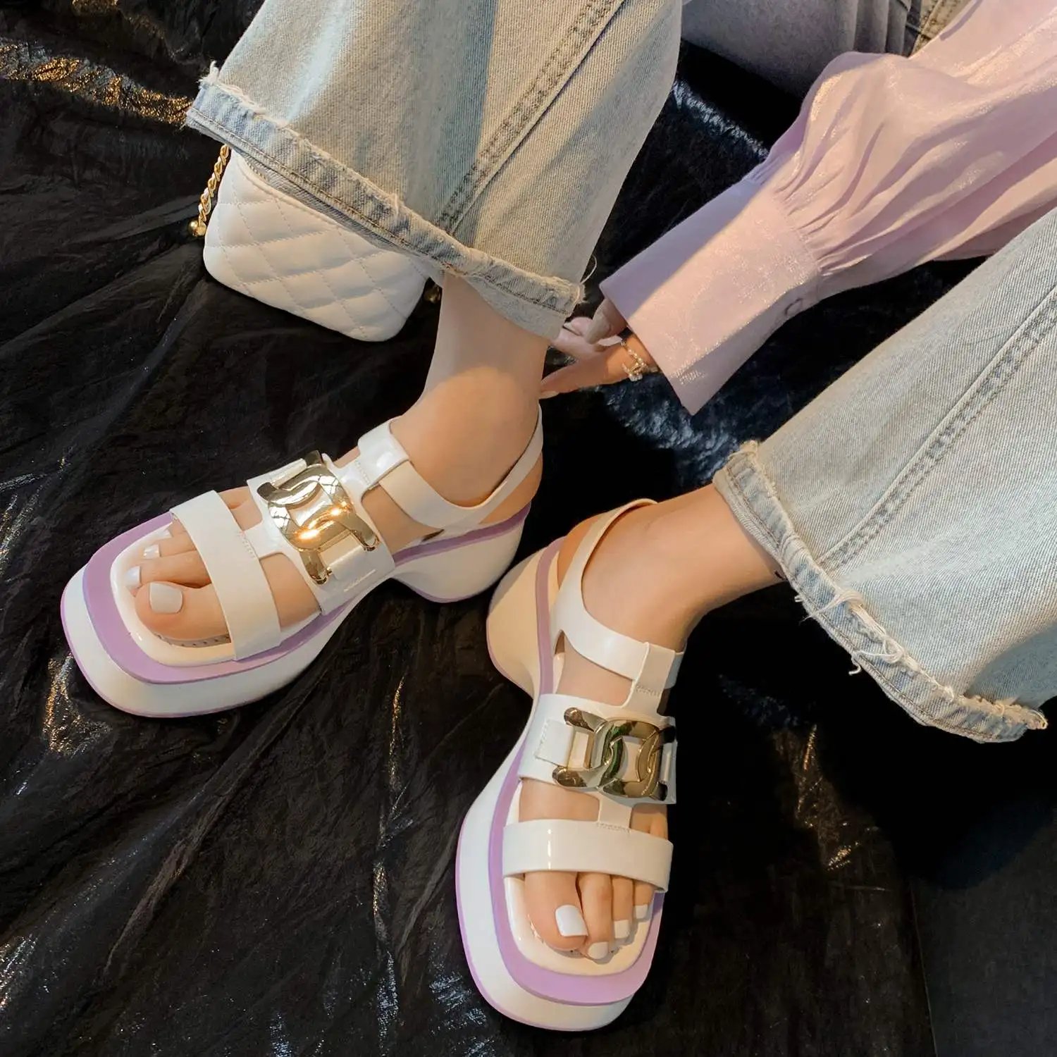 Lenkisen Cow Leather Fashion Purple Big Size 42 Peep Toe Summer Shoes Thick Bottom Med Heels Metal Chains Brand Sandals Women
