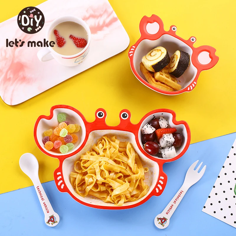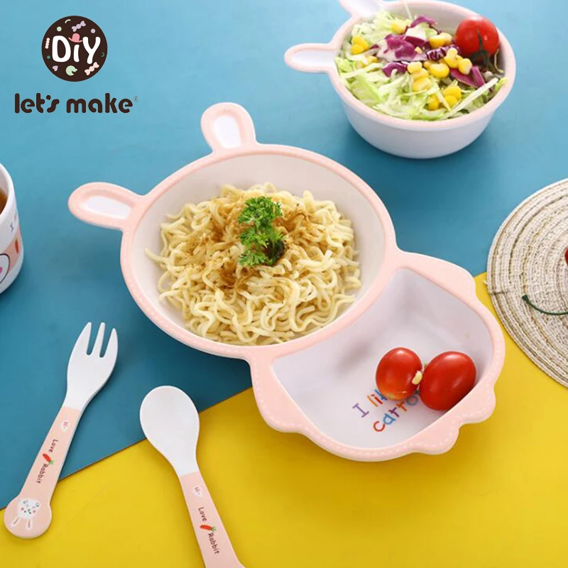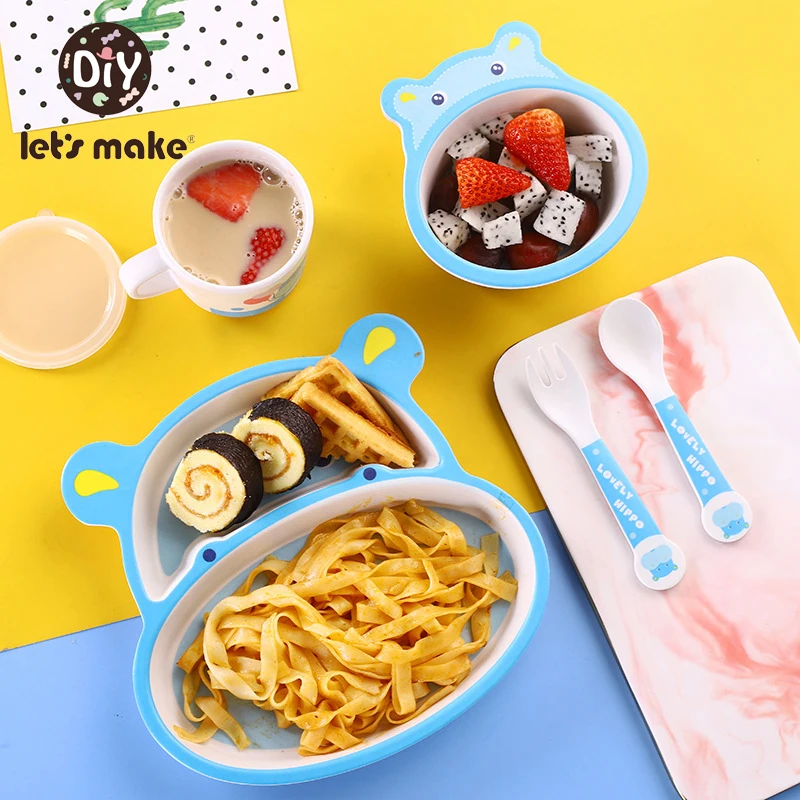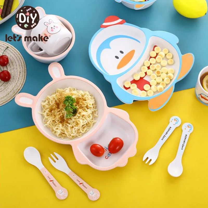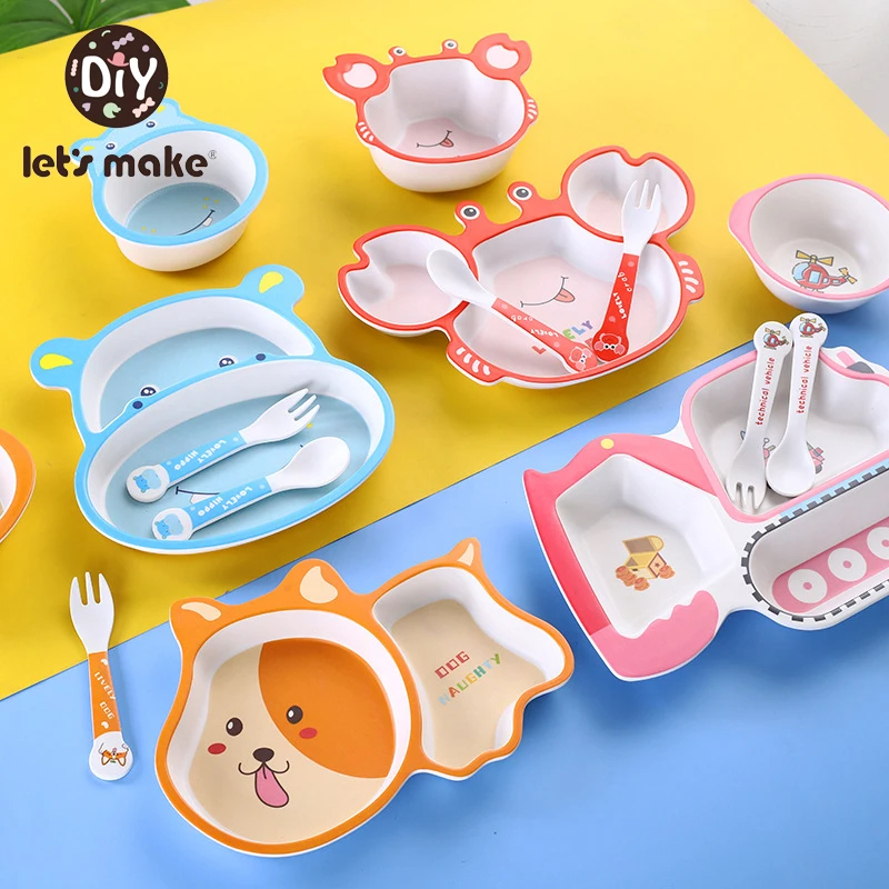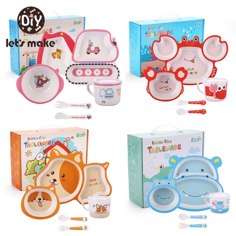 Let’s Make 5 pcs/Set Baby Feeding Tableware Set Fiber Material Bowl Plate Cup Spoon Fork Set High Quality Tableware For Children