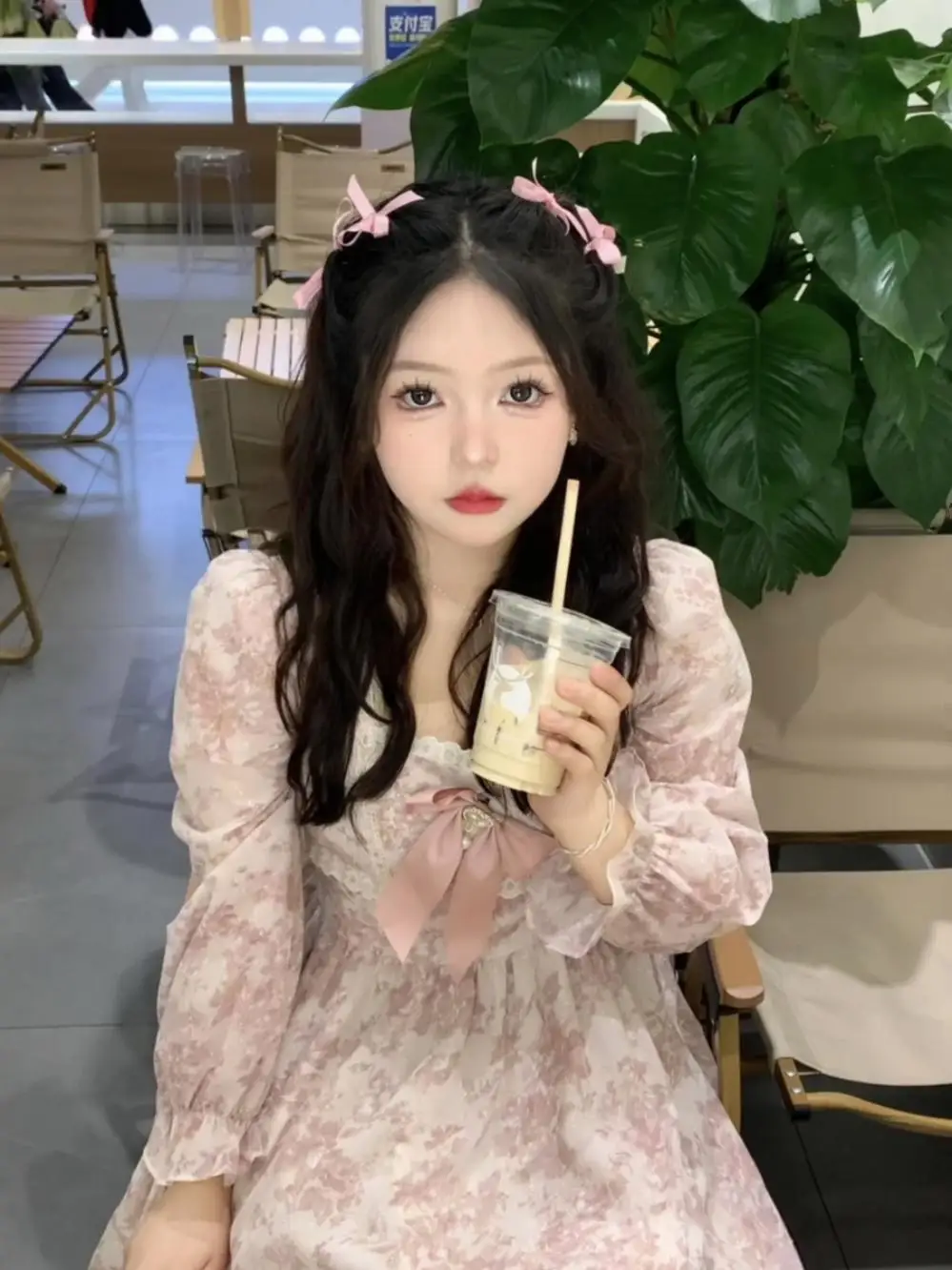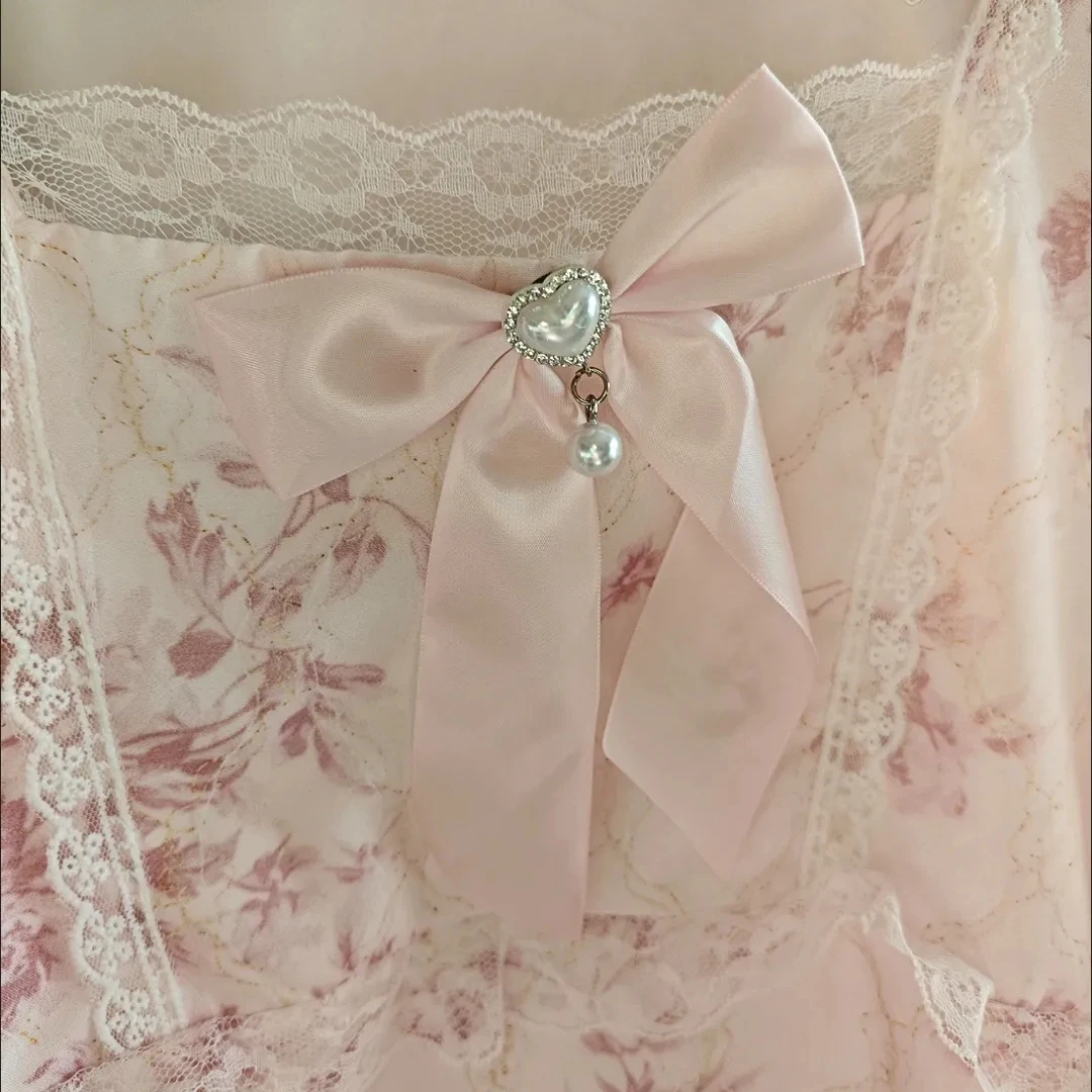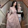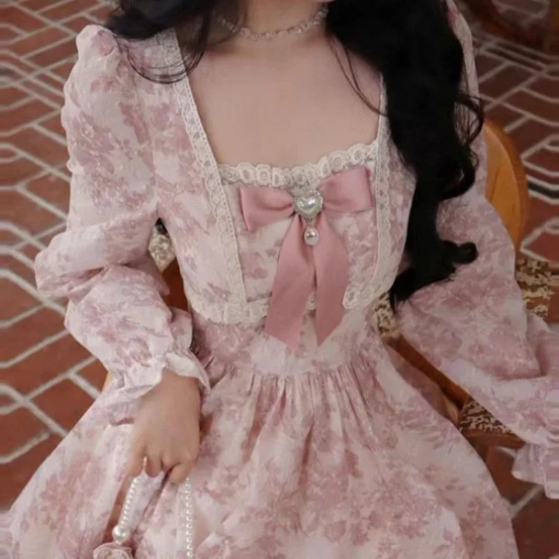 Long Sleeve Midi Dress Women Sweet Princess Girls Floral Print Flattering Waist Bow Square Collar Spring Design Elegant Temper