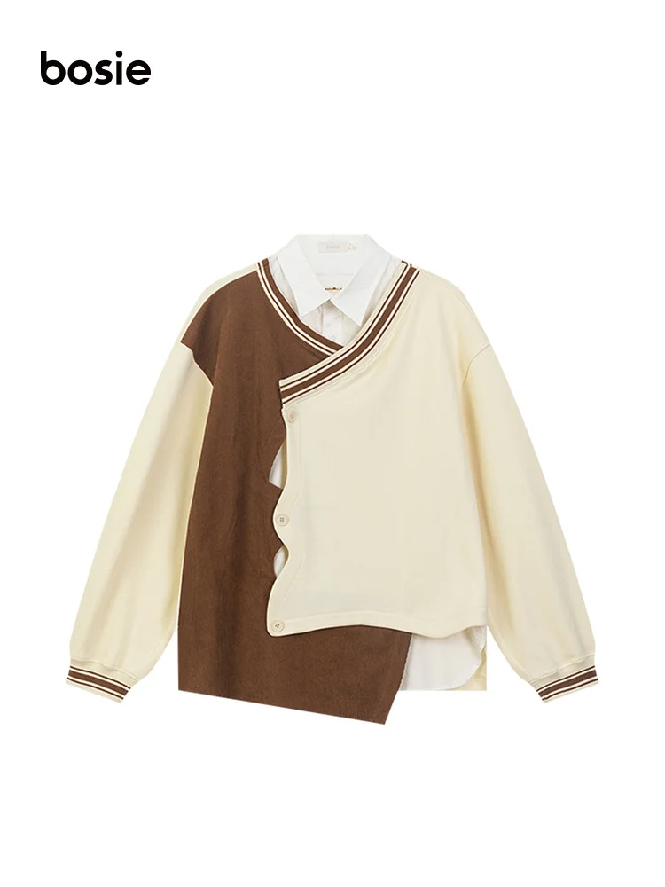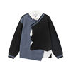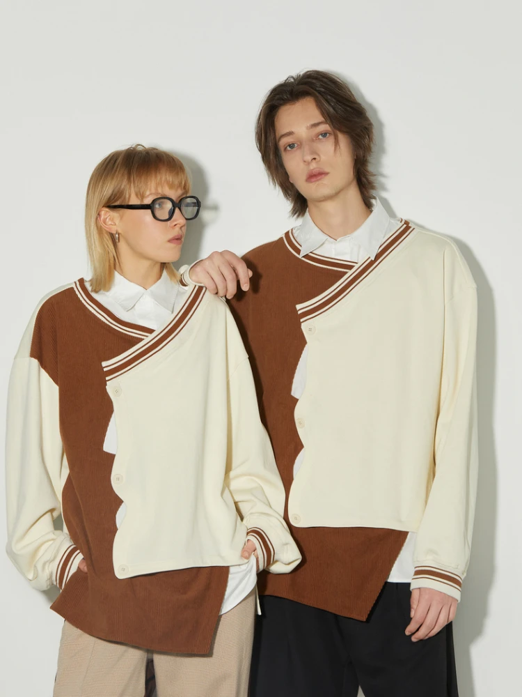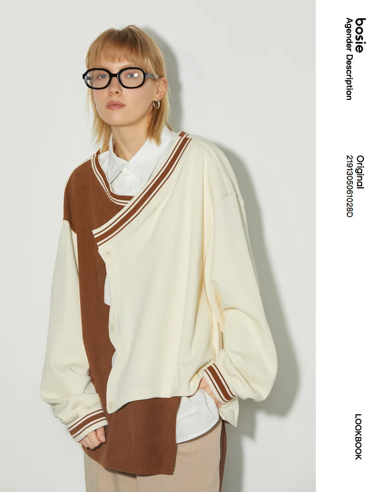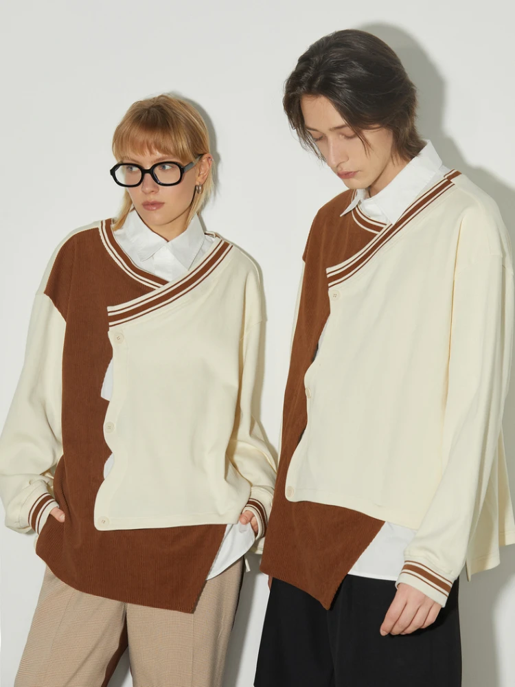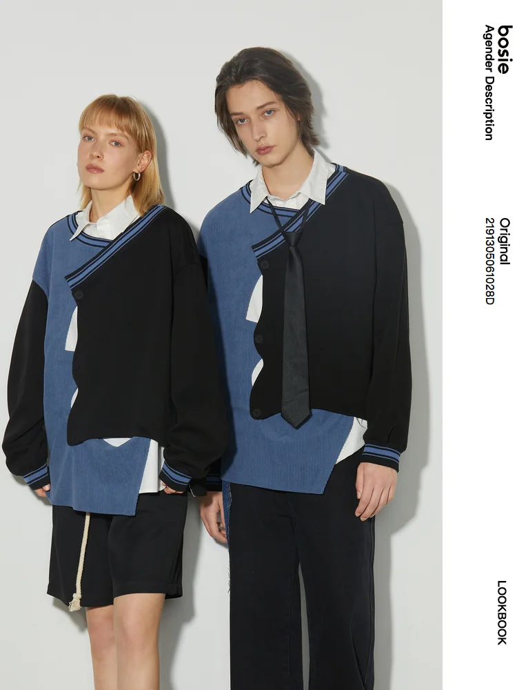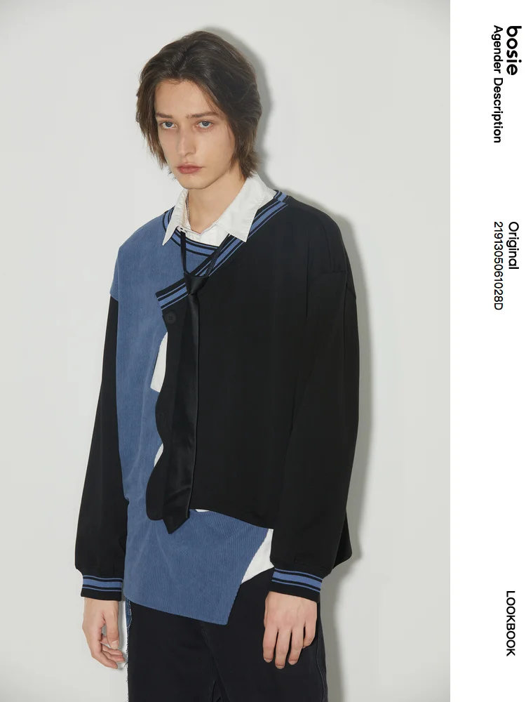 Long Sleeve Top Lapel Stitching Fashion Men’s Spring and Autumn Sweater Couple’s Asymmetric Loose Casual Fashion Placket Stripes