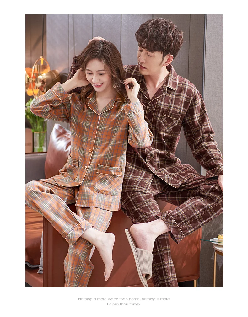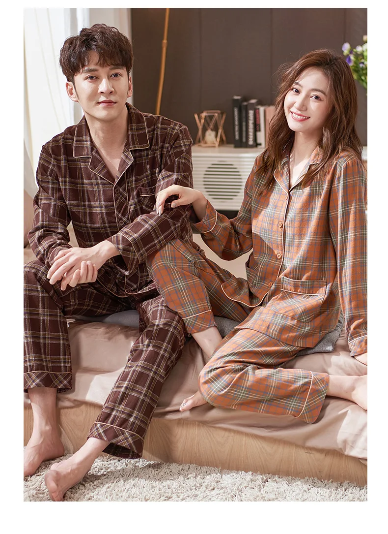 Lovers Woven Full Cotton Pajamas Cardigan Plaid Pajama Sets Sleepwear Long Sleeve Tops + Pants Pajamas Home Clothing Pyjamas