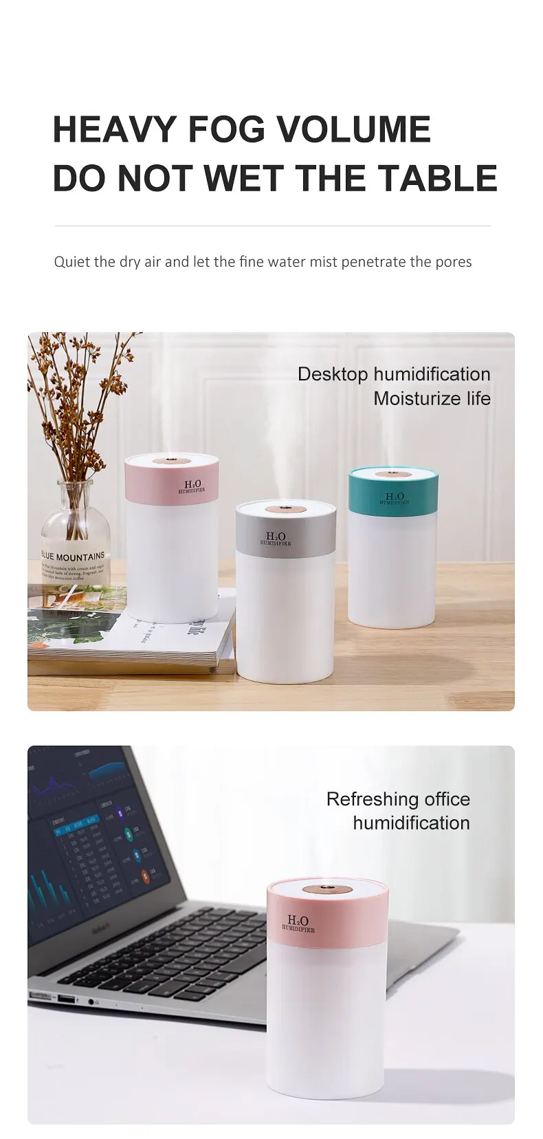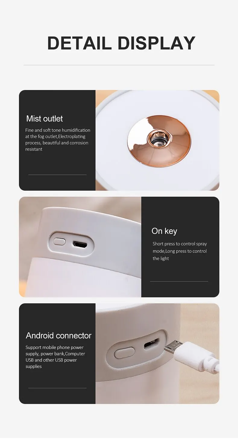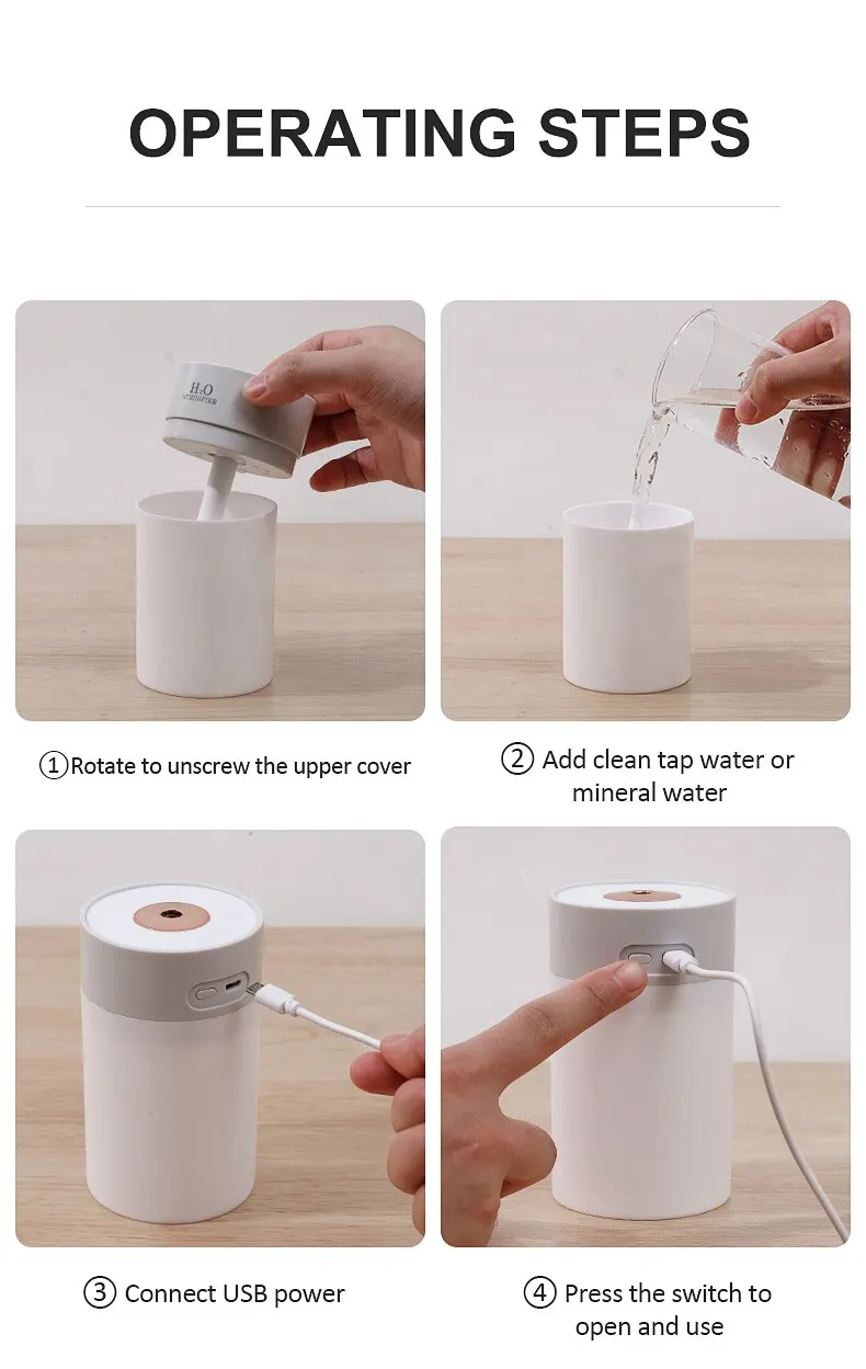 • USB Power Supply :The humidifier is powered by USB, allowing you to easily operate it using any USB power source such as a laptop, power bank, or wall outlet.