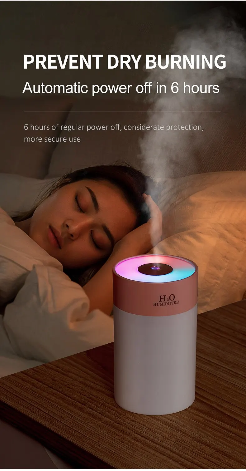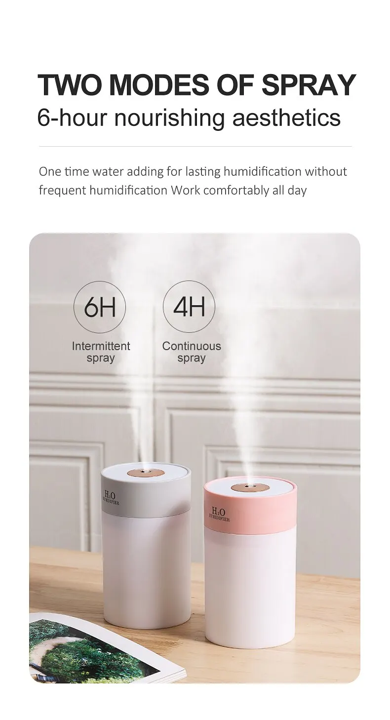 [2 fog modes and automatic shutdown] continuous fog and intermittent fog. In continuous mode, it will turn off automatically after 4 hours. In flashing mode, it will turn off automatically after 6 hours. Turn off when the water level is low. No need to worry about the humidifier being damaged by lack of water, it is safer to use.
