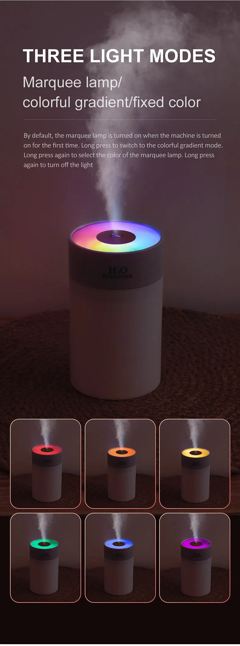 [Easy to operate] the humidifier is very easy to operate. You only need to press the power button once every 1 second to control the fog. Continue pressing the power button for 3 seconds to turn on the gradient of seven colors, fixed color and flashing light three light functions.