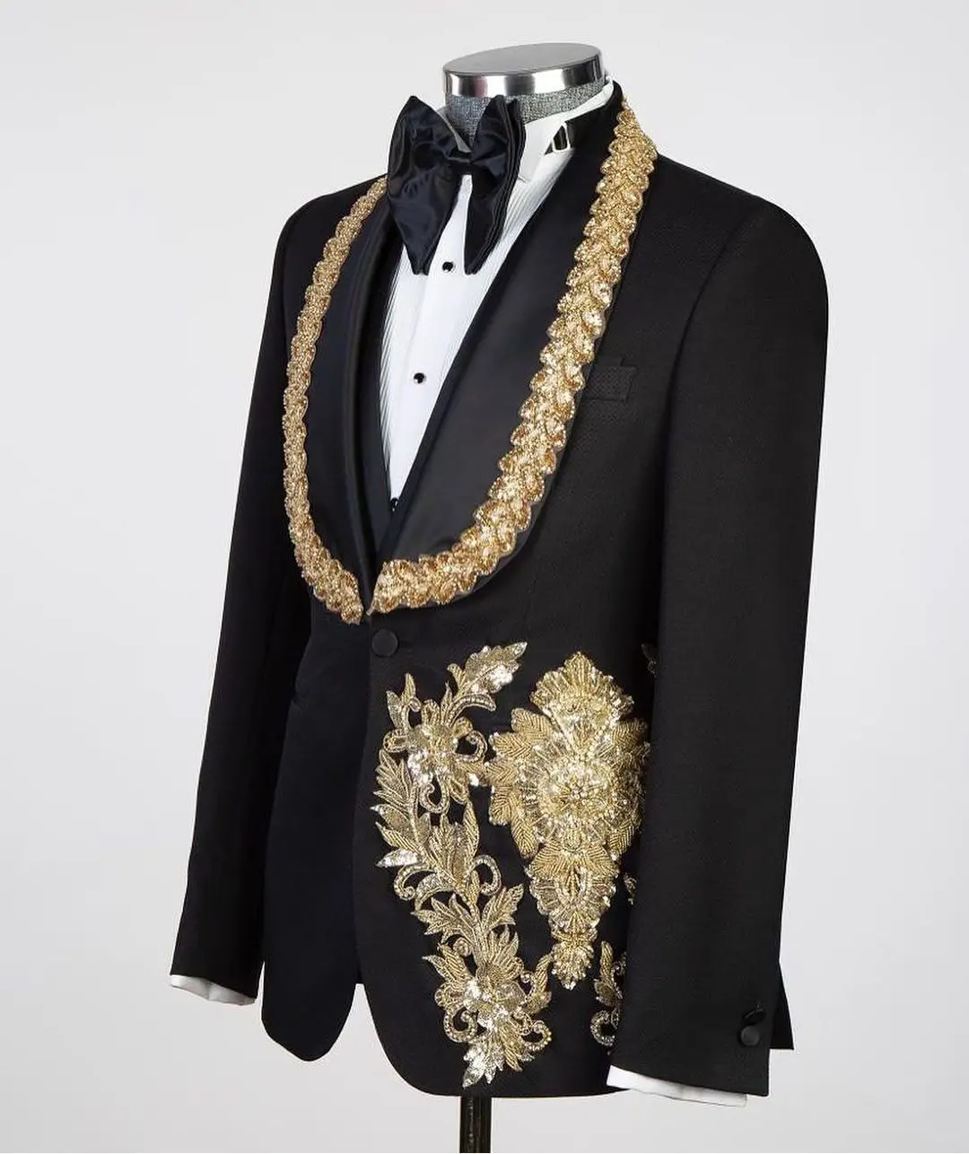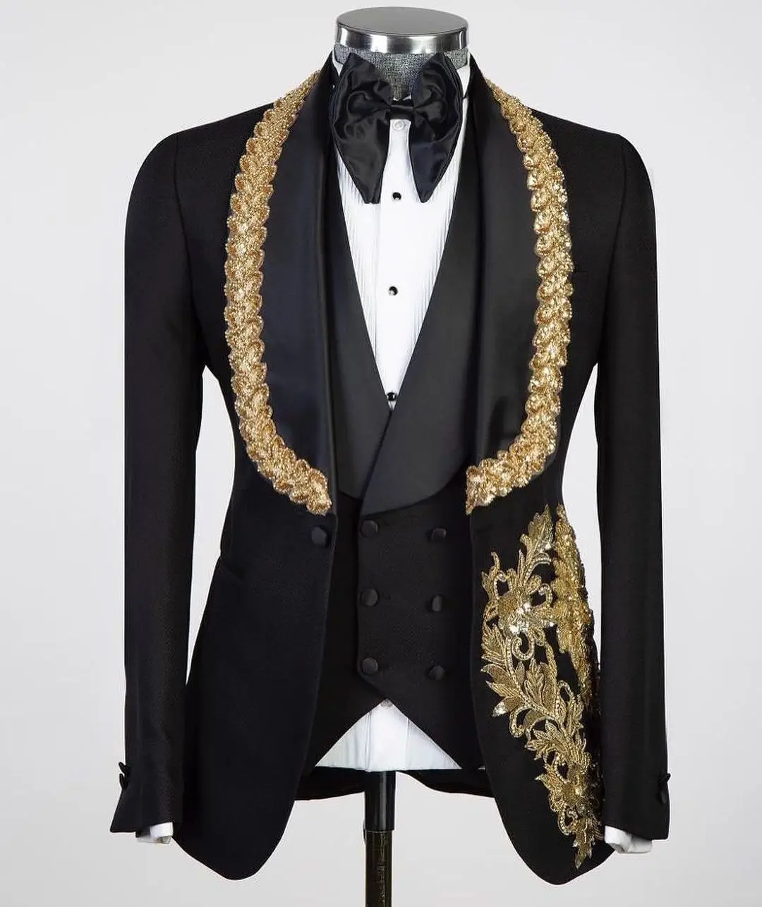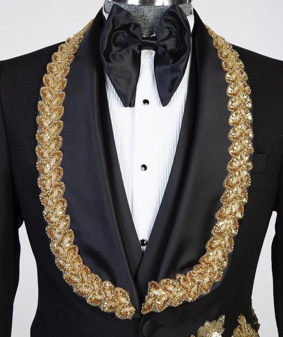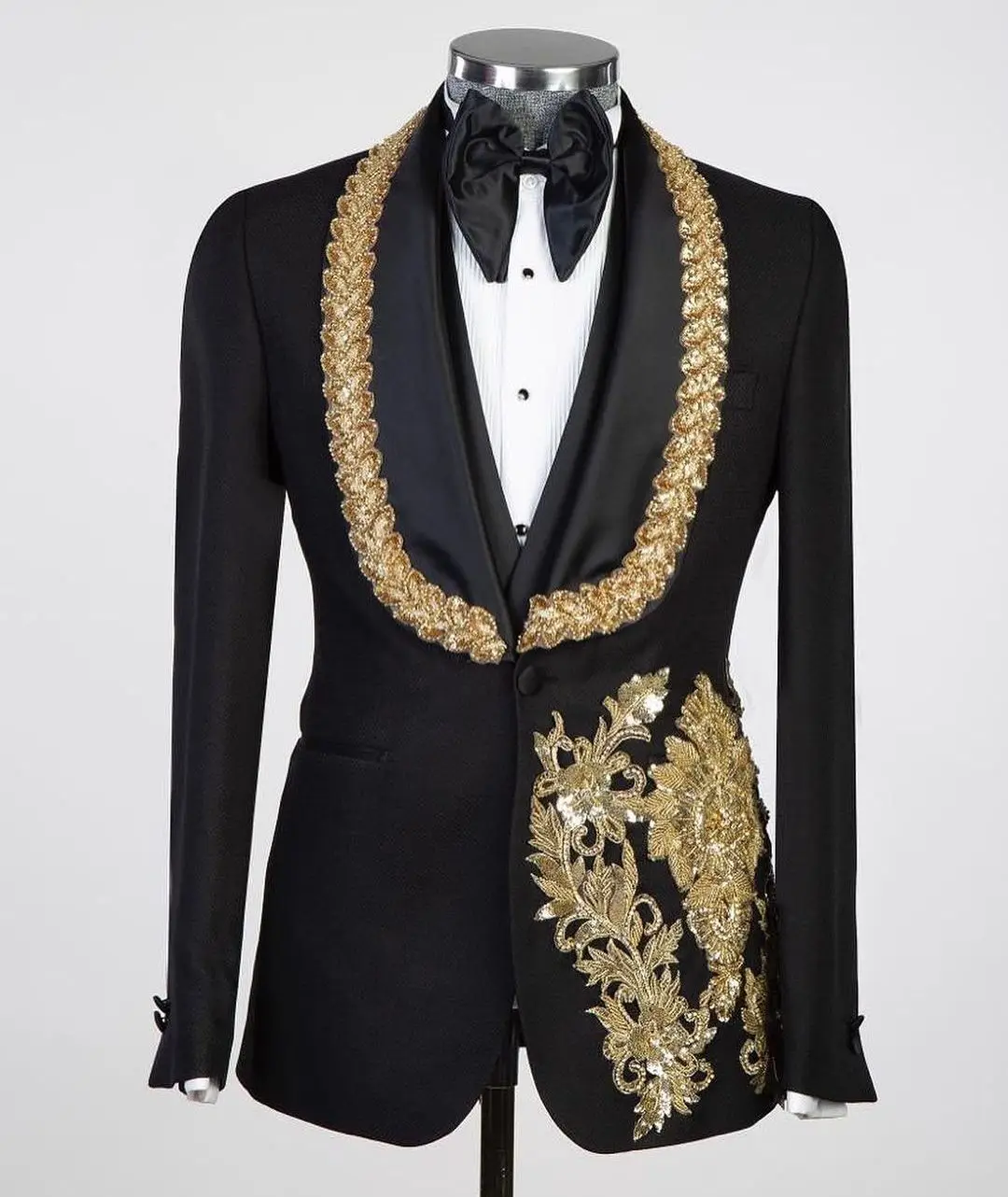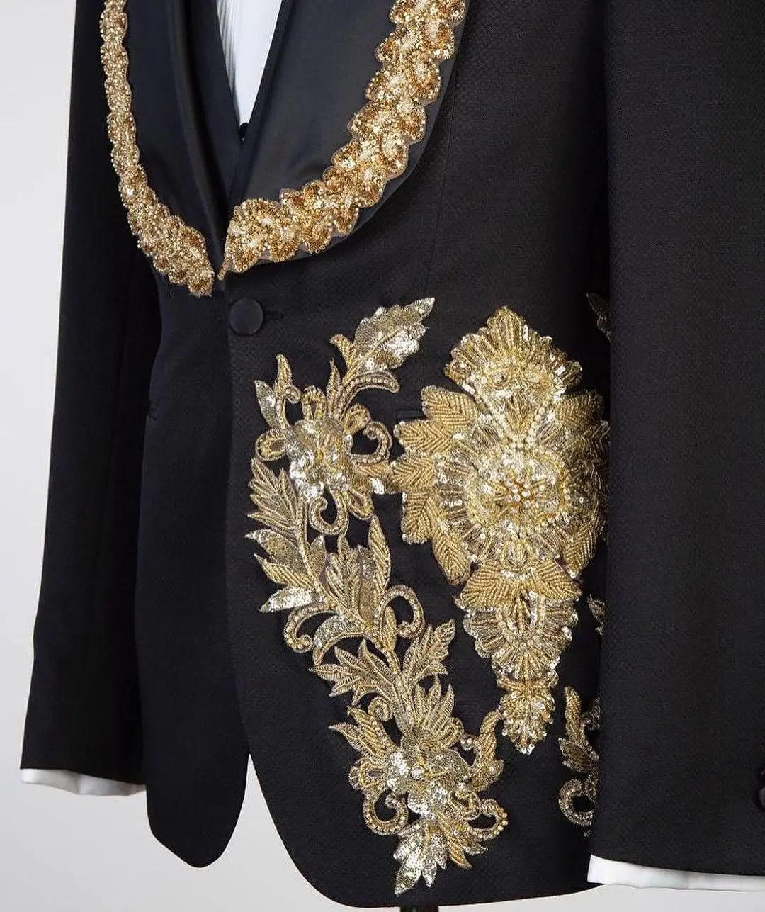 Luxury 2 Pieces Blazer Vest Men Suits One Button Satin Wide Lapel Formal Gold Appliques Beads Wedding Groom Plus Size Tailored