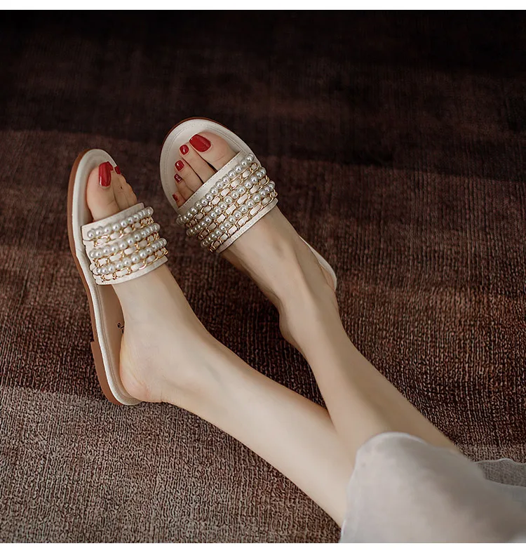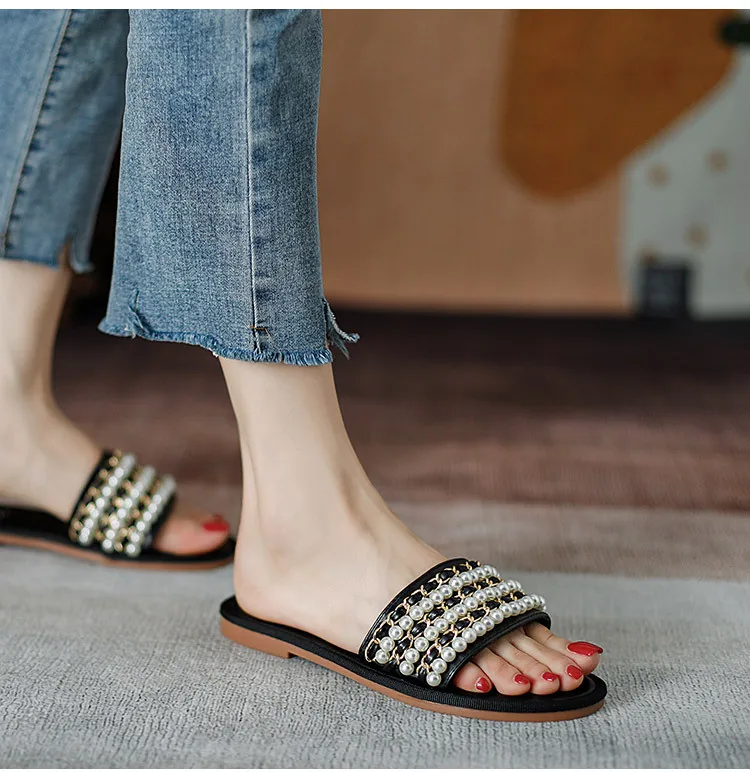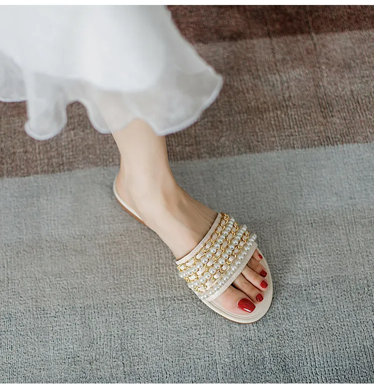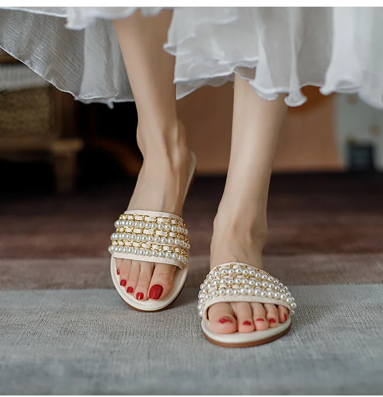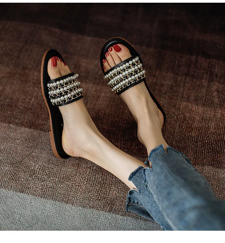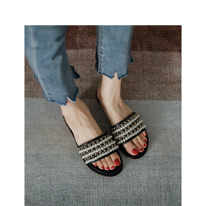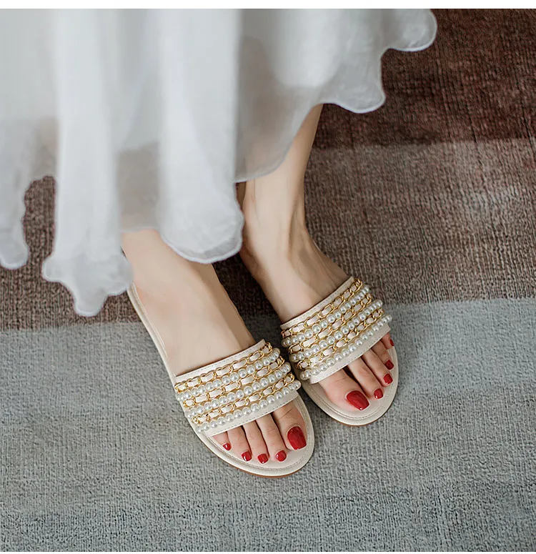 luxury designer peal strings slippers women flat heel metal chains flip flops black/beige beading leather sandalias mujer 2022