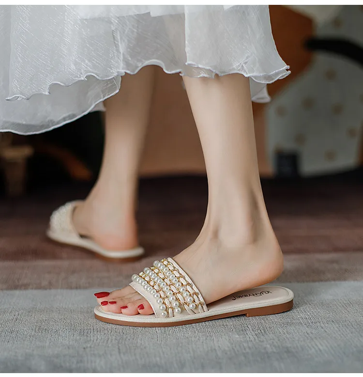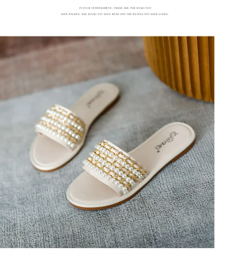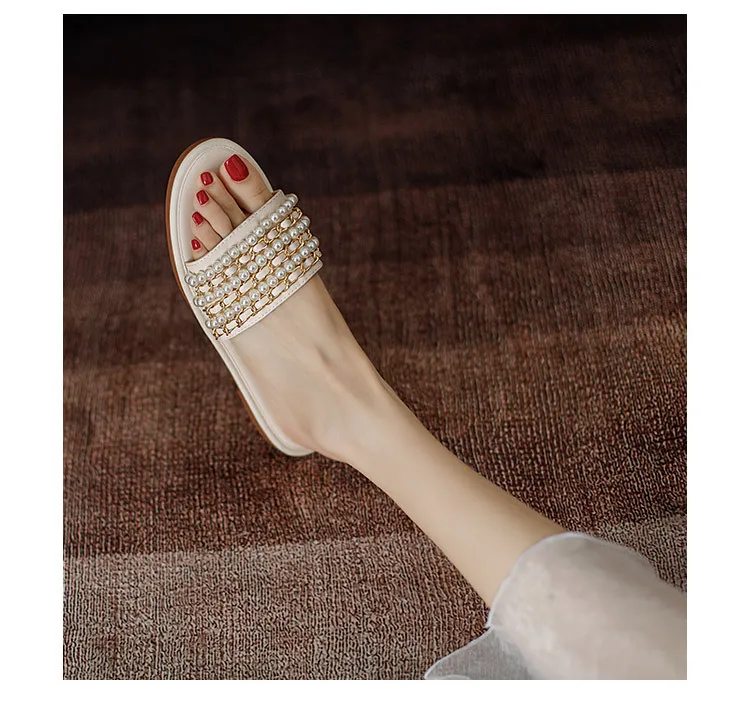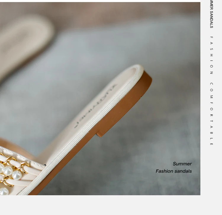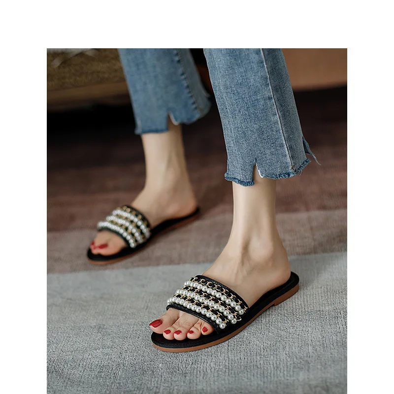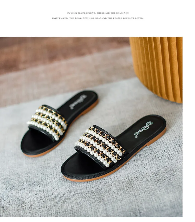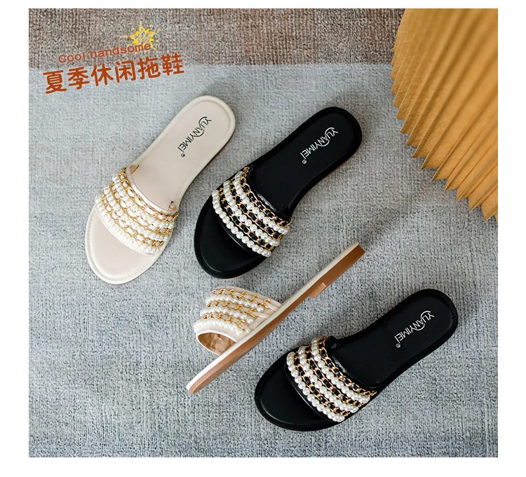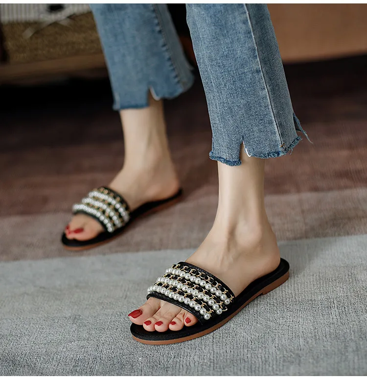 luxury designer peal strings slippers women flat heel metal chains flip flops black/beige beading leather sandalias mujer 2022
