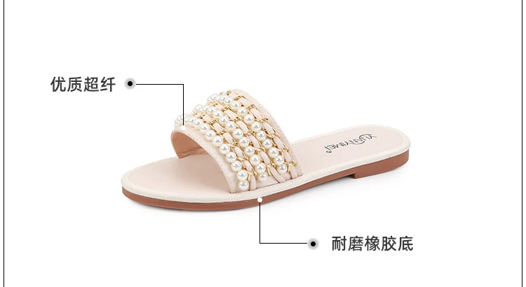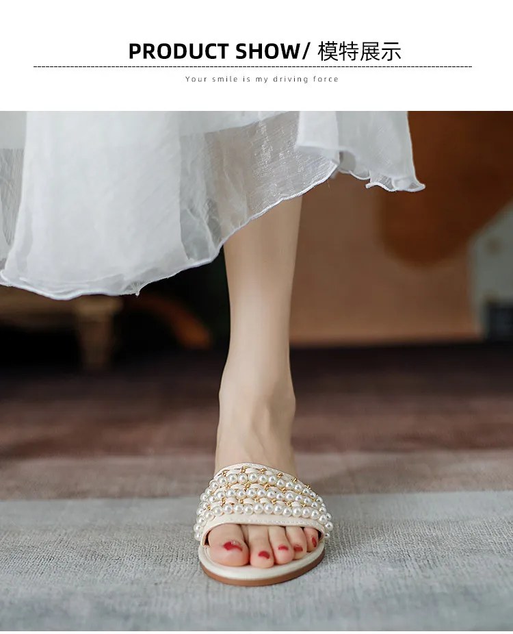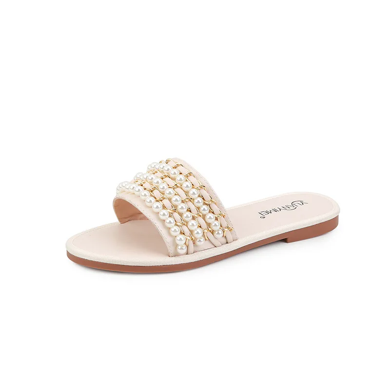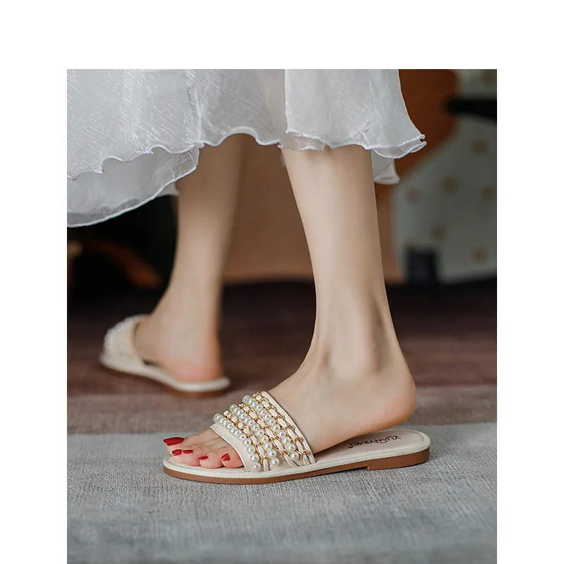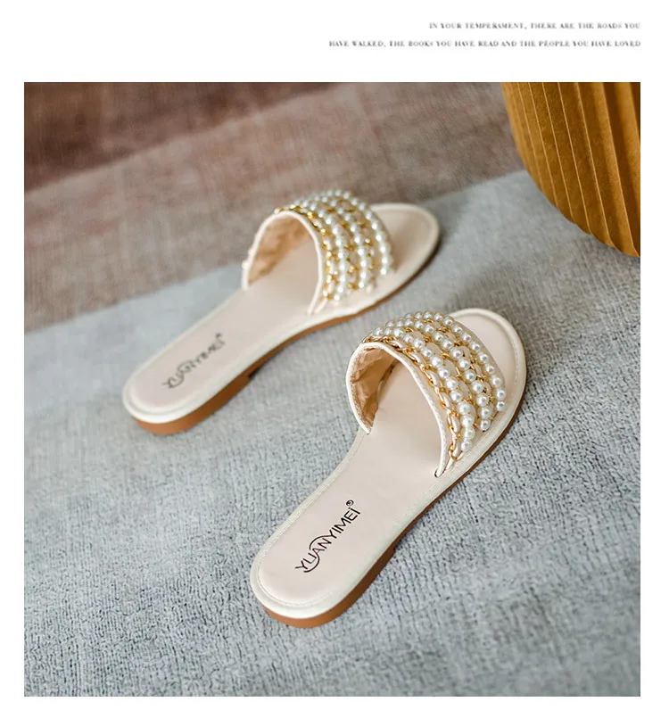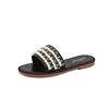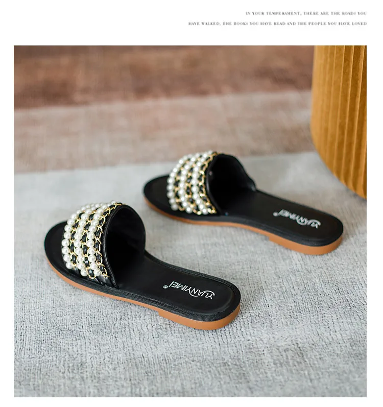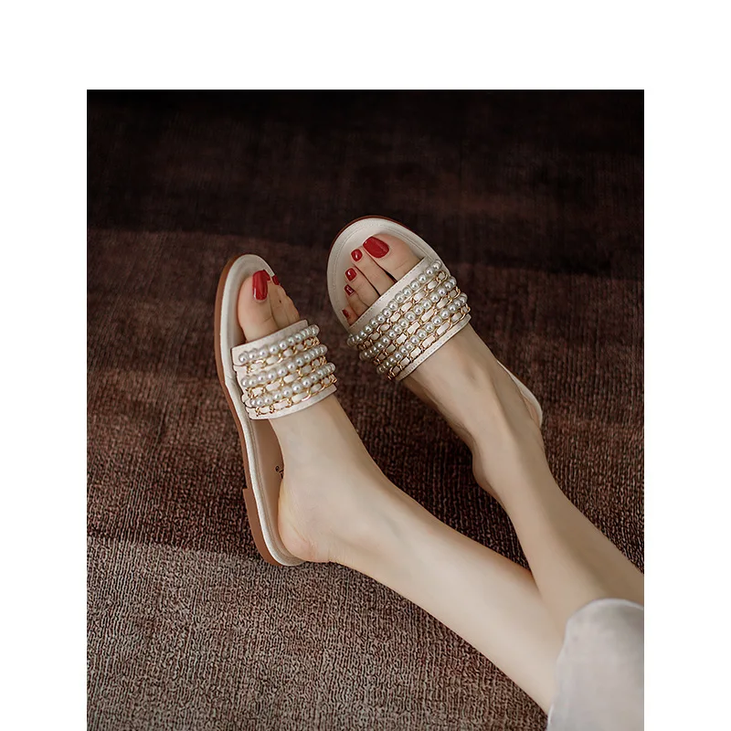 luxury designer peal strings slippers women flat heel metal chains flip flops black/beige beading leather sandalias mujer 2022
