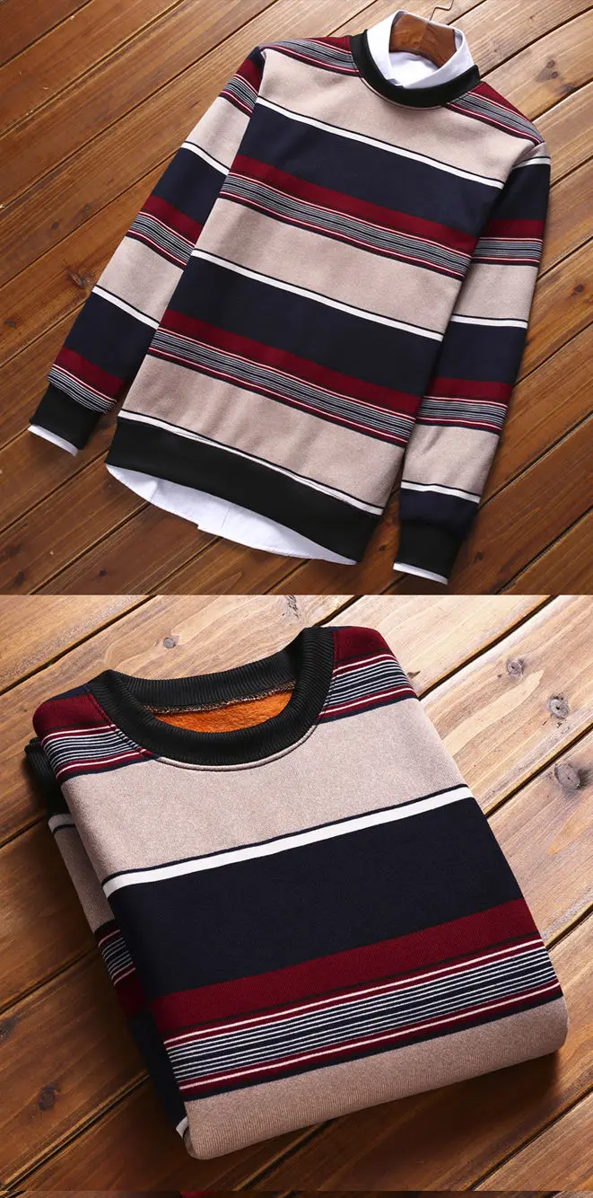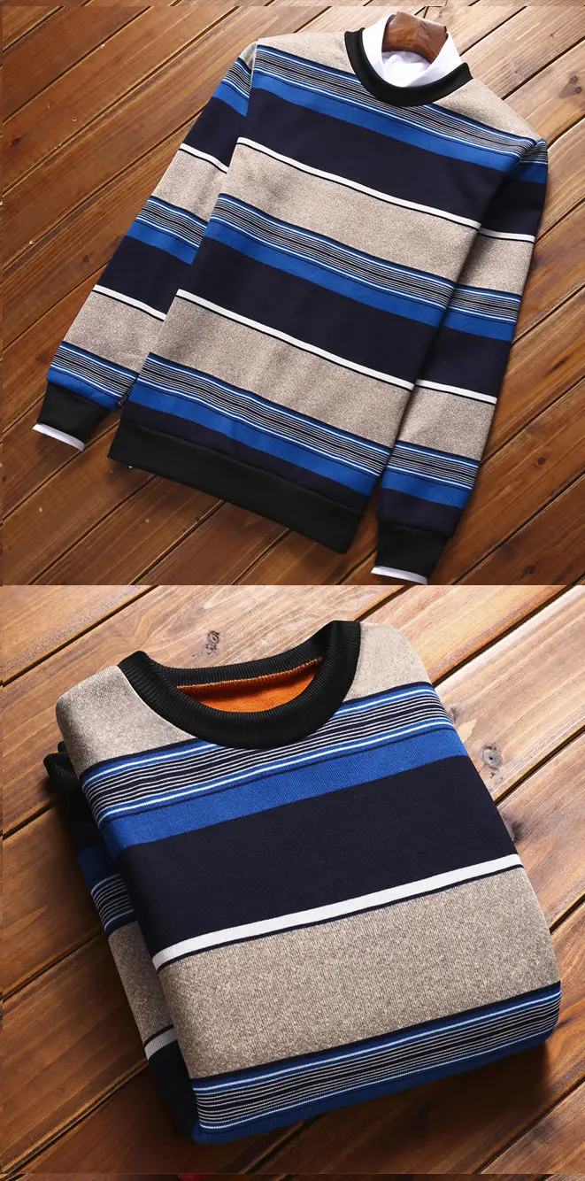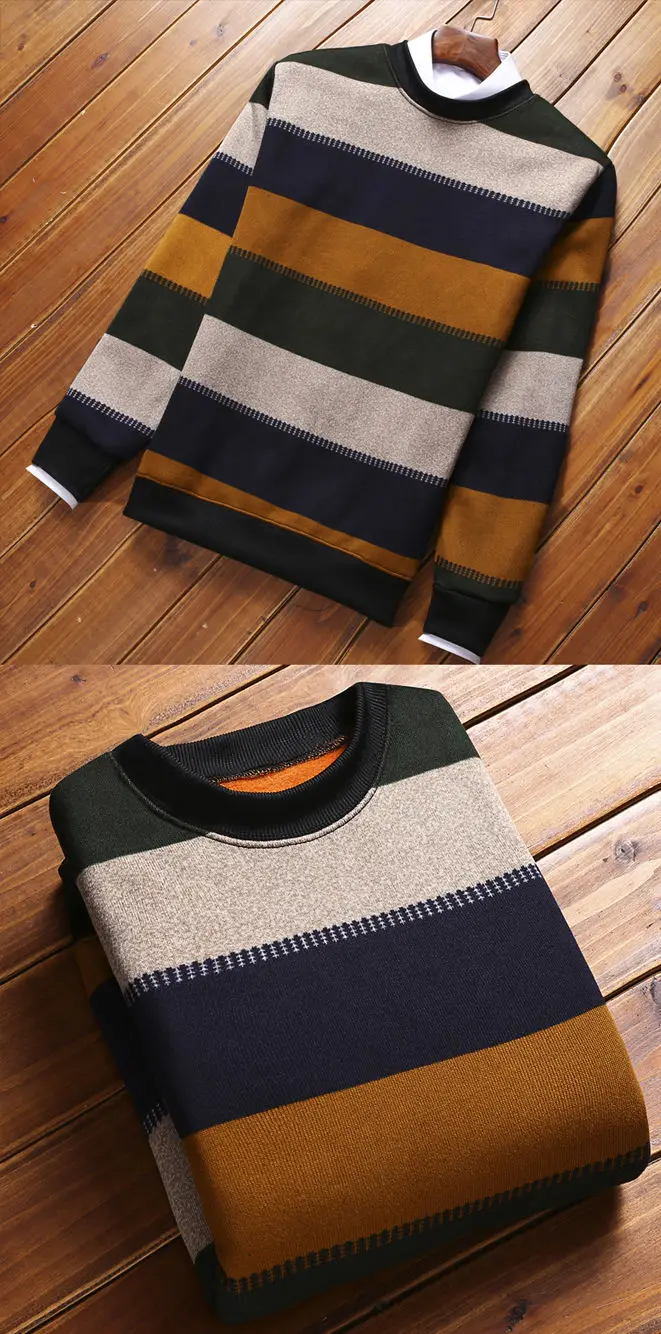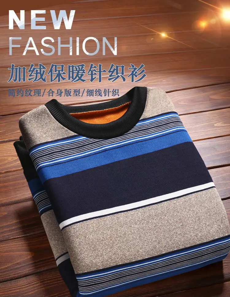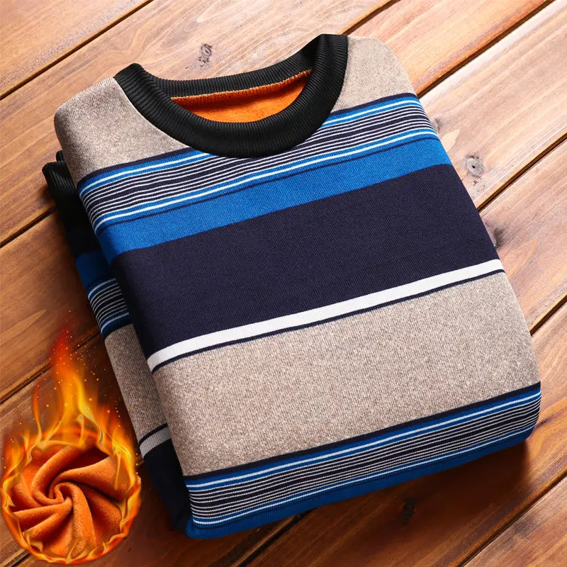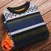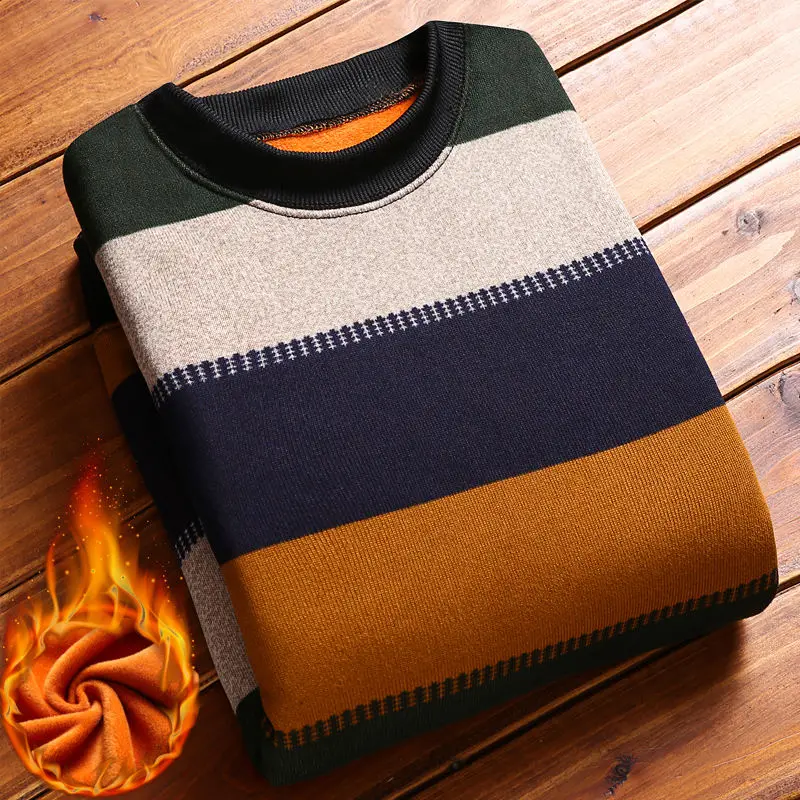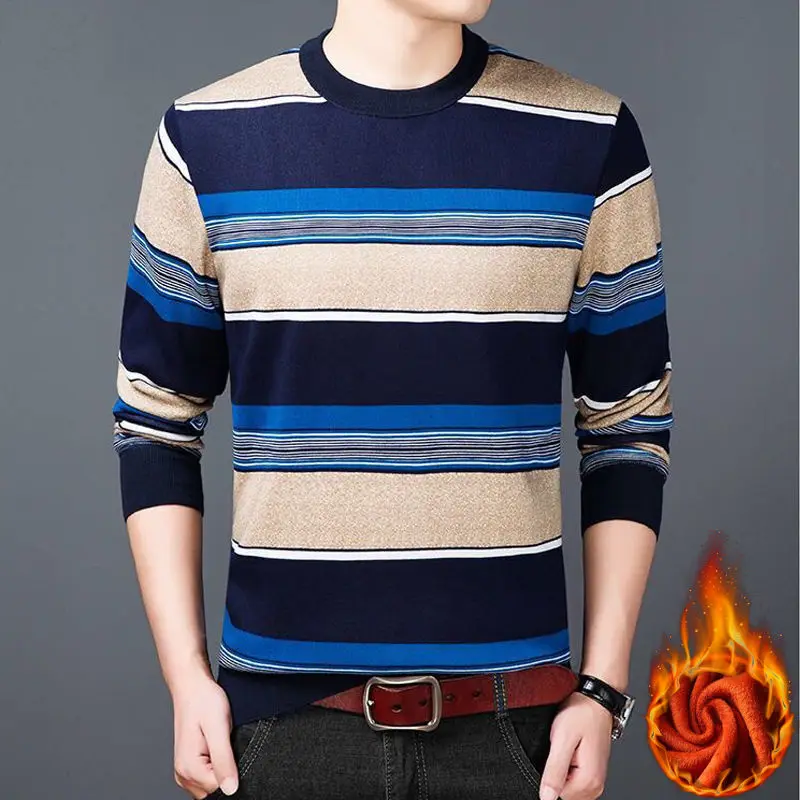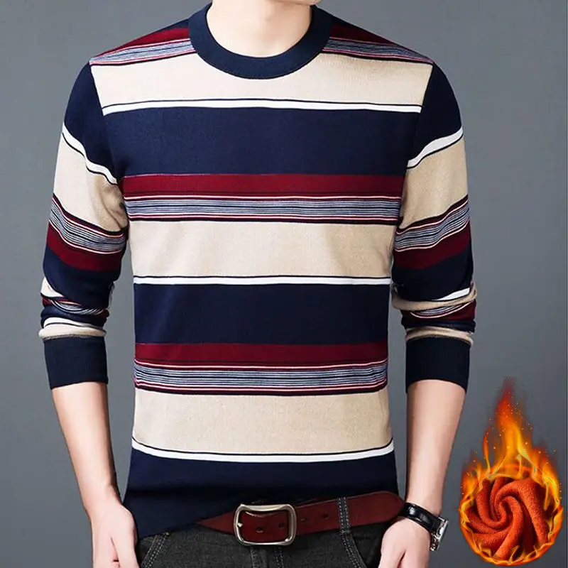 Man Fleece Sweater 2023 New Autumn Winter Fashion Stripe Warm Sweater Male Gold Velvet Thicken Sweater Winter O-Neck Knitwear