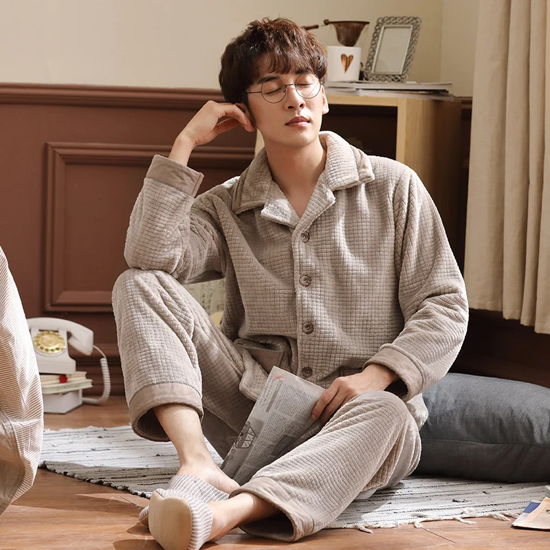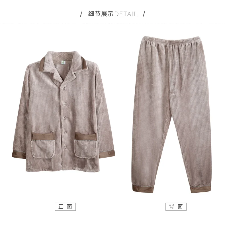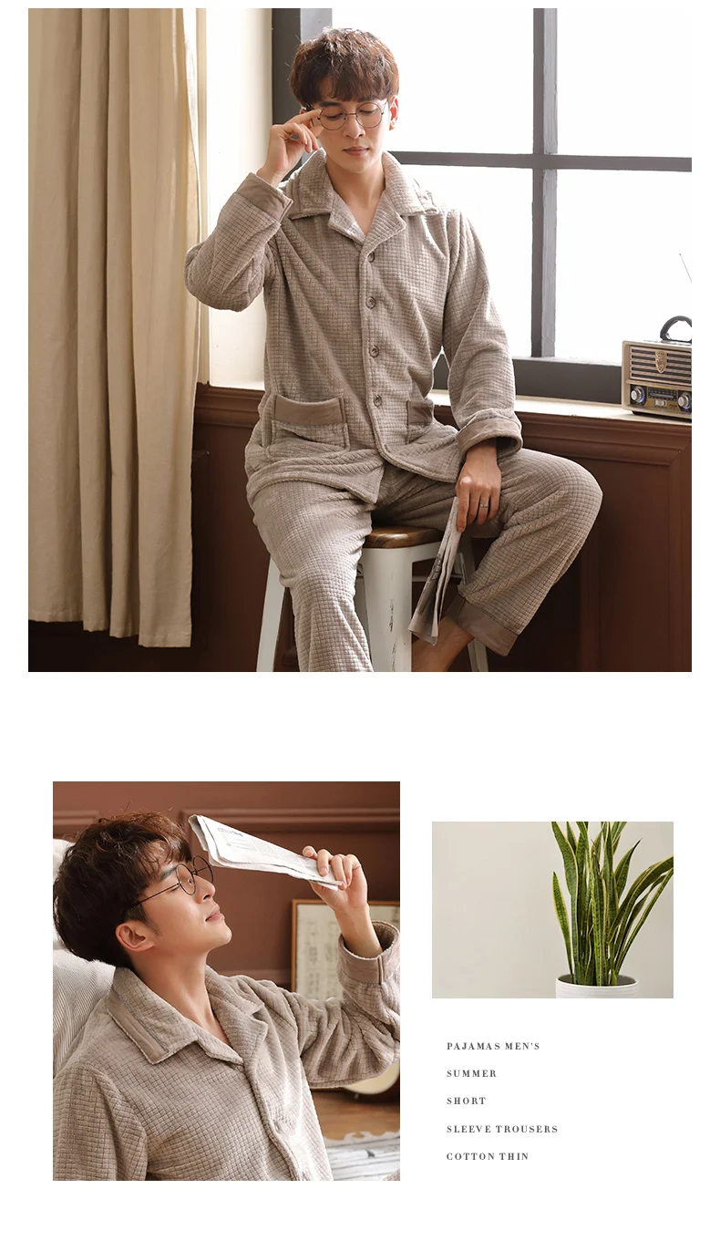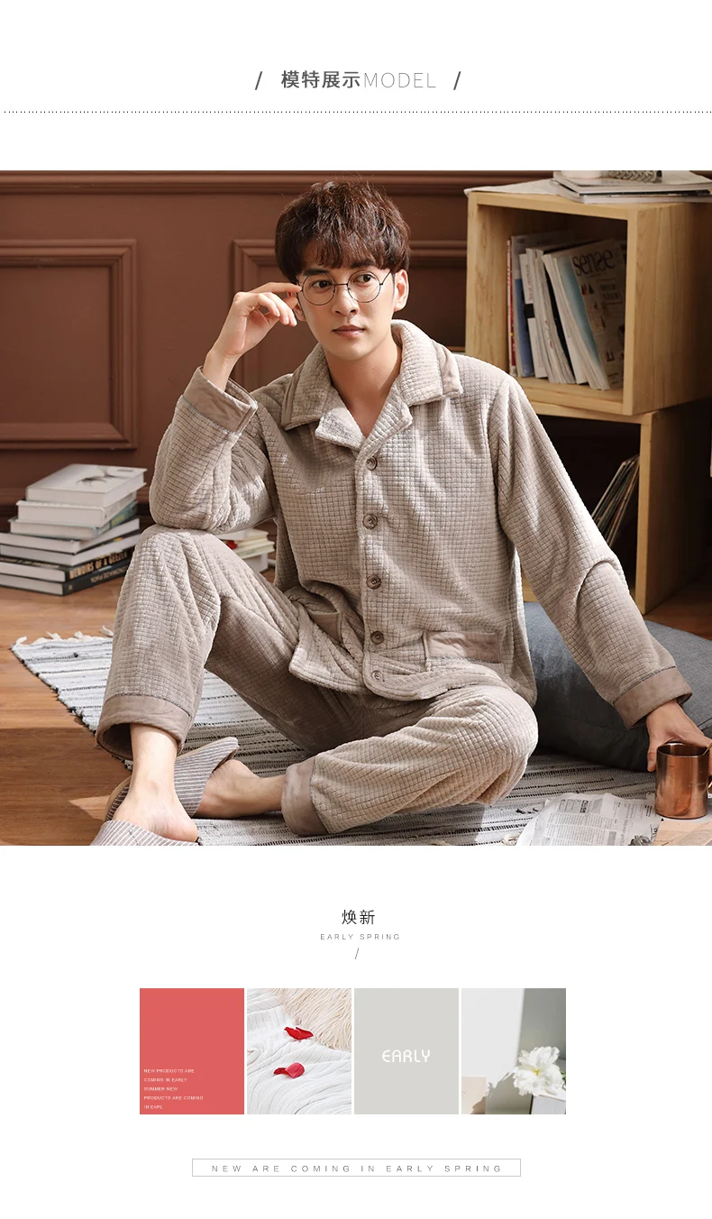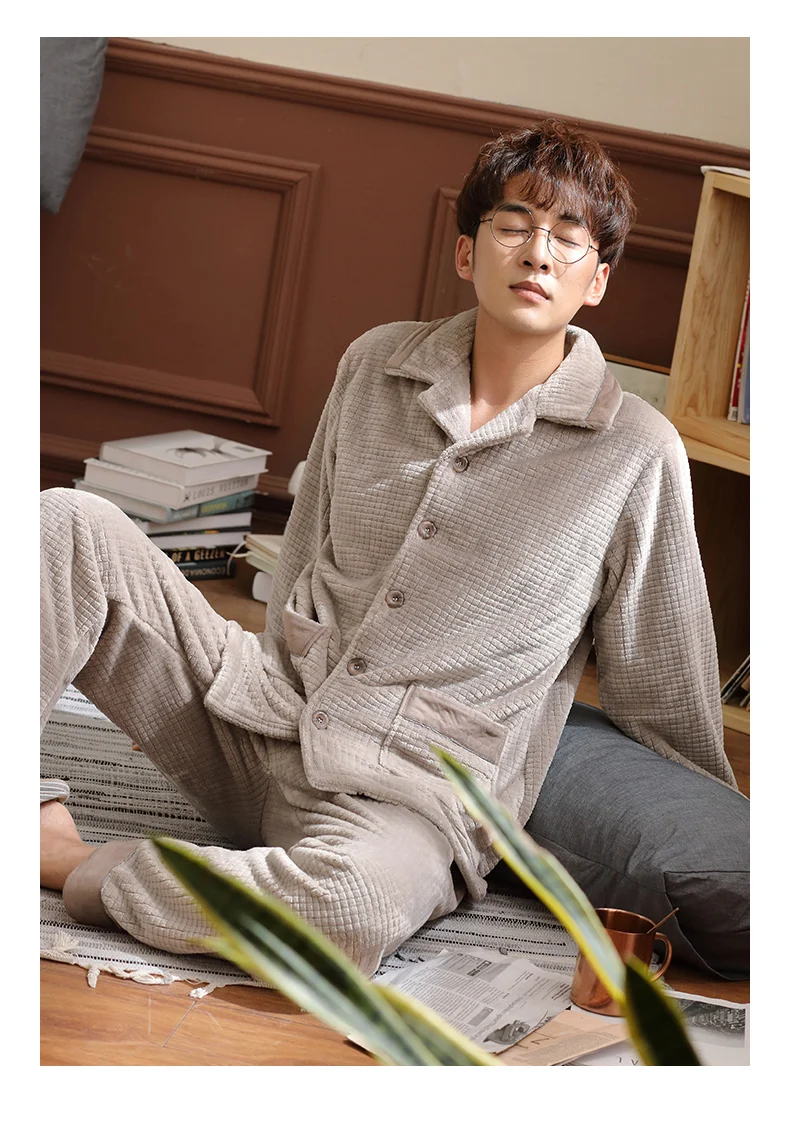 Men Cardigan Pajamas Set Warm Flannel Male Long-sleeved Autumn Winter Pyjama Loose Men Home Set Coral Fleece Sleepwear Top+ Pant