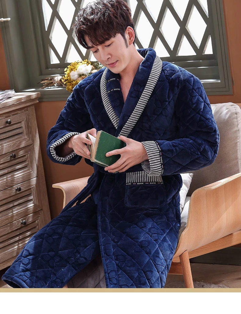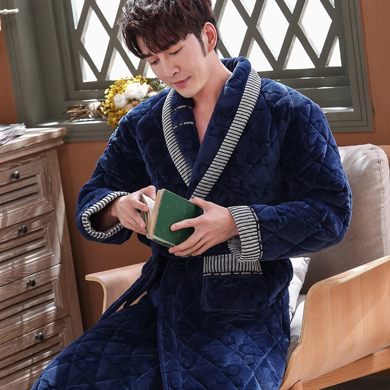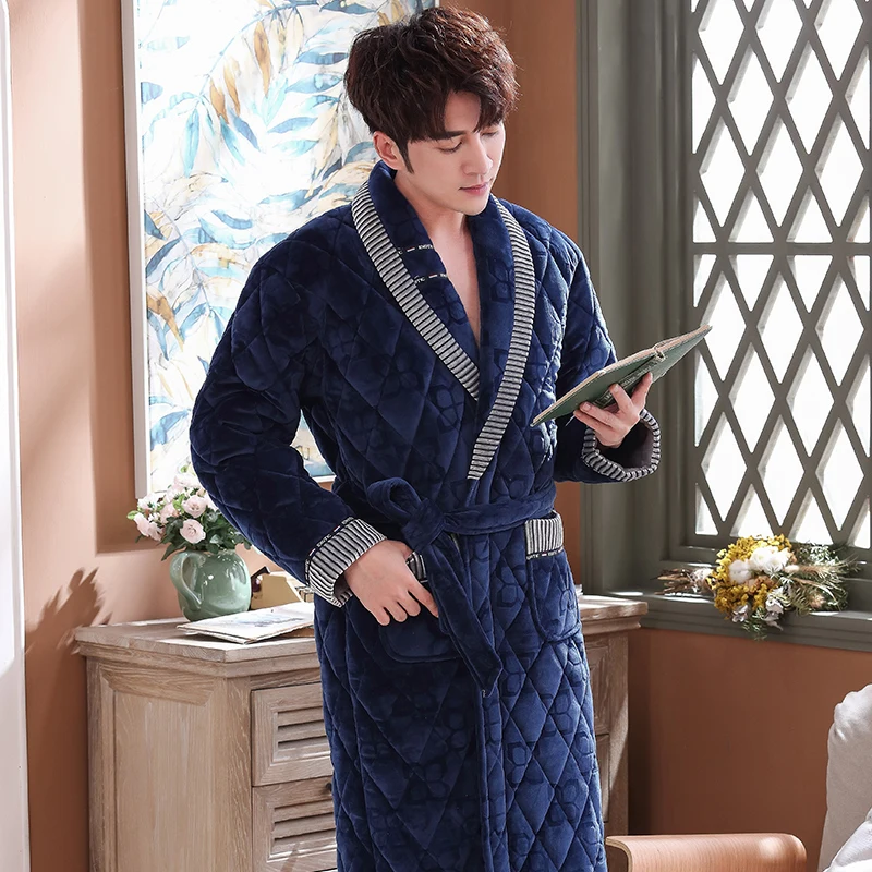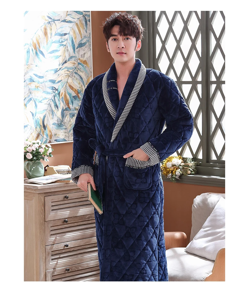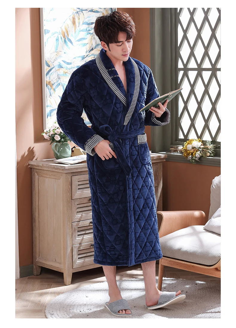 Men Casual Stripe Splicing Kimono Bathrobe Autumn Winter Flannel Quilted Long Robe Thick Warm Sleepwear Big Yards 3XL Nightgown